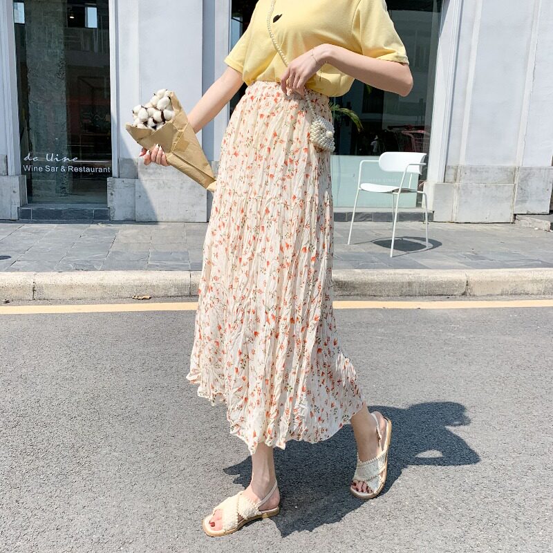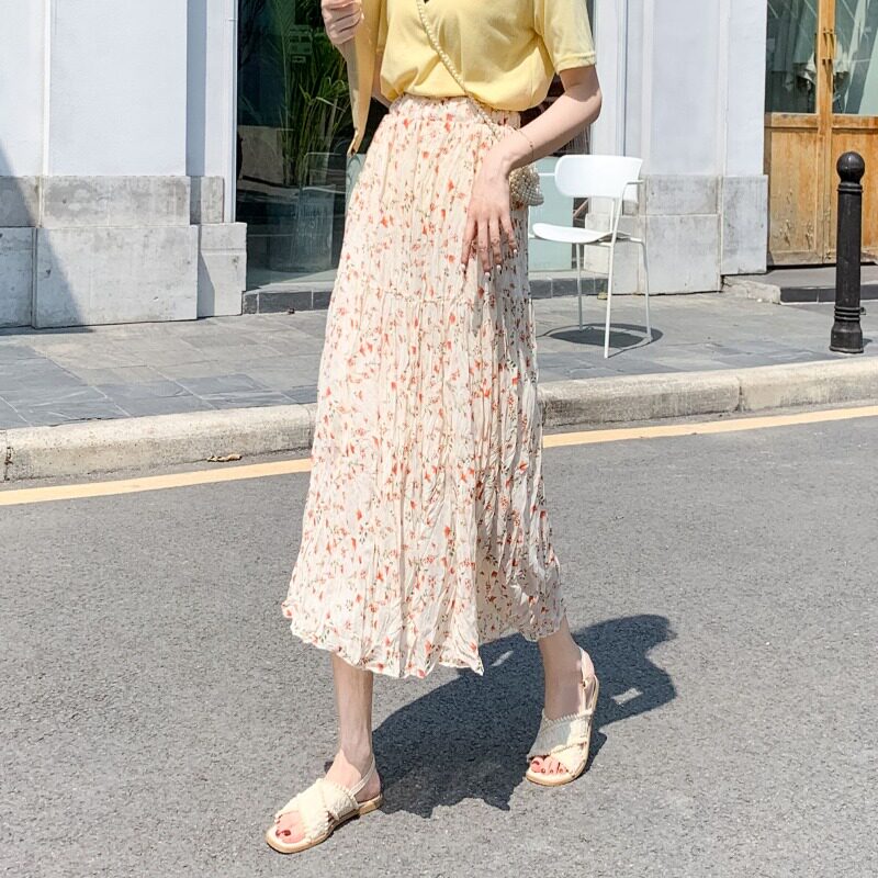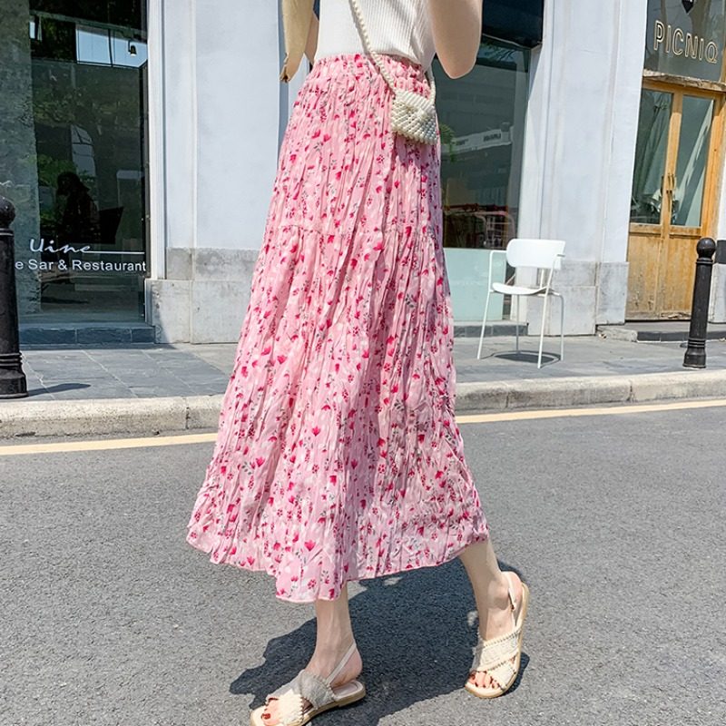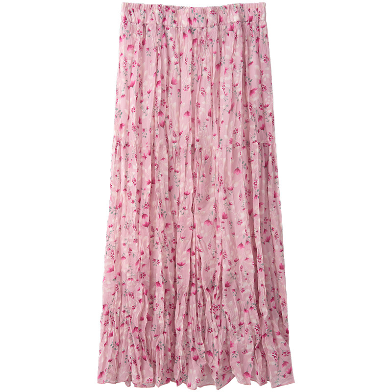 Летняя осенняя розовая шифоновая длинная юбка, 2024 года, цветочный принт, А-силуэт, высокая талия