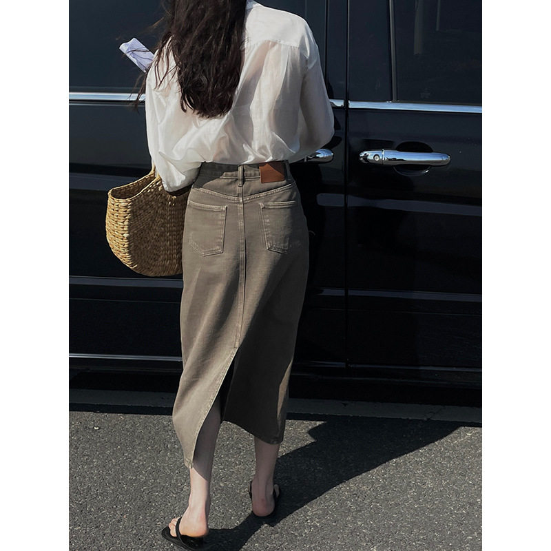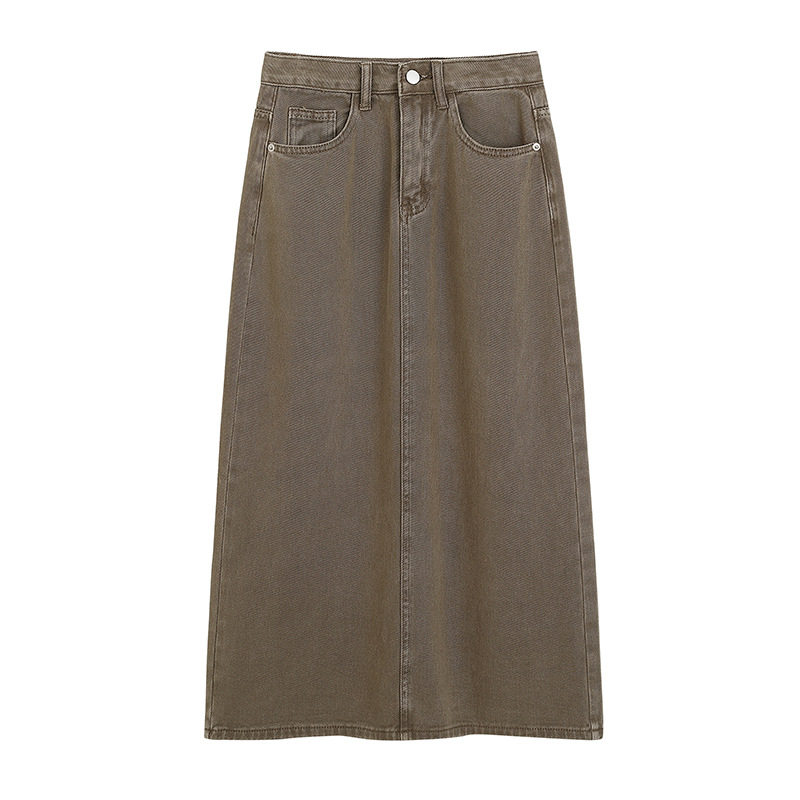 Хаки осенняя брендовая длинная джинсовая юбка, 2023, А-силуэт, длина макси, высокая талия