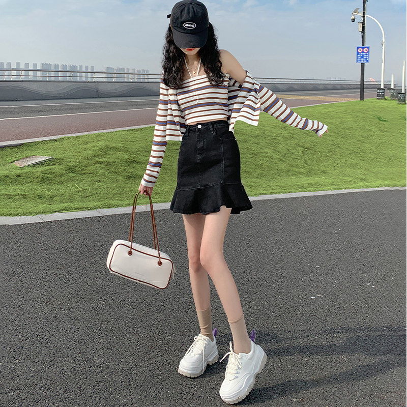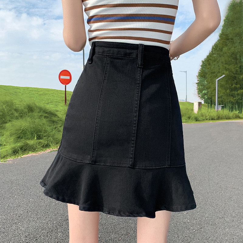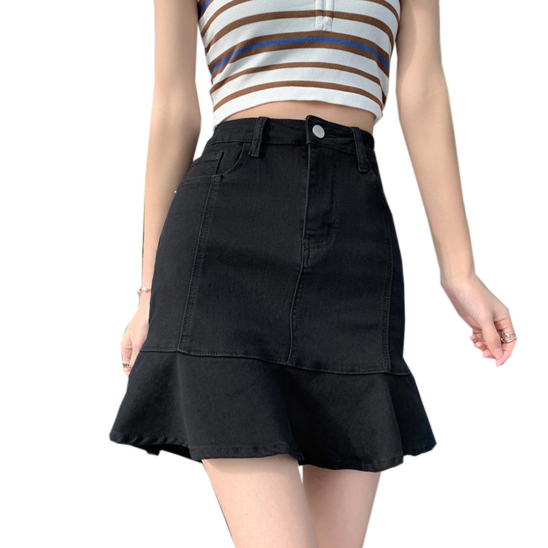 Черная летняя джинсовая юбка, крой «рыбий хвост», А-силуэт, с акцентом на бедрах, подходит для подростков