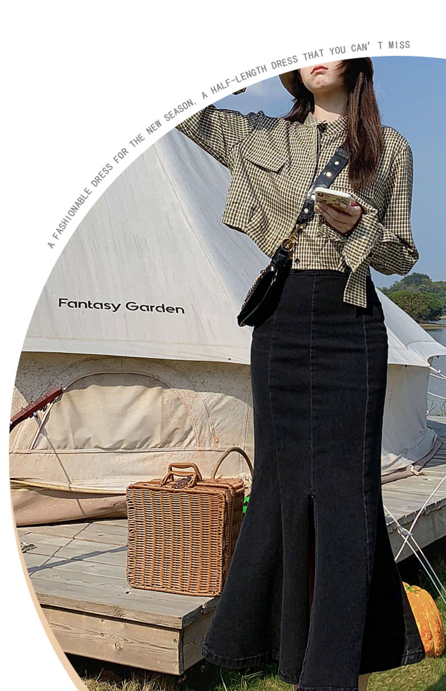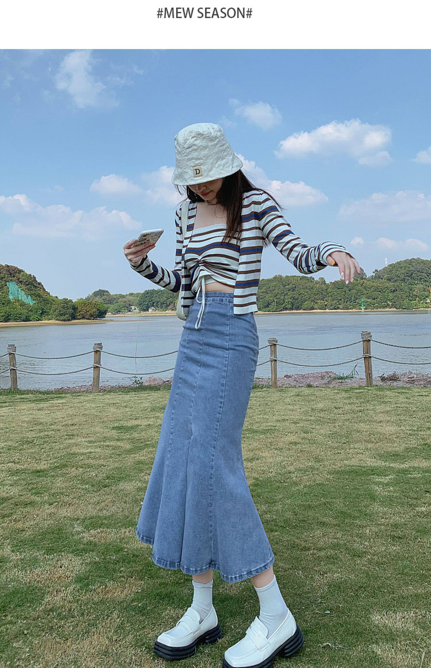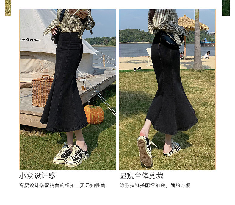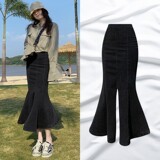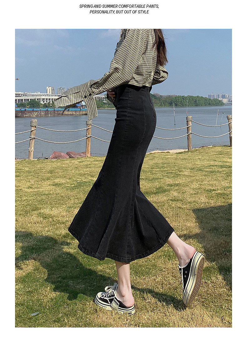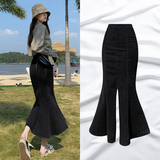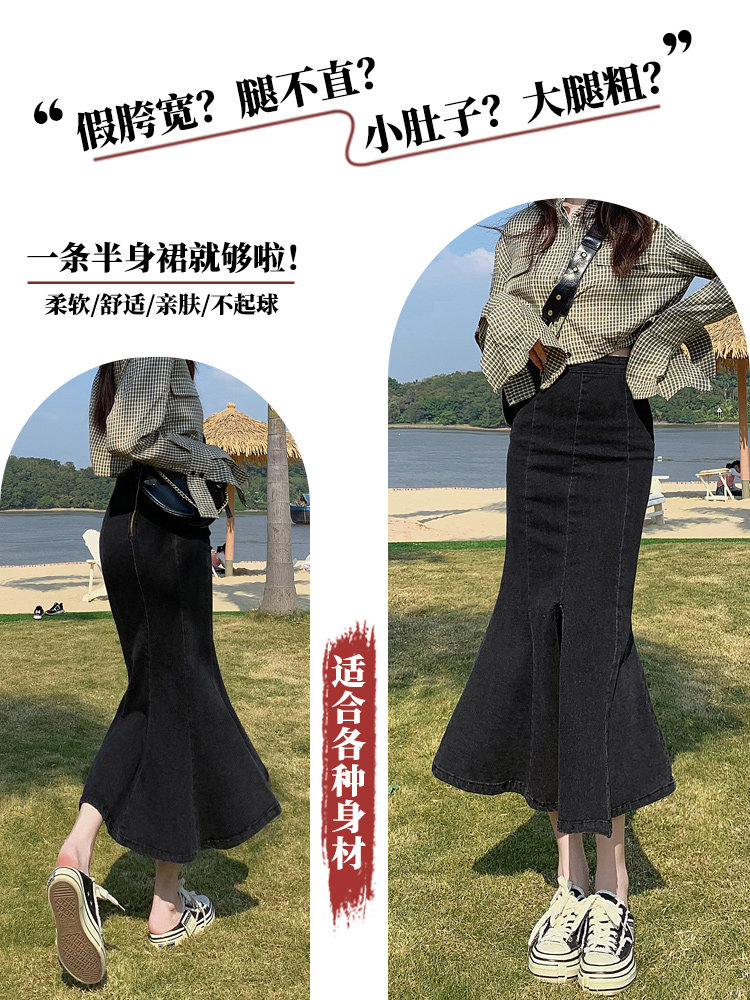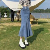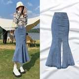 Длинная дизайнерская осенняя джинсовая юбка, высокая талия, тренд сезона, коллекция 2023, с акцентом на бедрах, рыбий хвост