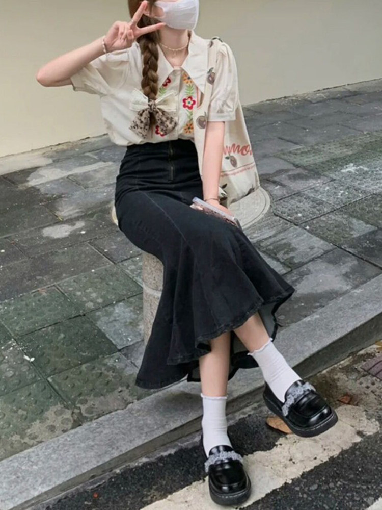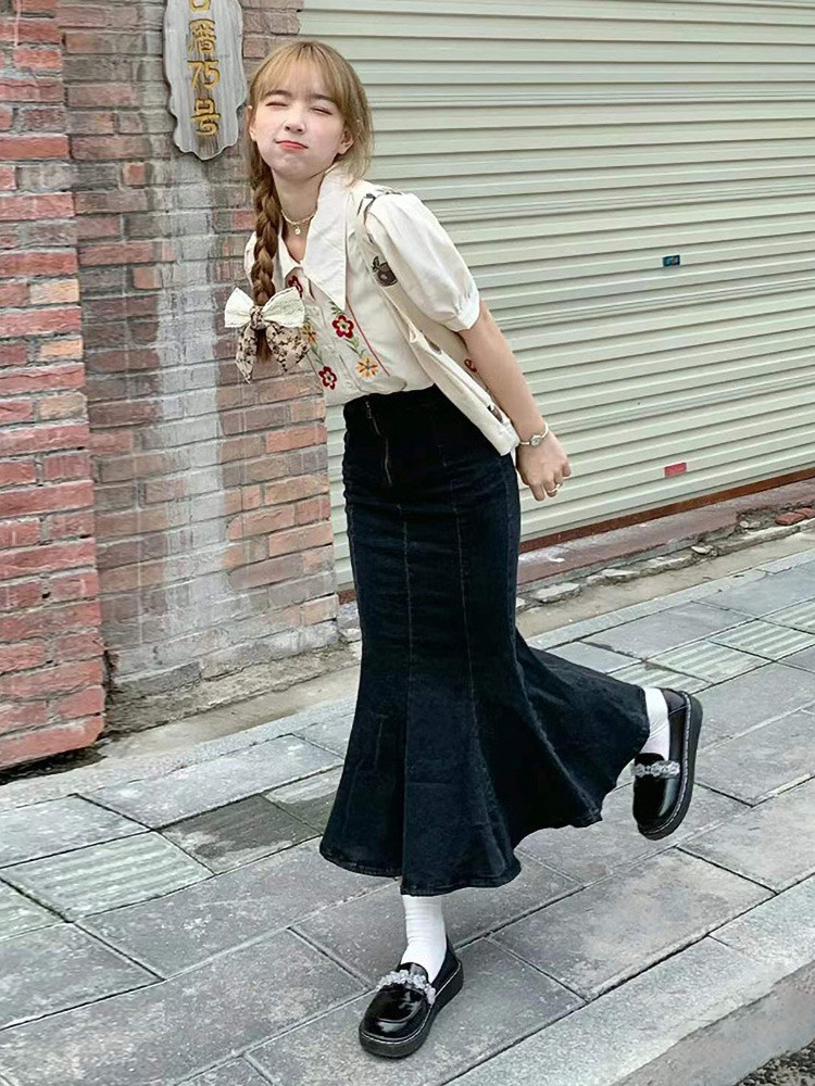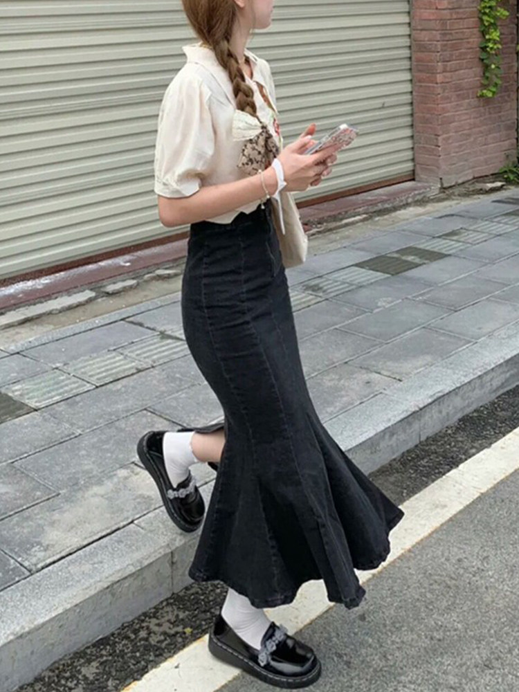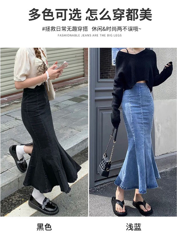 Джинсовая летняя эластичная длинная черная юбка, рыбий хвост, высокая талия, средней длины, с акцентом на бедрах