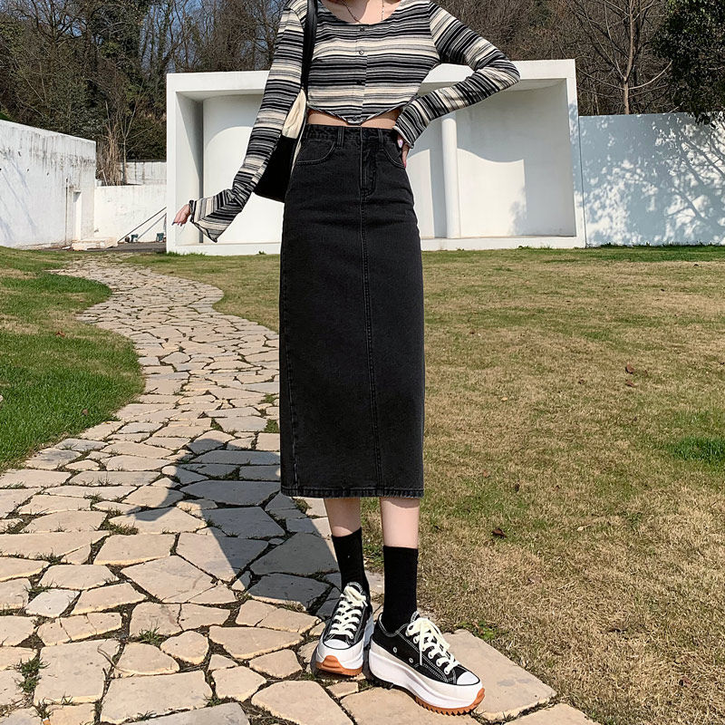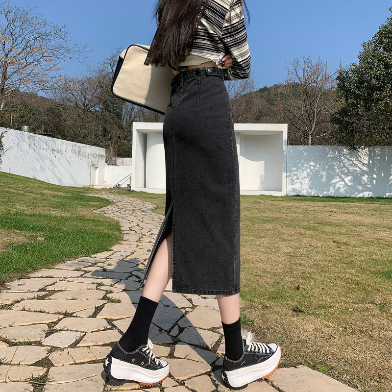 Цветная весенняя джинсовая юбка, длинная длинная юбка, высокая талия, А-силуэт, длина макси, с акцентом на бедрах
