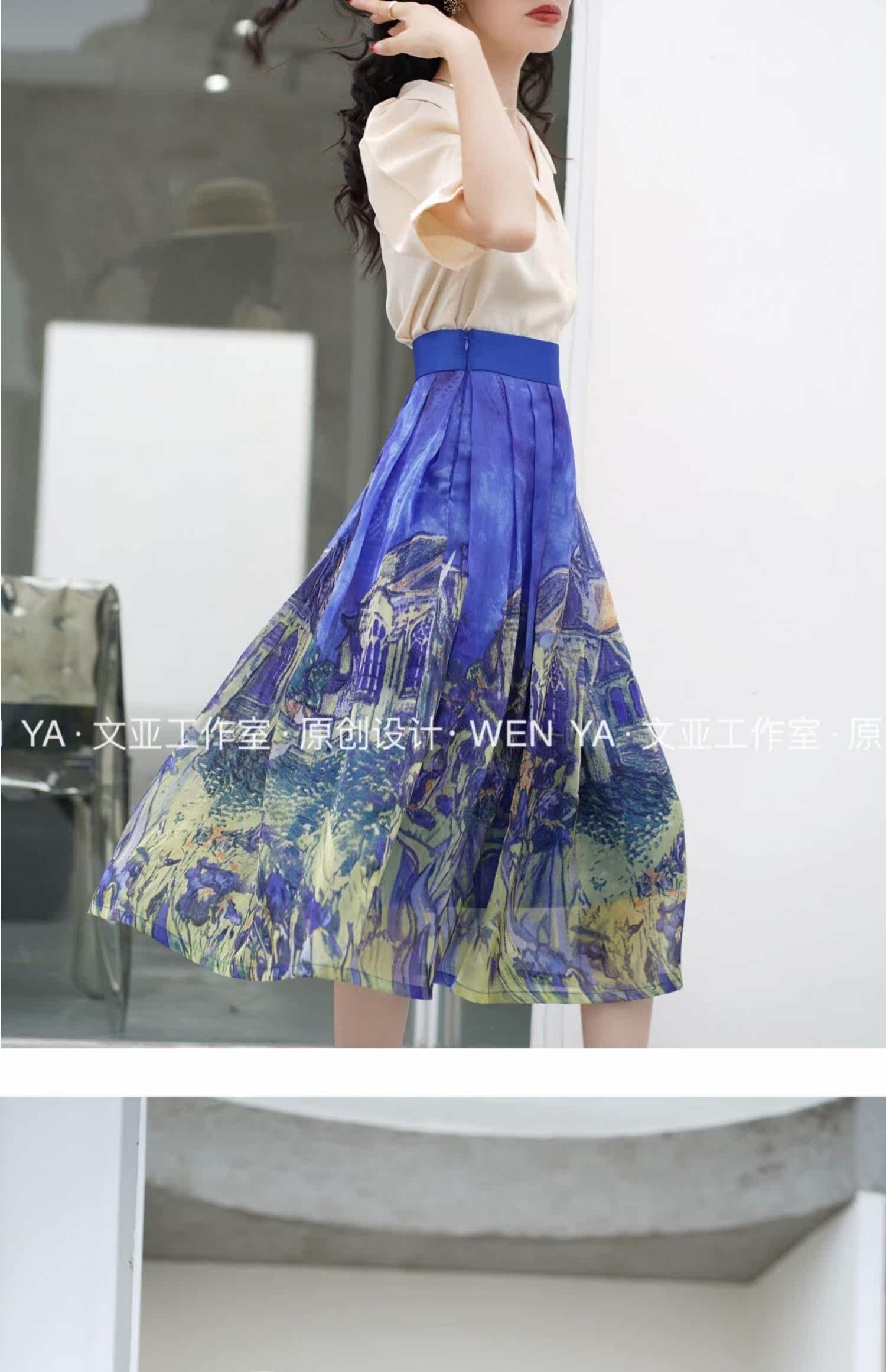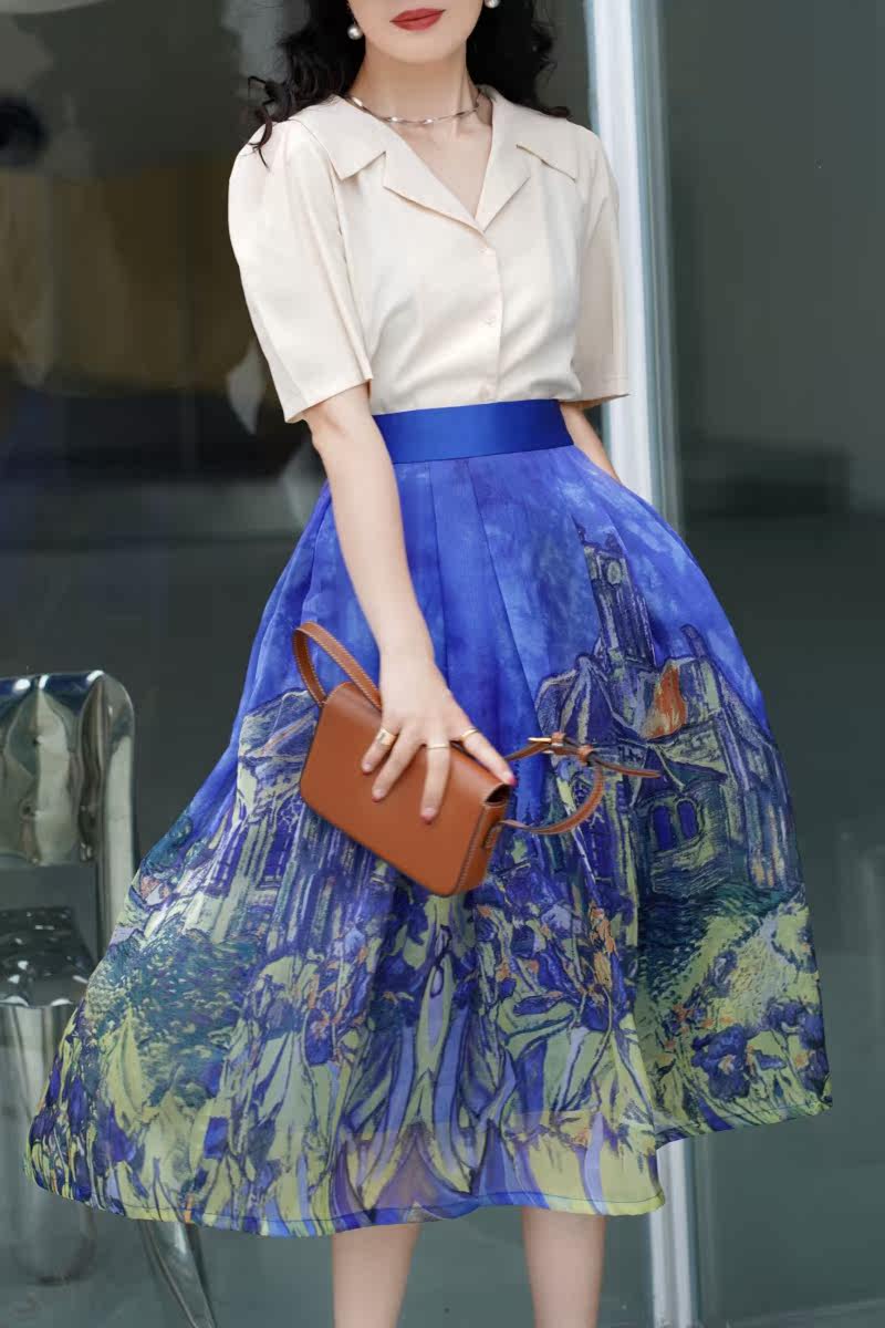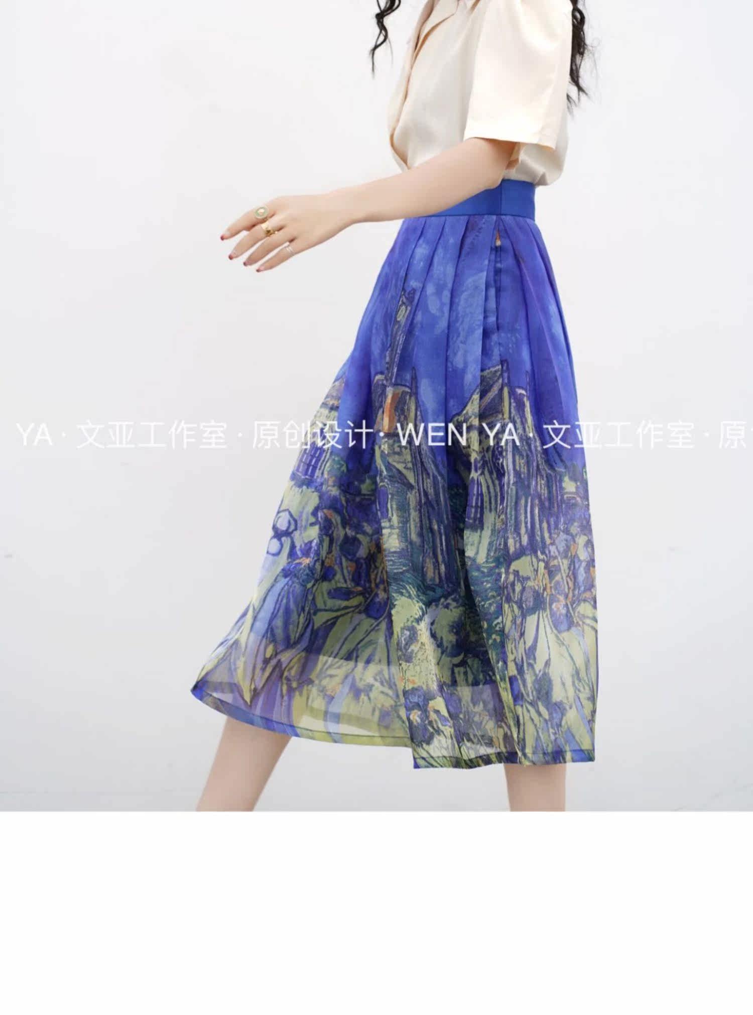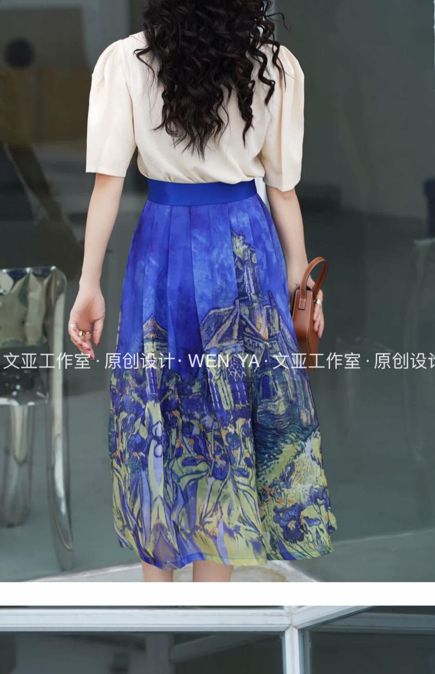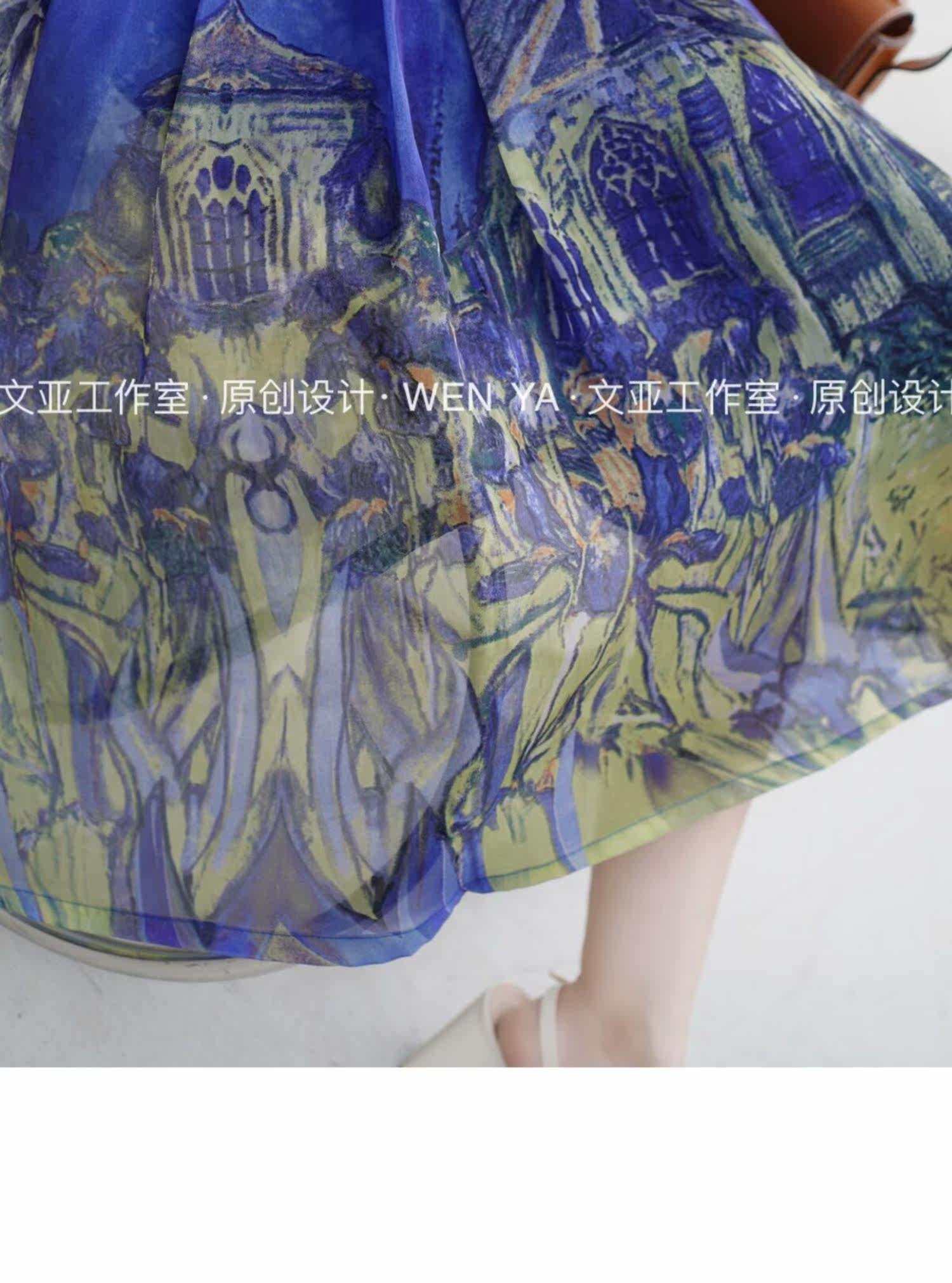 Wenya Hand -Painted Древнее замки синяя пухлая юбка