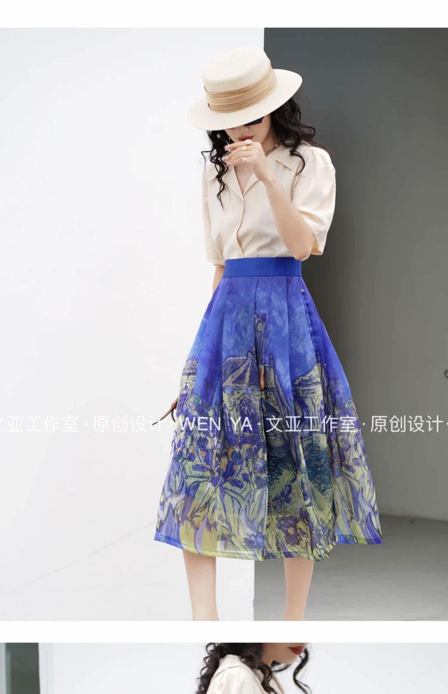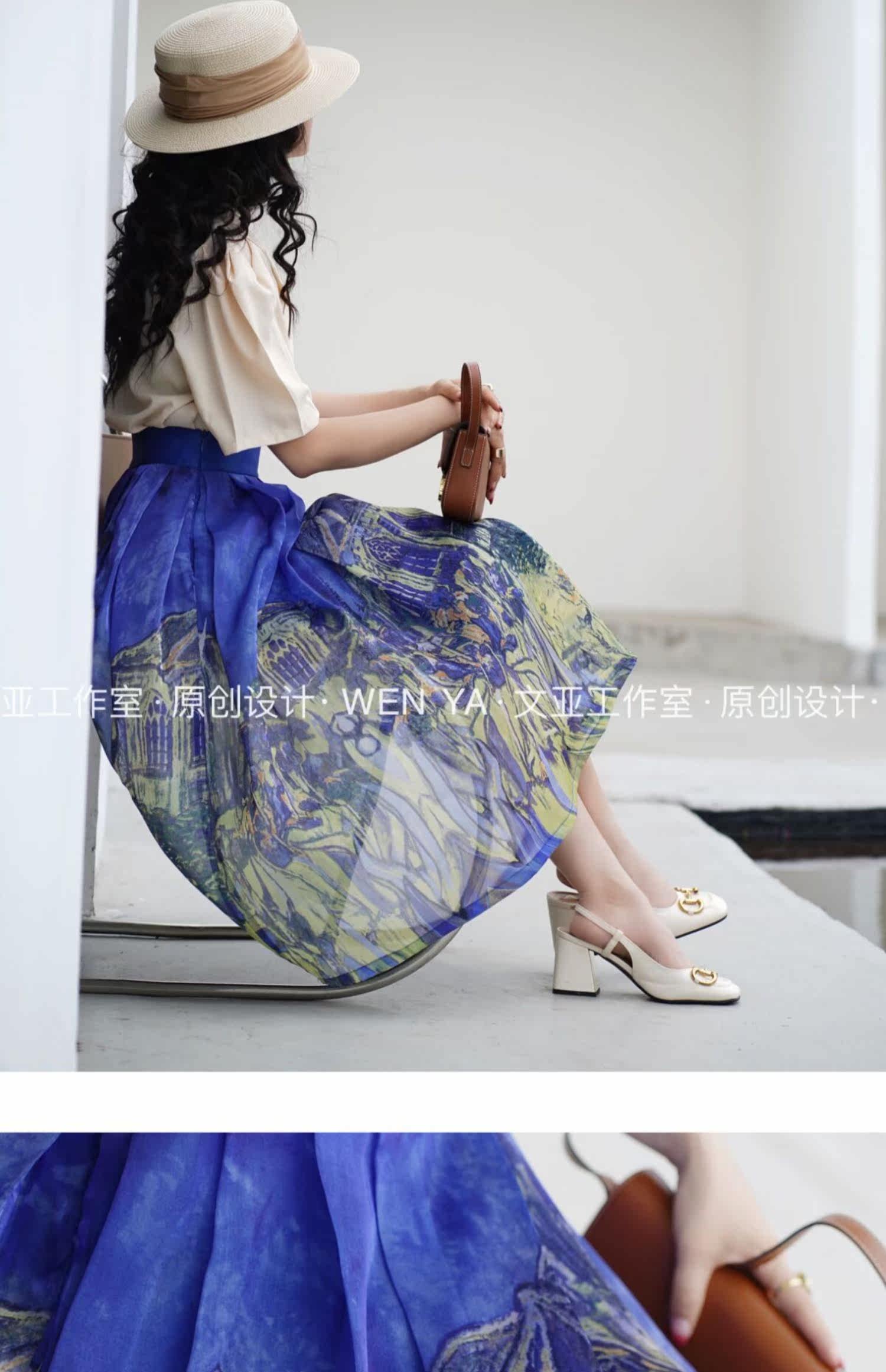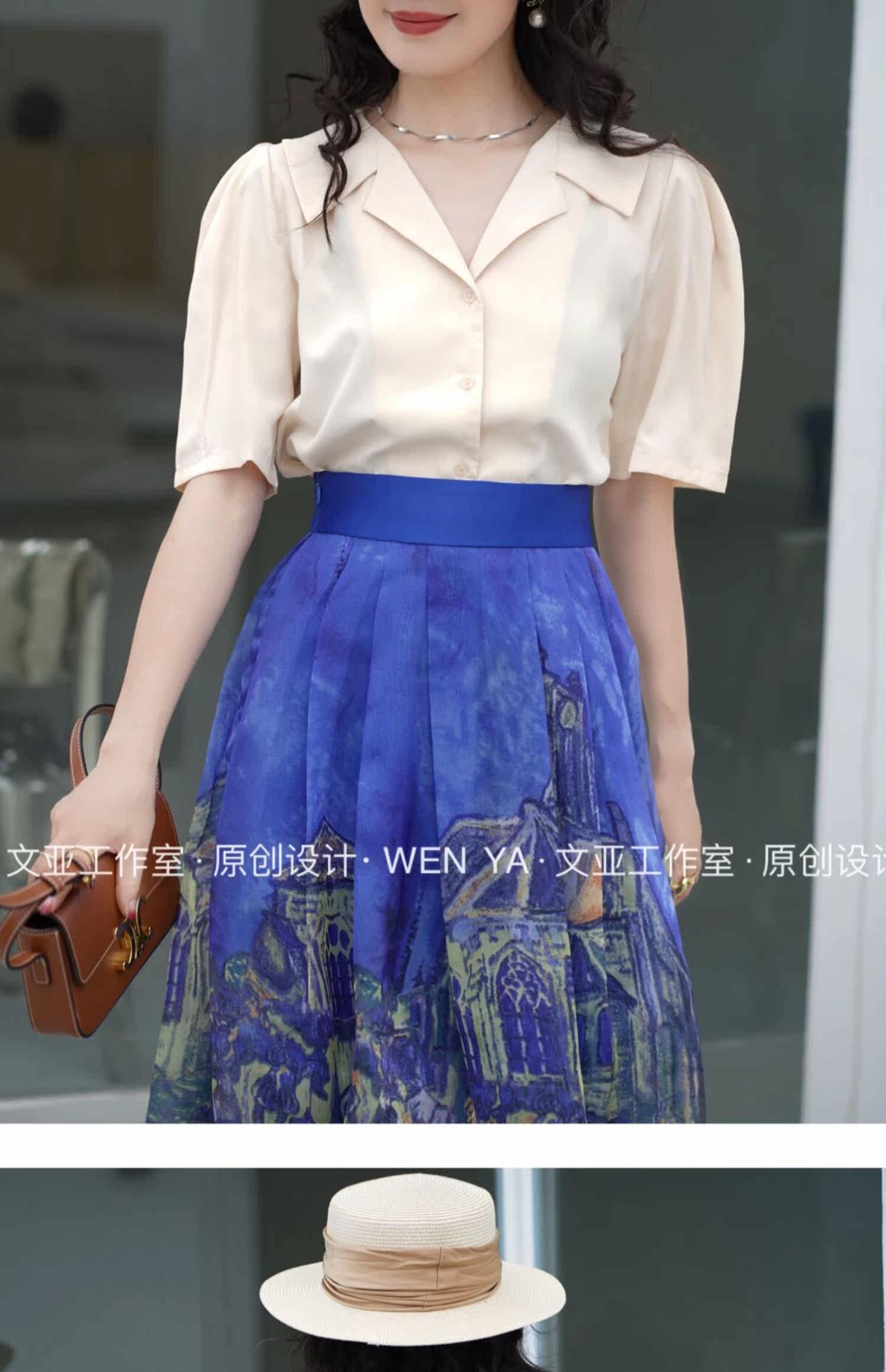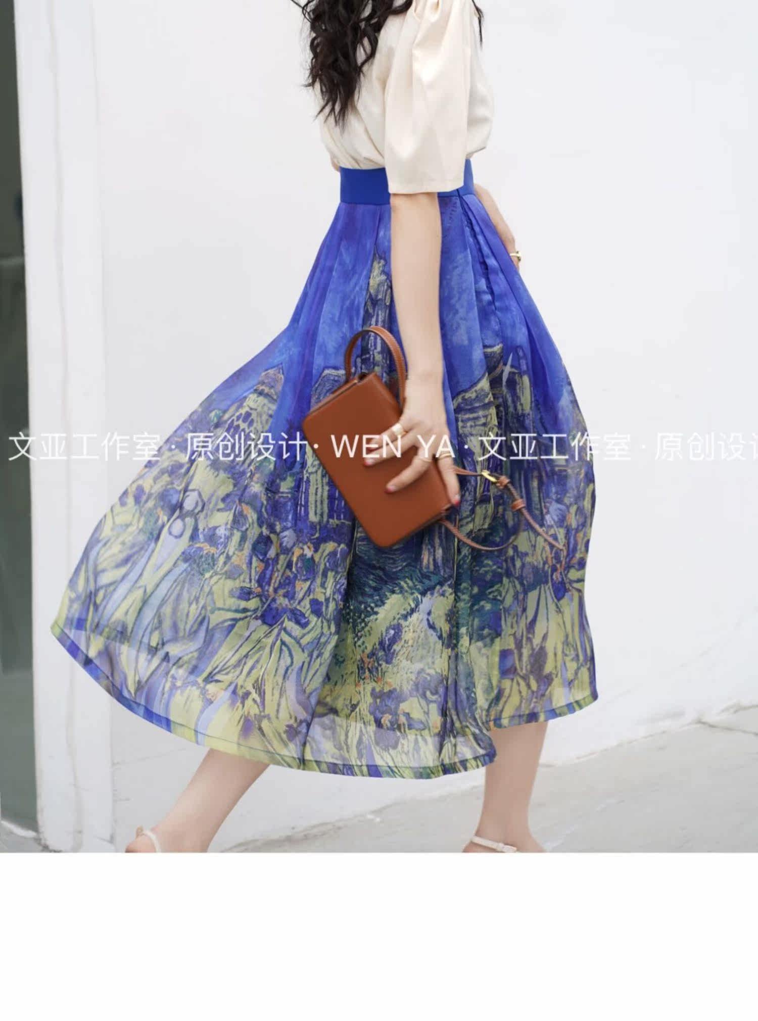 Wenya Hand -Painted Древнее замки синяя пухлая юбка