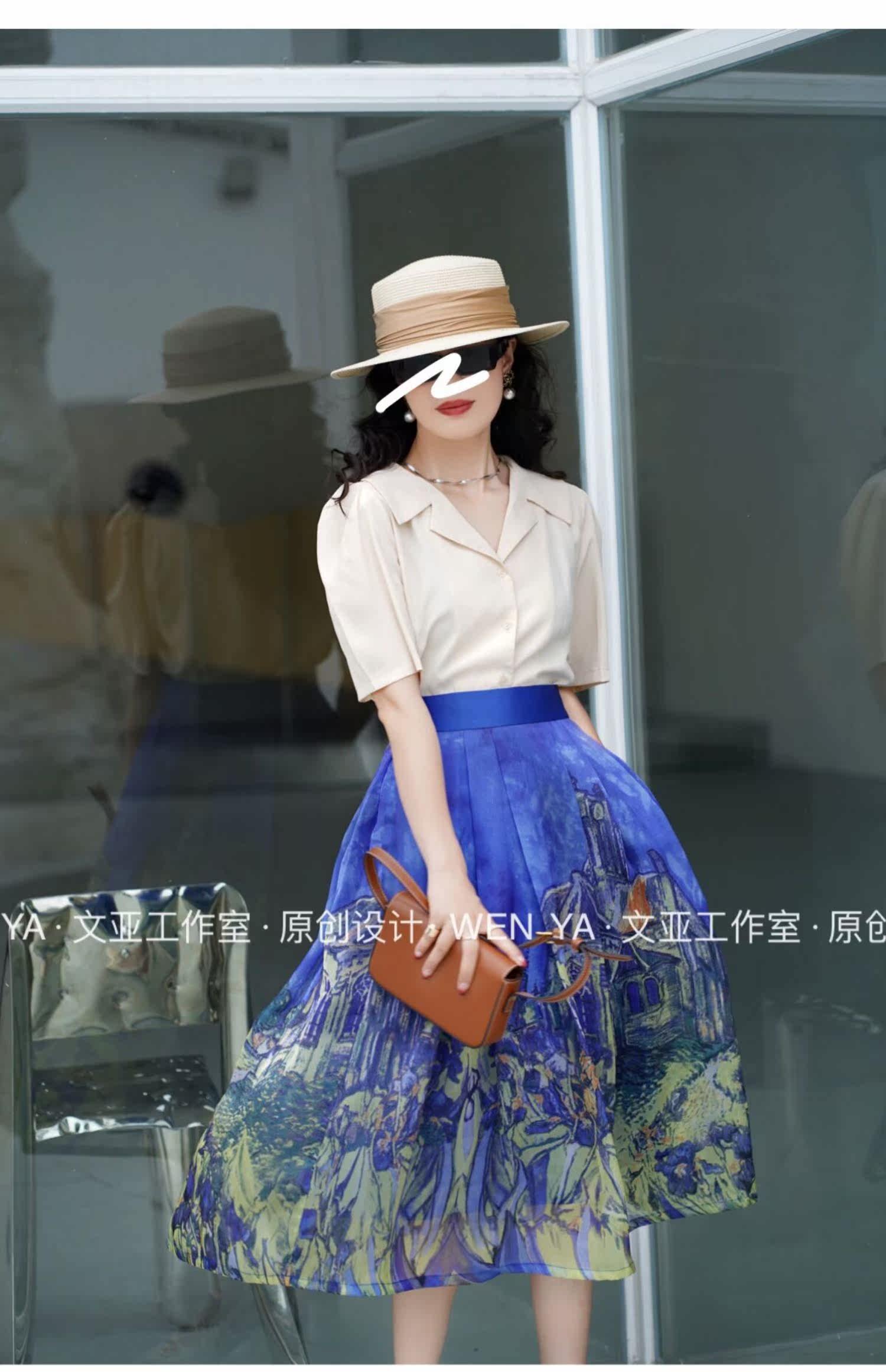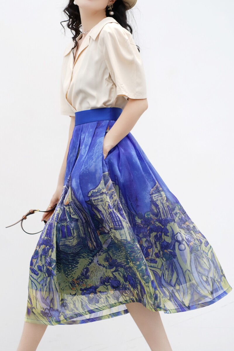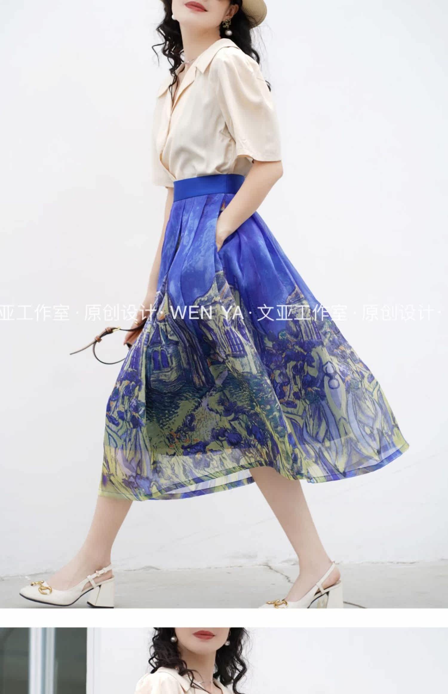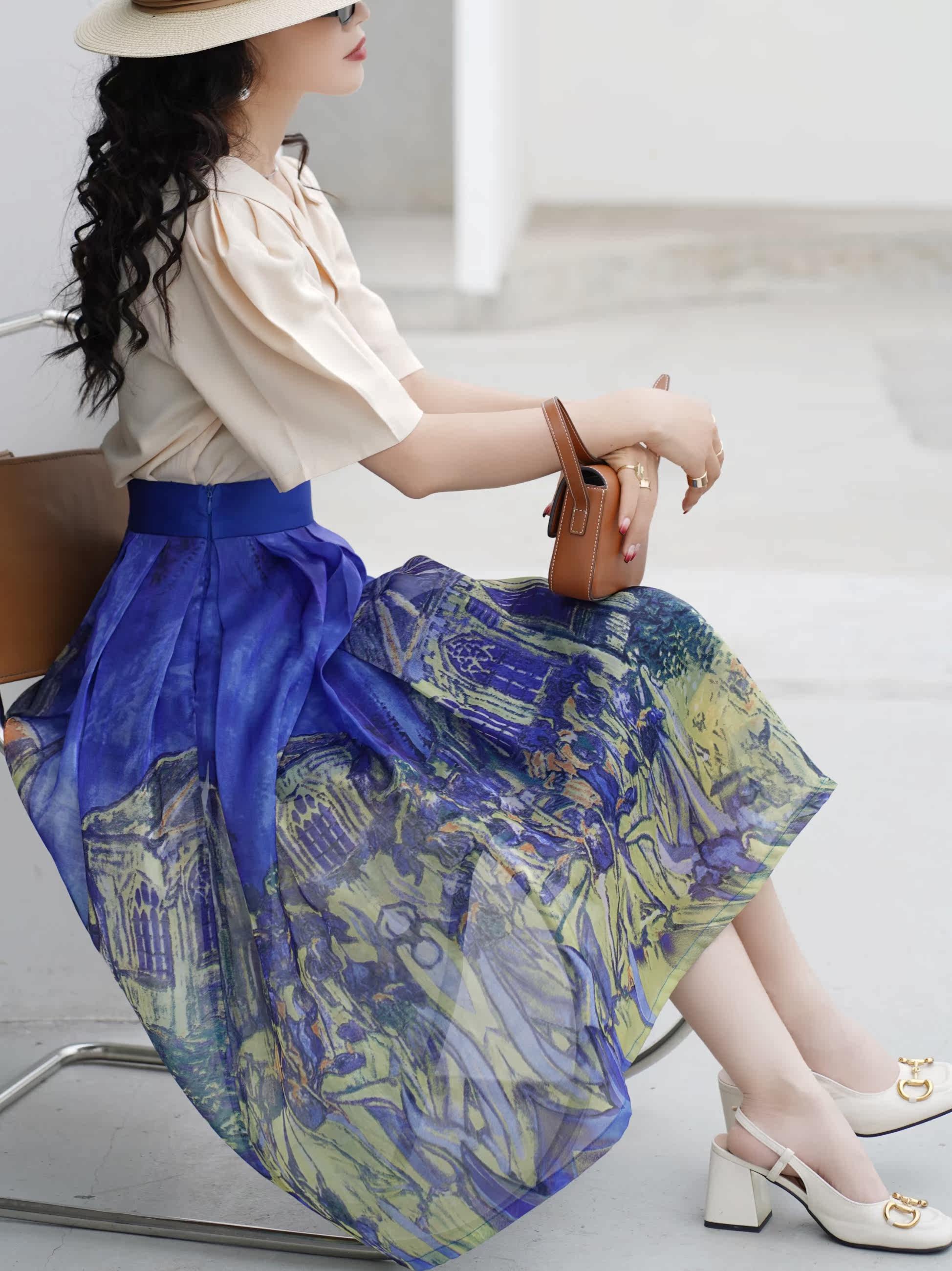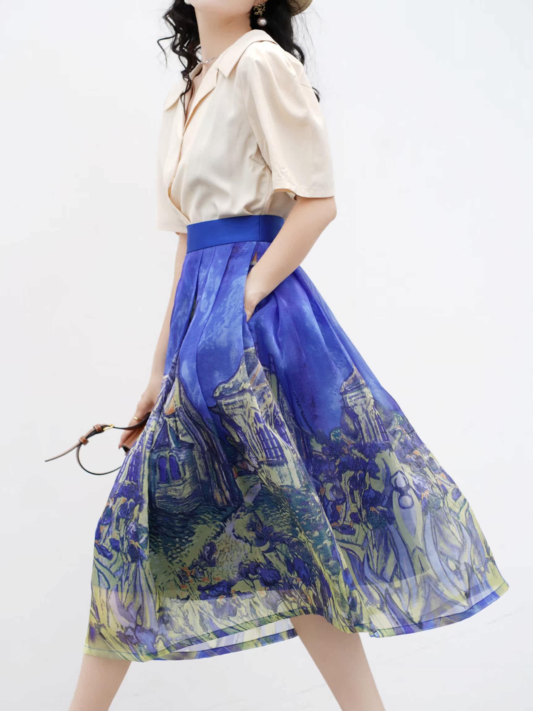 Wenya Hand -Painted Древнее замки синяя пухлая юбка
