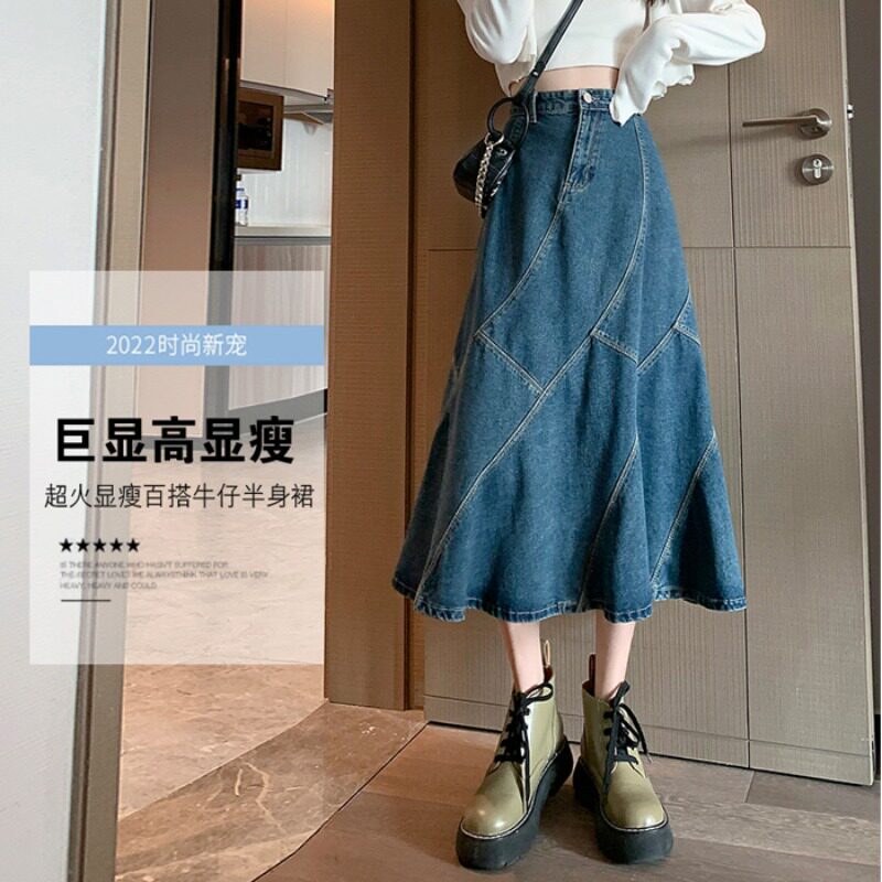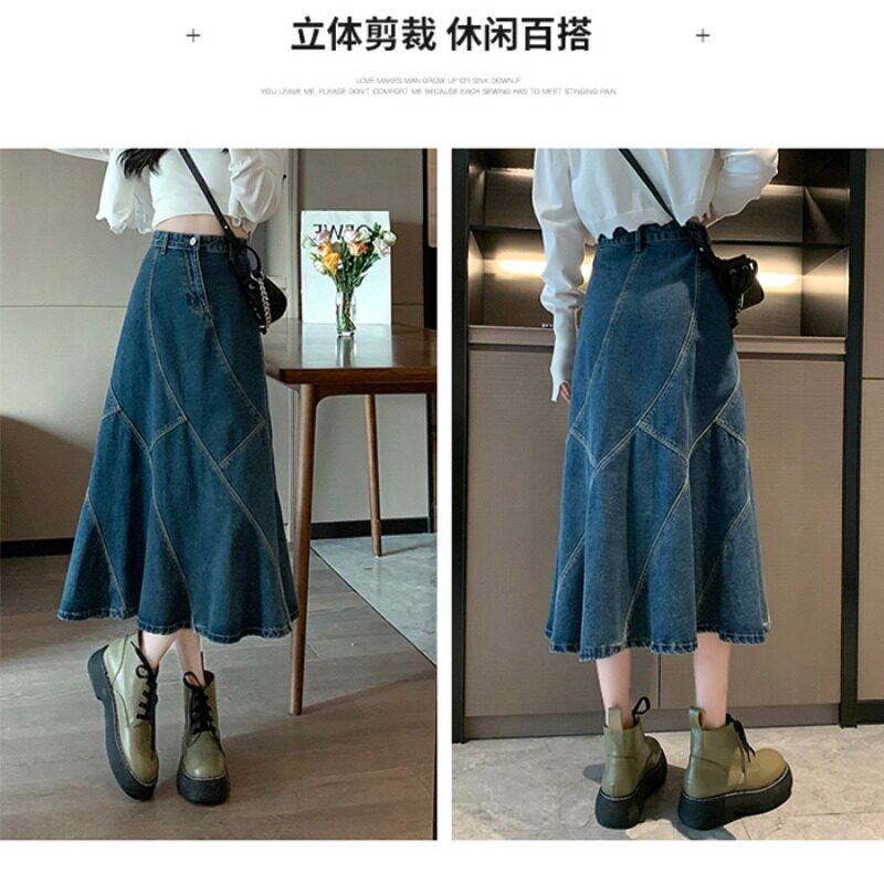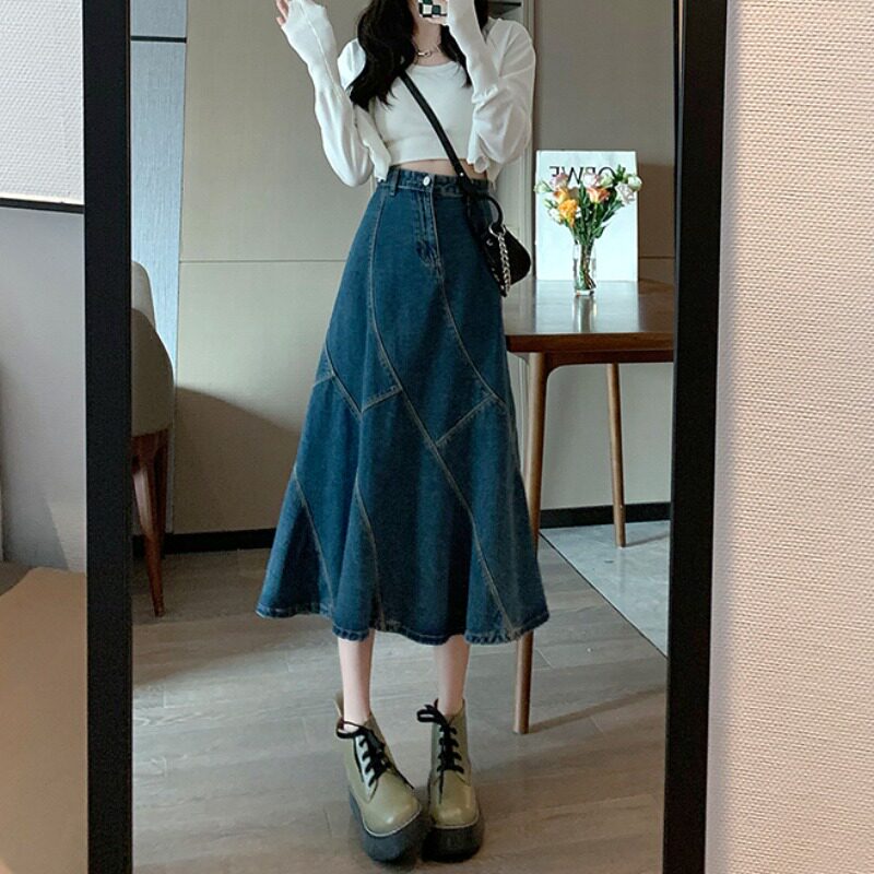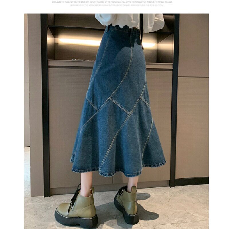 Ретро дизайнерская летняя длинная джинсовая юбка, высокая талия, тренд сезона, средней длины, А-силуэт, рыбий хвост