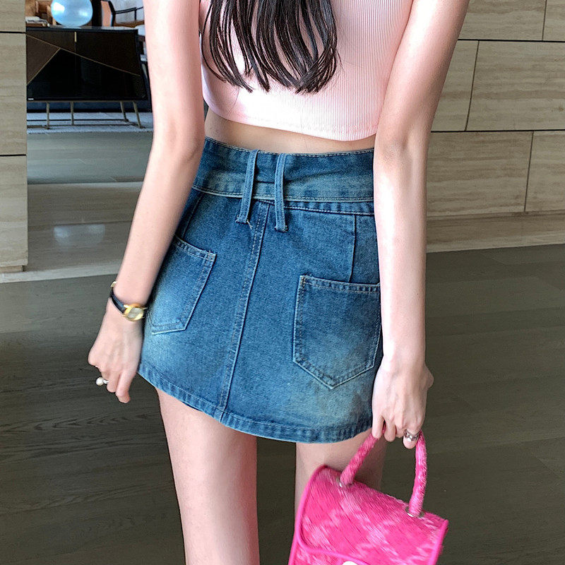 Летняя небольшая джинсовая юбка, дизайнерская мини-юбка, высокая талия, тренд сезона, с акцентом на бедрах, А-силуэт