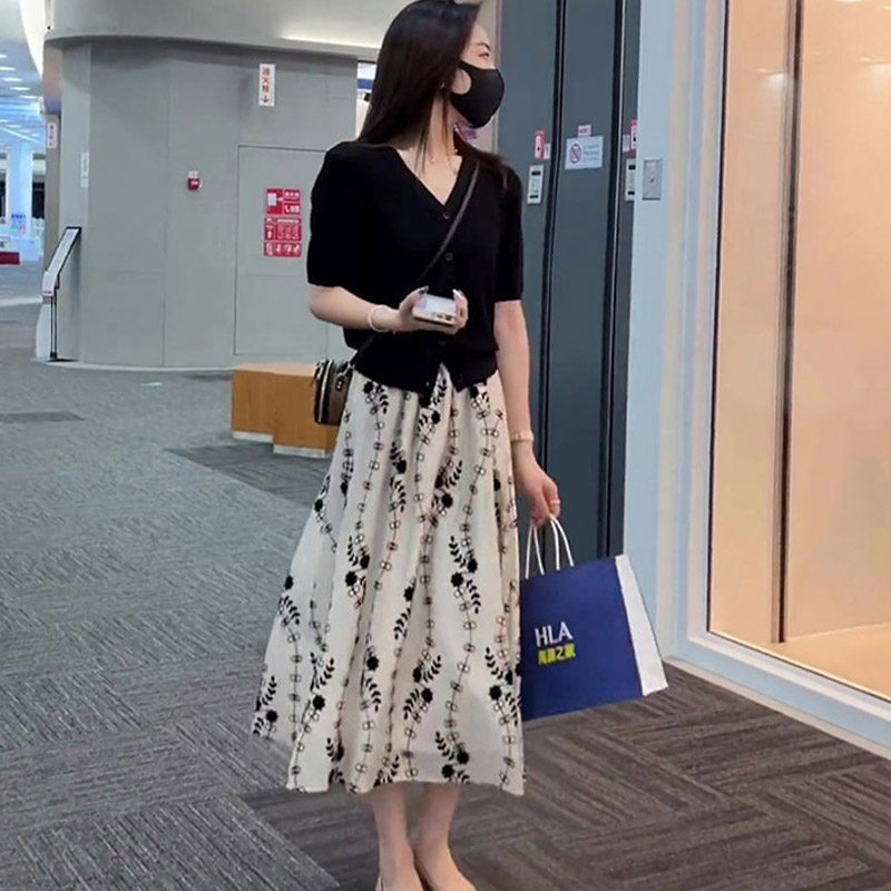 Шелковая летняя юбка для отдыха, универсальный трикотажный комплект, высокая талия, в западном стиле, короткий рукав