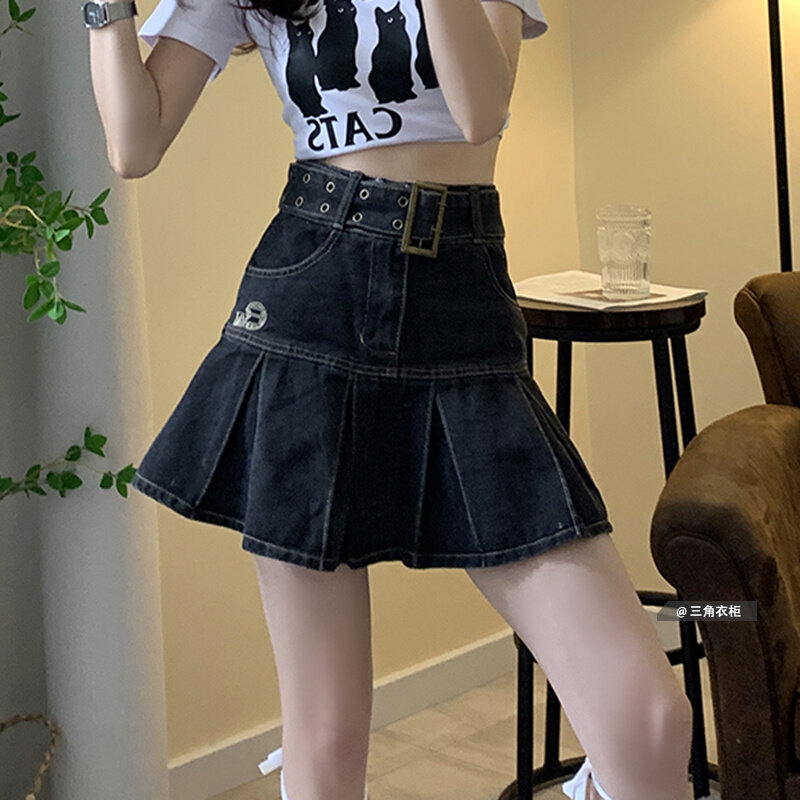 Летняя джинсовая юбка, юбка в складку, с вышивкой, А-силуэт, высокая талия