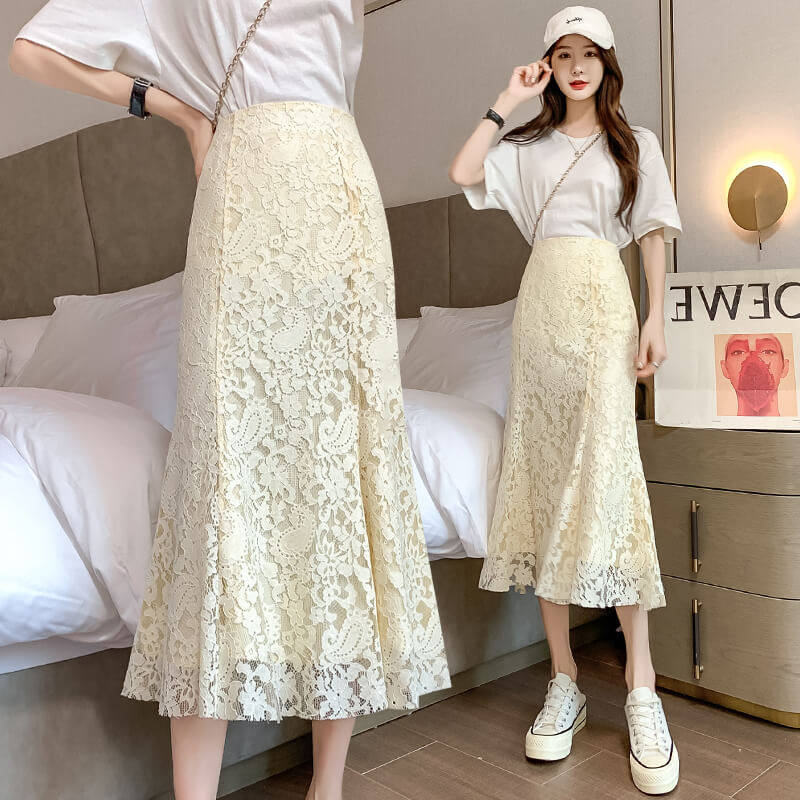Кружевная длинная юбка, рыбий хвост, высокая талия, средней длины, с акцентом на бедрах, А-силуэт