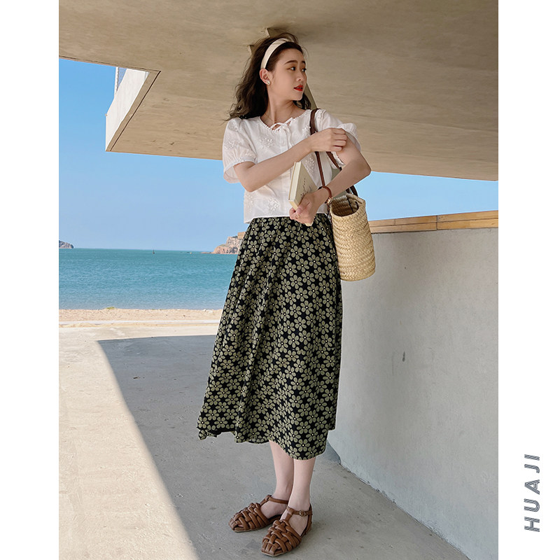 Зеленая юбка, эластичная талия, цветочный принт, подходит для подростков, в цветочек