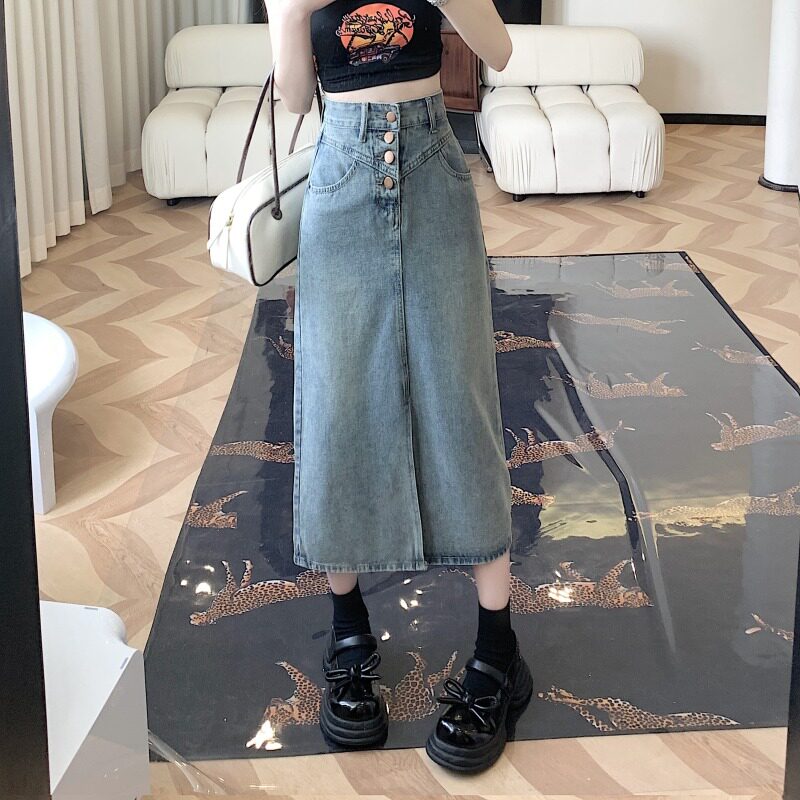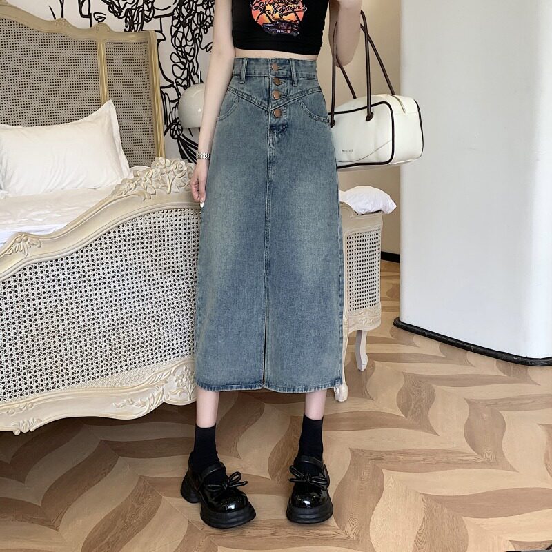 Ретро тонкая длинная джинсовая юбка, летняя длинная юбка, высокая талия, средней длины, А-силуэт, с акцентом на бедрах