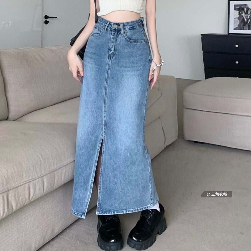 Дизайнерская ретро летняя джинсовая юбка, длинная длинная юбка, тренд сезона, высокая талия, А-силуэт, подходит для подростков, с акцентом на бедрах