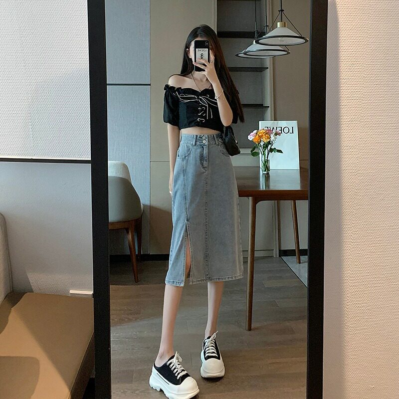 Приталенная летняя тонкая длинная джинсовая юбка, высокая талия, коллекция 2022, средней длины, А-силуэт