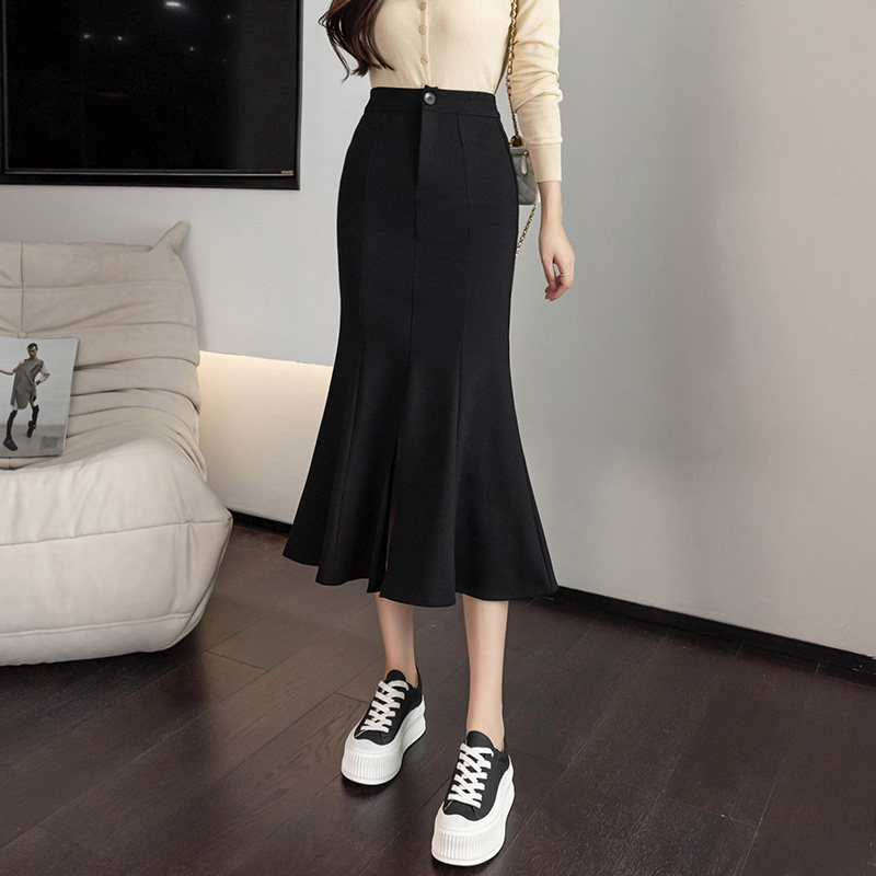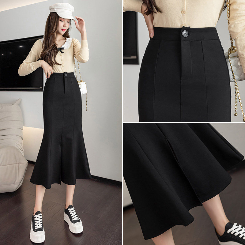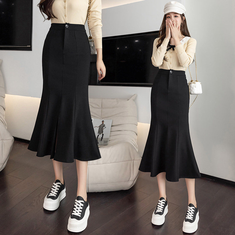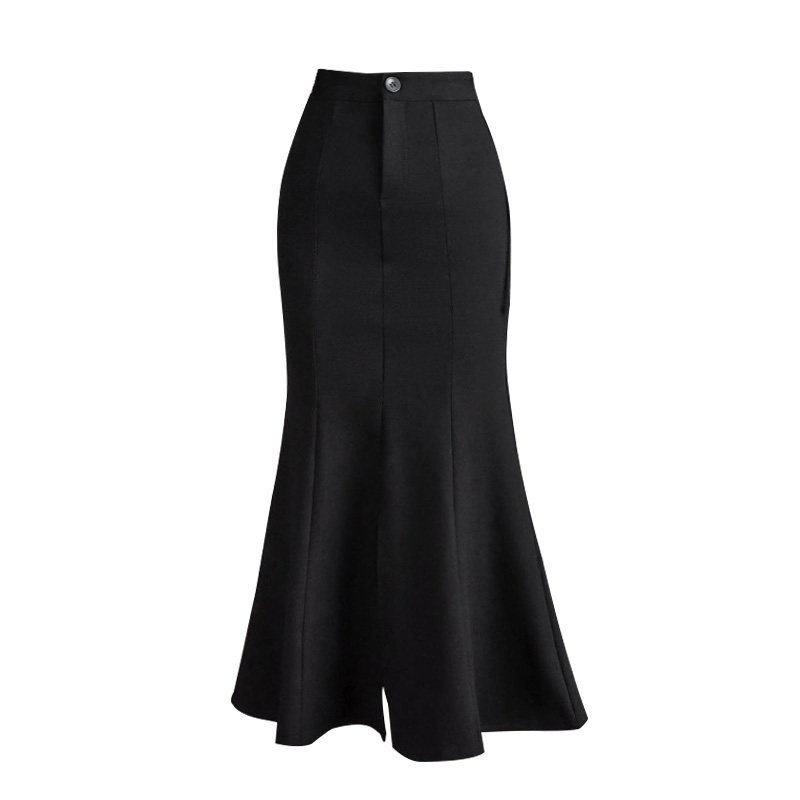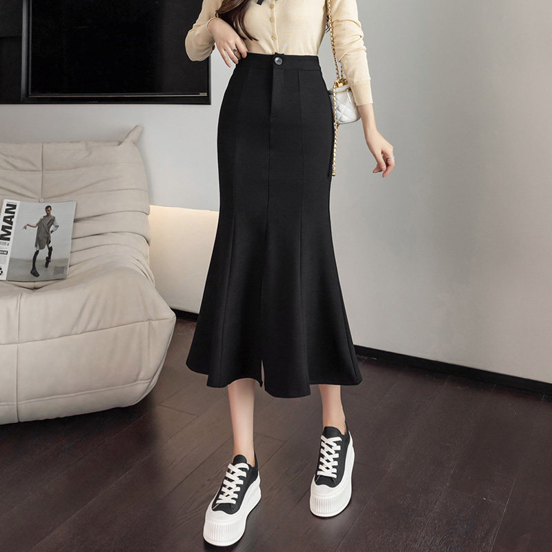 Черная осенняя длинная эластичная приталенная юбка, рыбий хвост, средней длины, высокая талия, с акцентом на бедрах