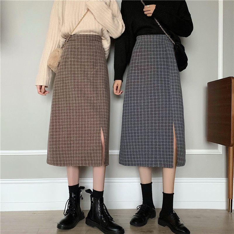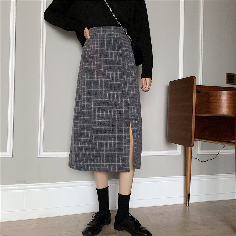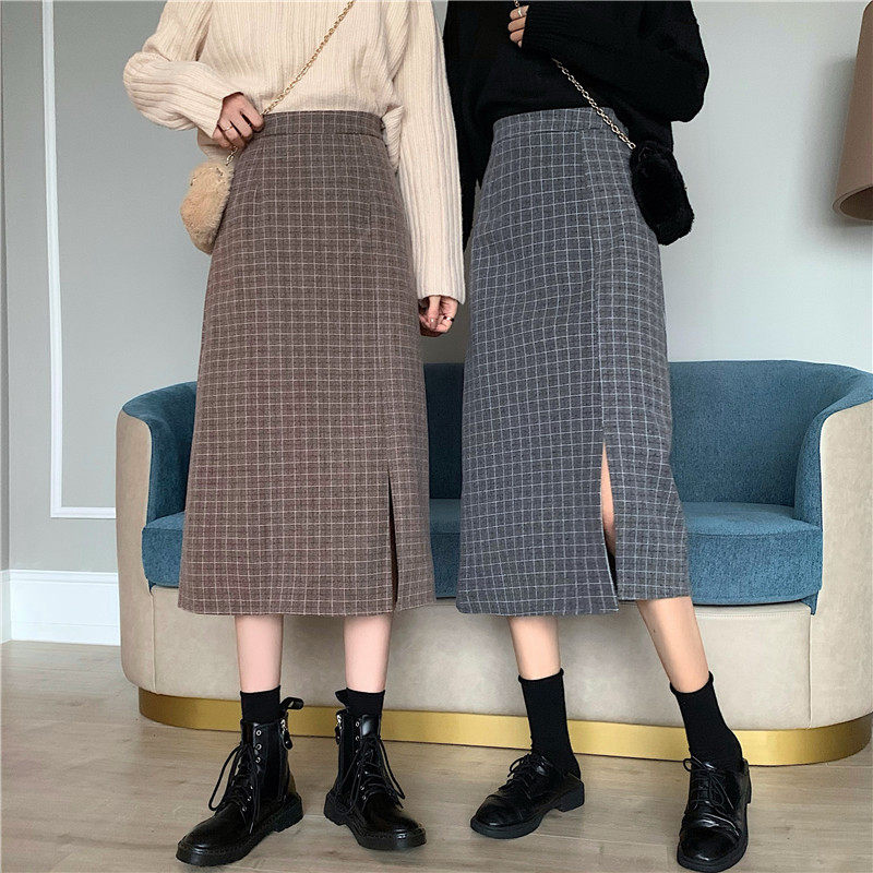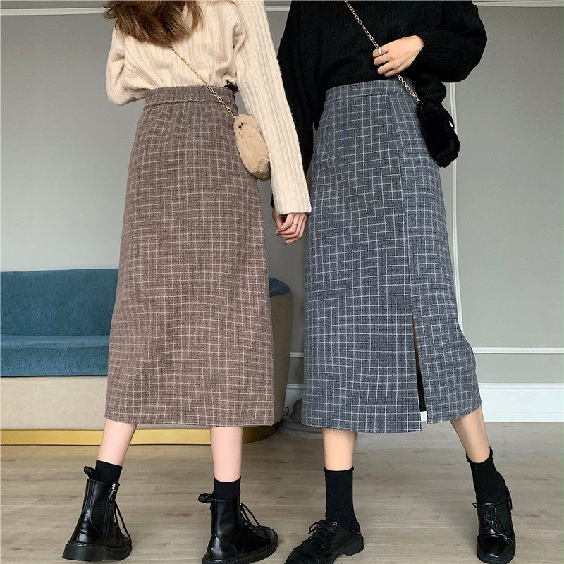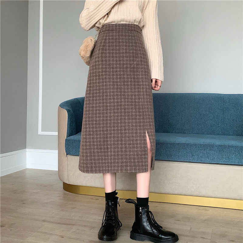 Ретро шерстяная клетчатая демисезонная длинная юбка, высокая талия, А-силуэт, с акцентом на бедрах
