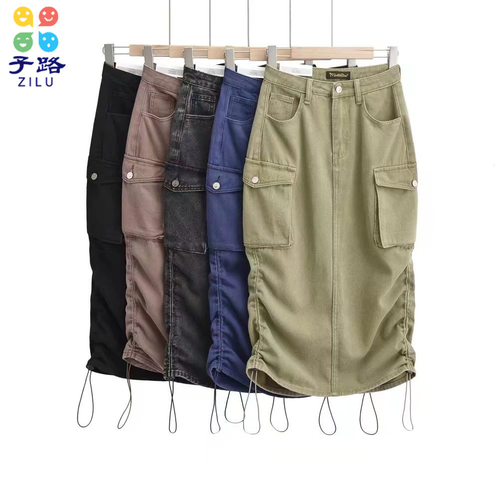 Джинсовая длинная юбка, европейский стиль, в американском стиле, высокая талия, на шнурках, средней длины