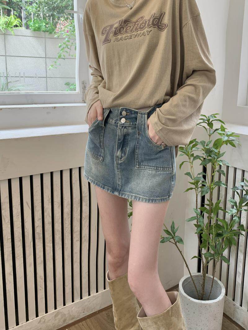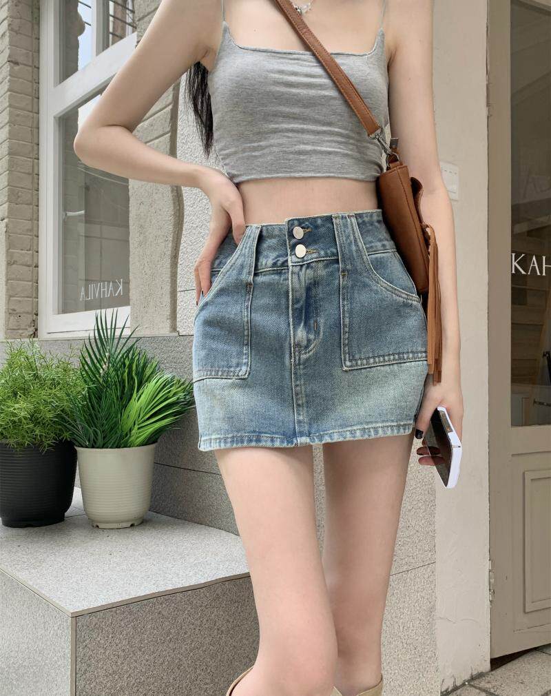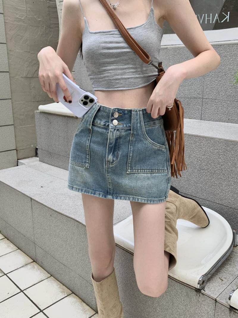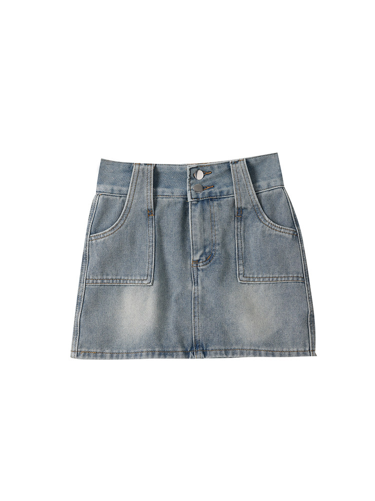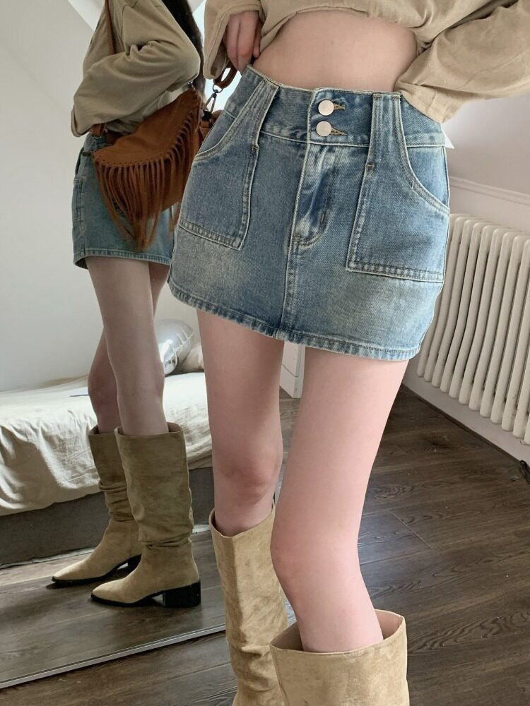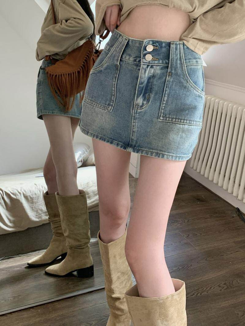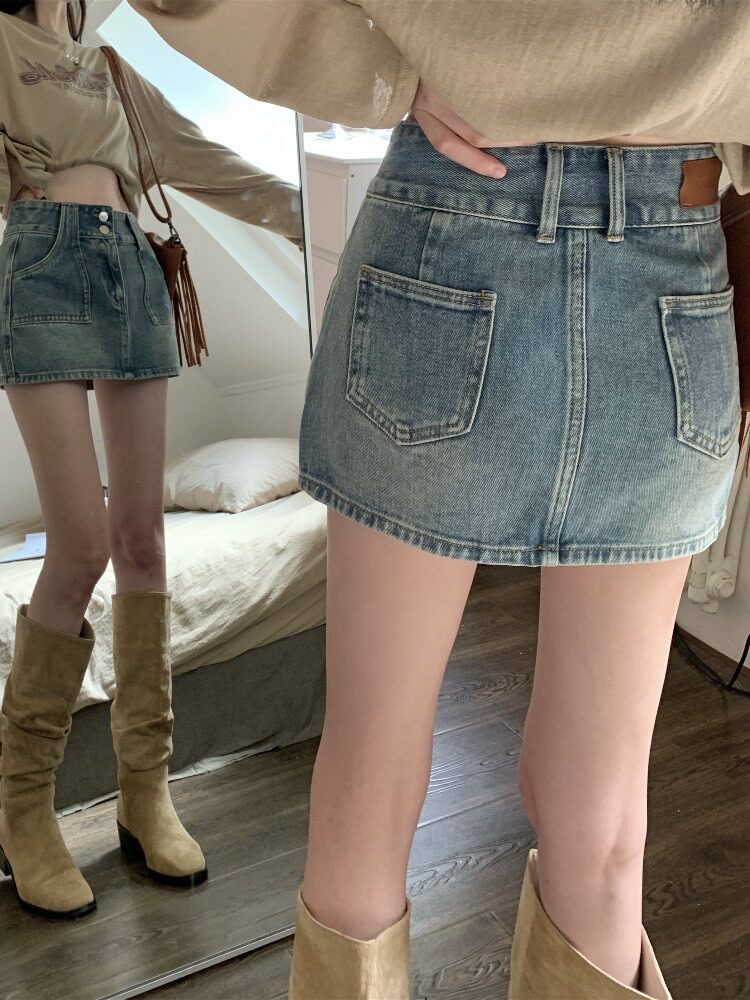 Ретро джинсовая юбка, осенние леггинсы, мини-юбка, А-силуэт, высокая талия, с акцентом на бедрах