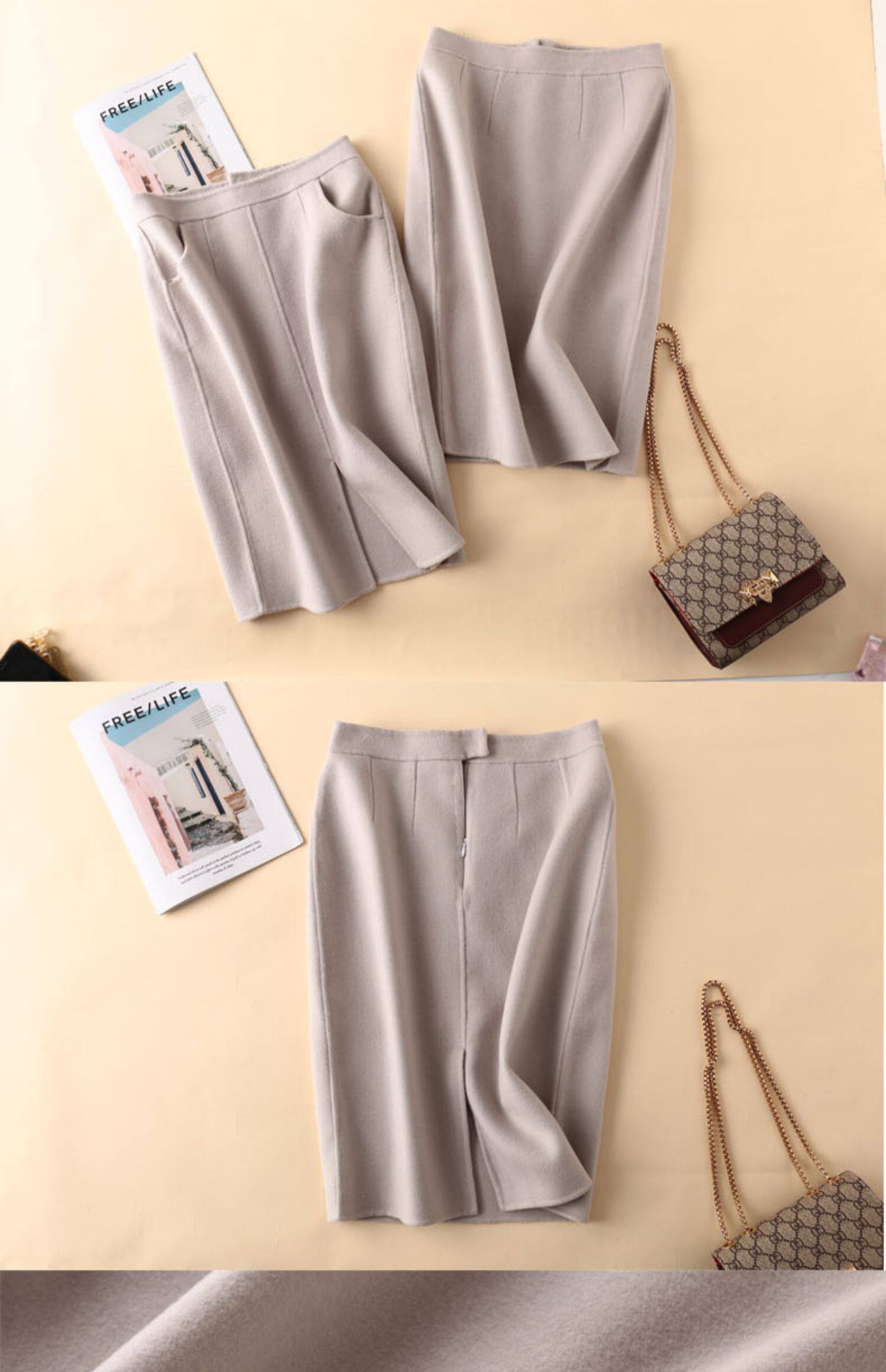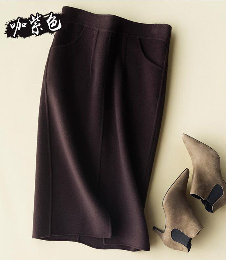 Хаки демисезонная длинная двусторонная шерстяная юбка, длина миди, эластичная талия, увеличенная толщина, с акцентом на бедрах