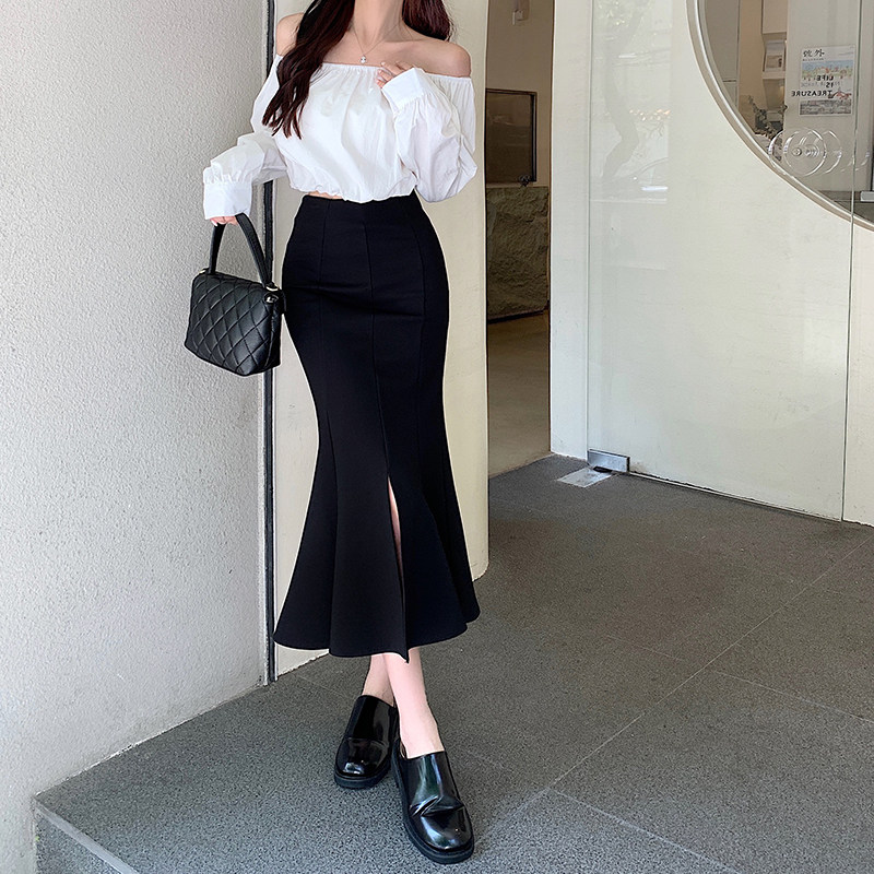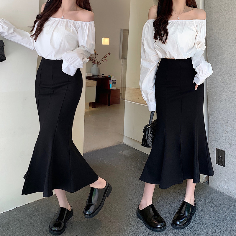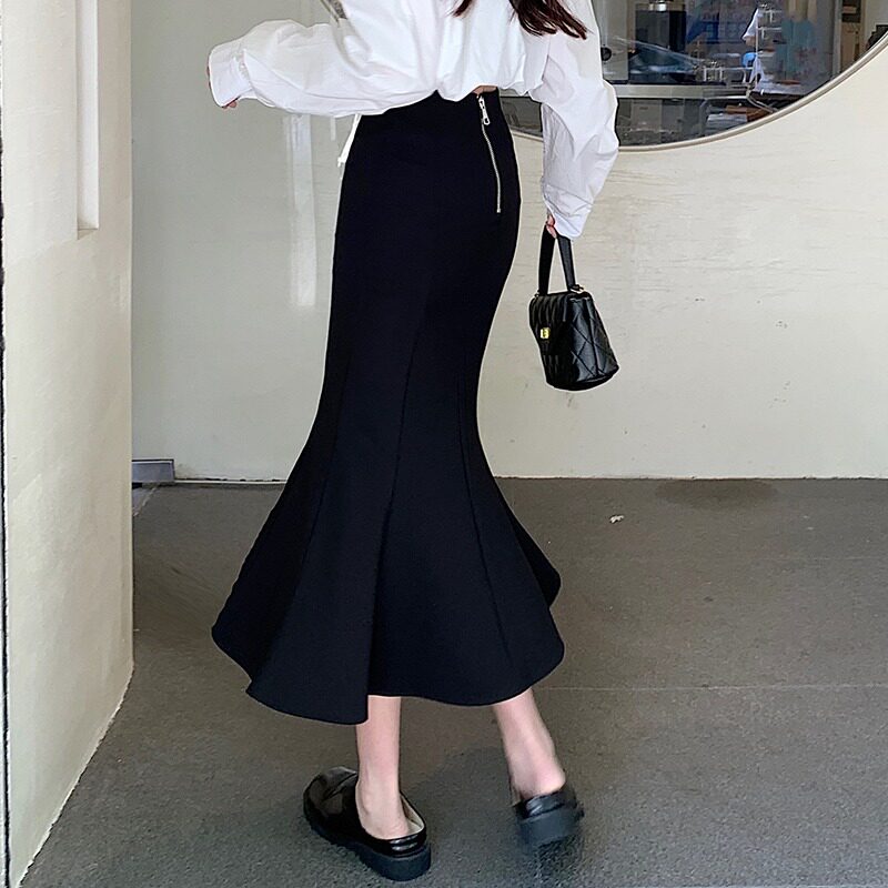 Черная осенняя длинная юбка, рыбий хвост, средней длины, высокая талия, А-силуэт