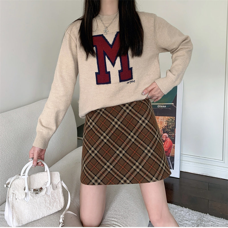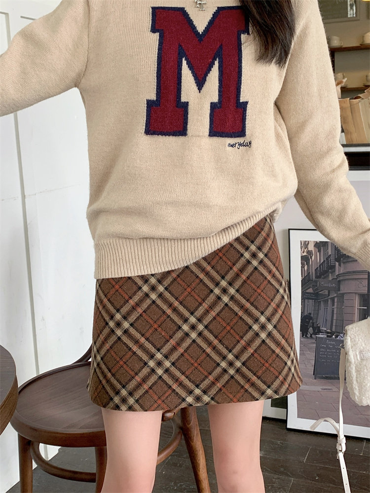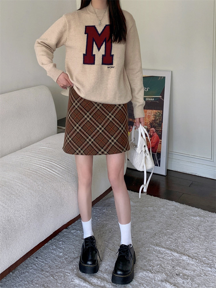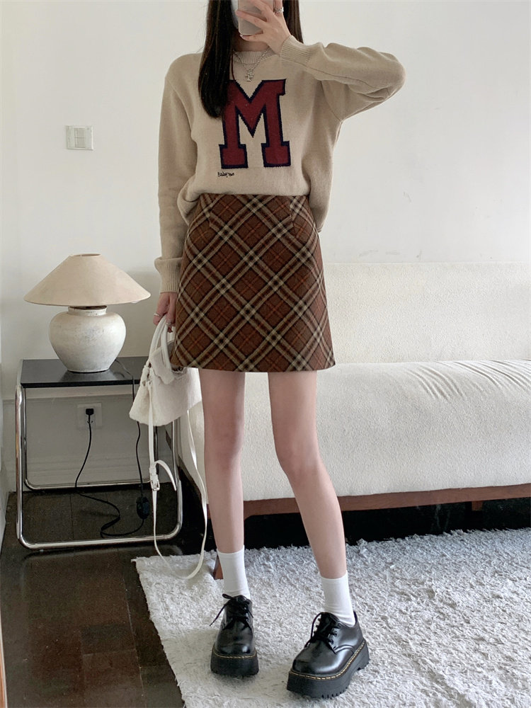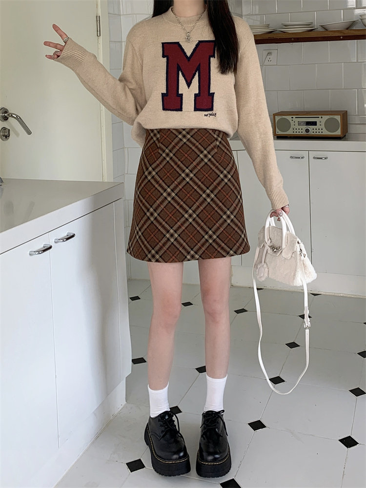 Шерстяная коричневая демисезонная юбка, в корейском стиле, А-силуэт