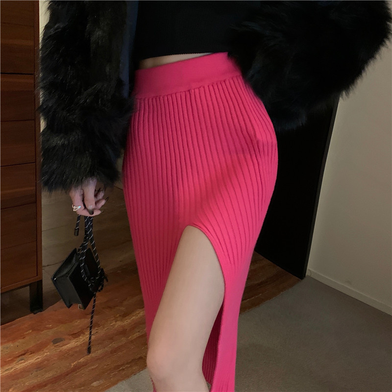 Красная трикотажная демисезонная длинная сексуальная юбка, с акцентом на бедрах, высокая талия