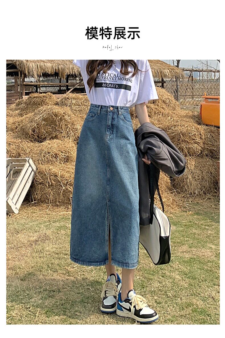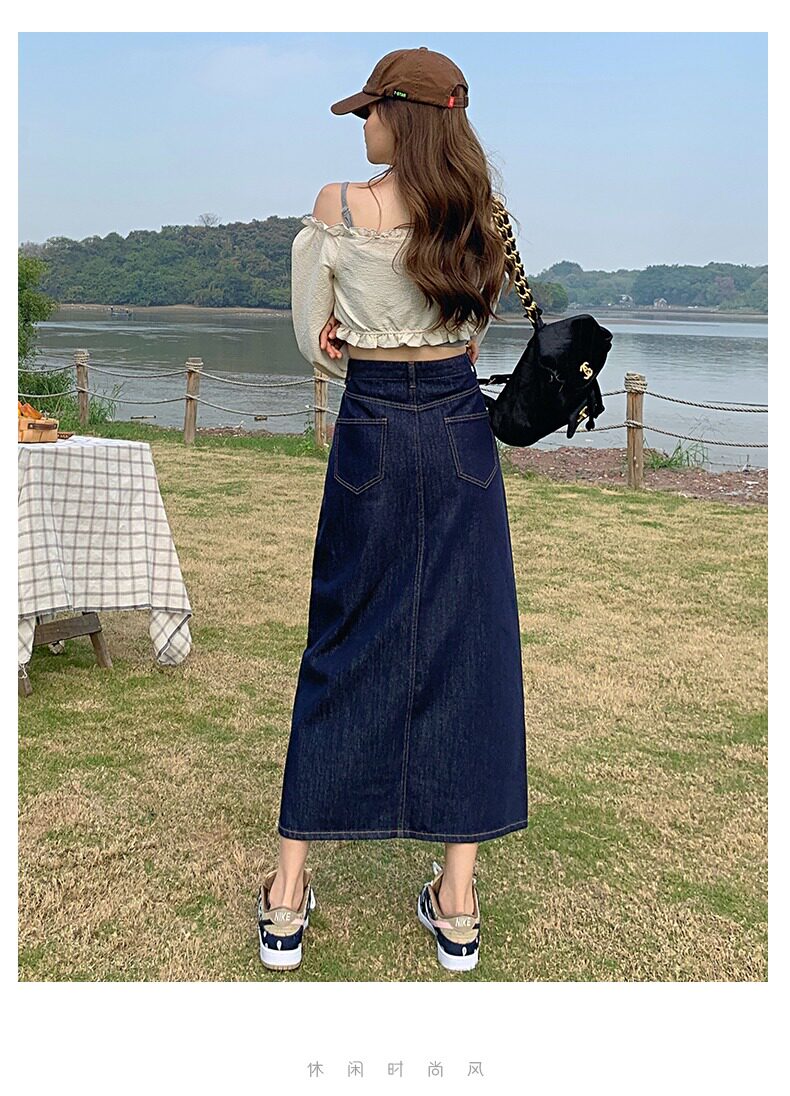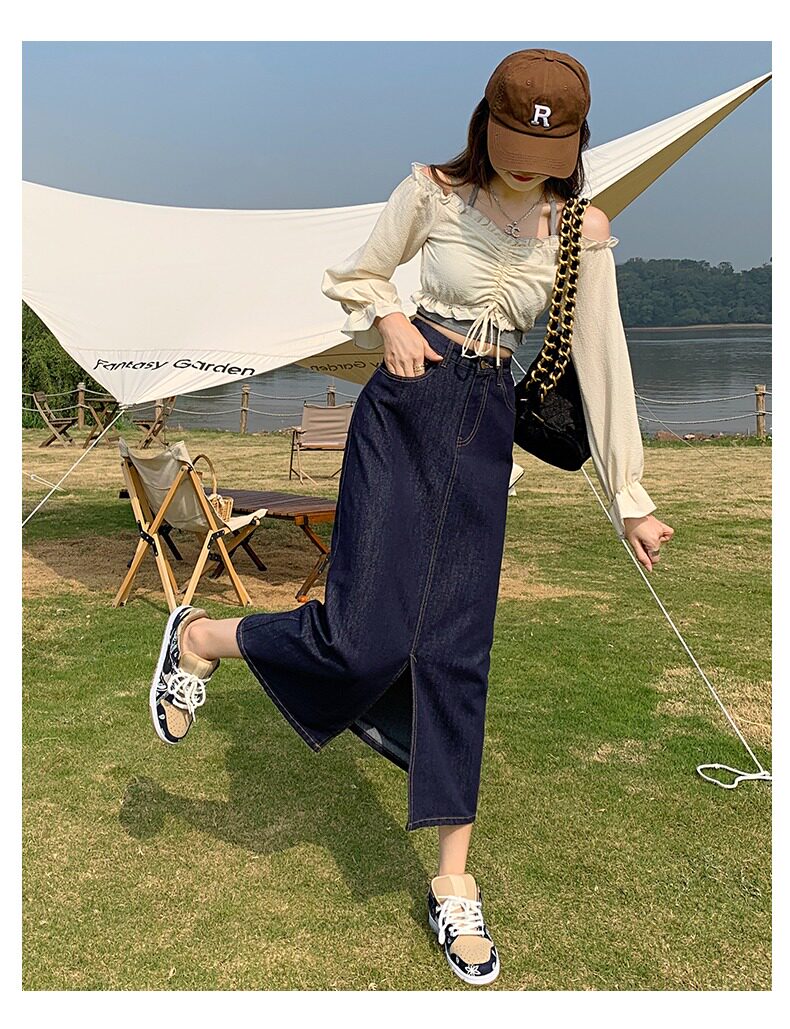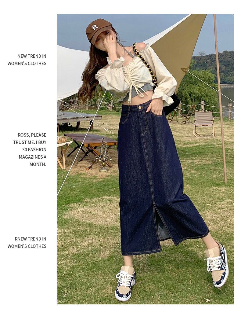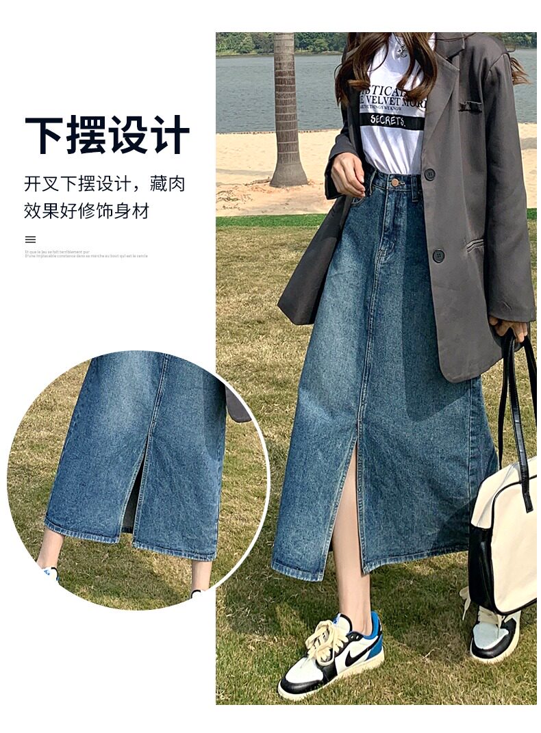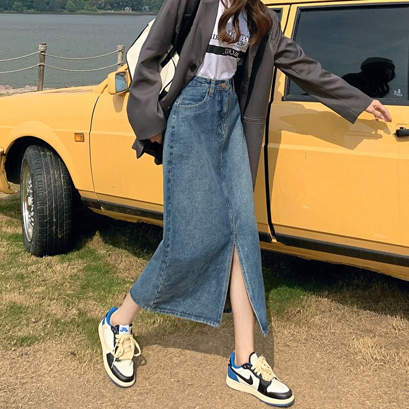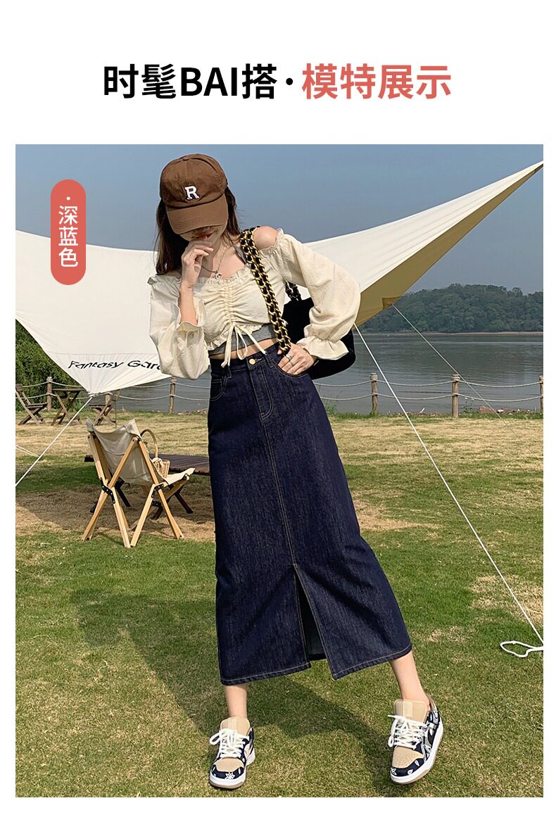 Осенняя длинная джинсовая юбка, высокая талия, А-силуэт, с акцентом на бедрах