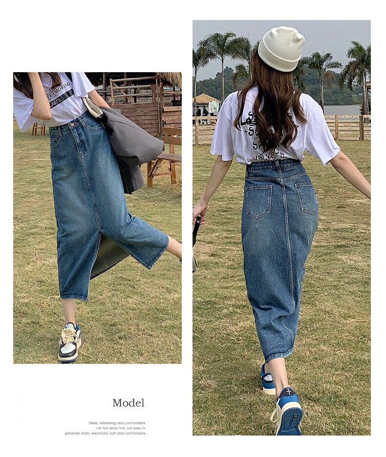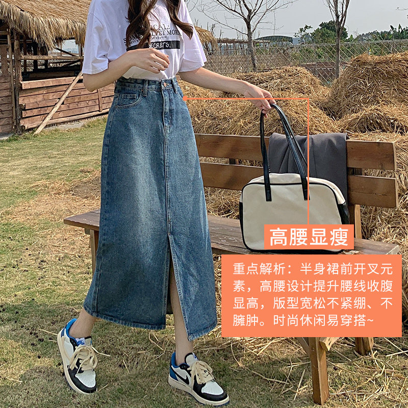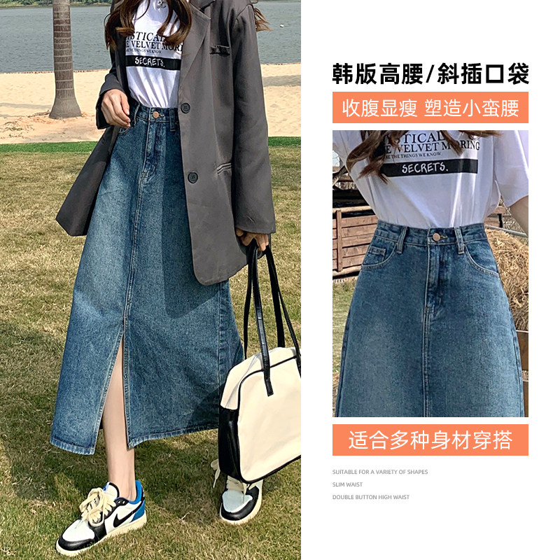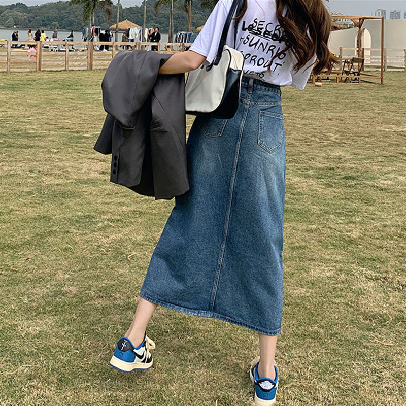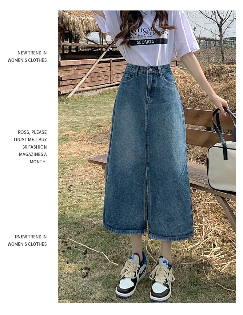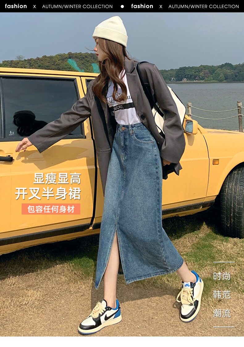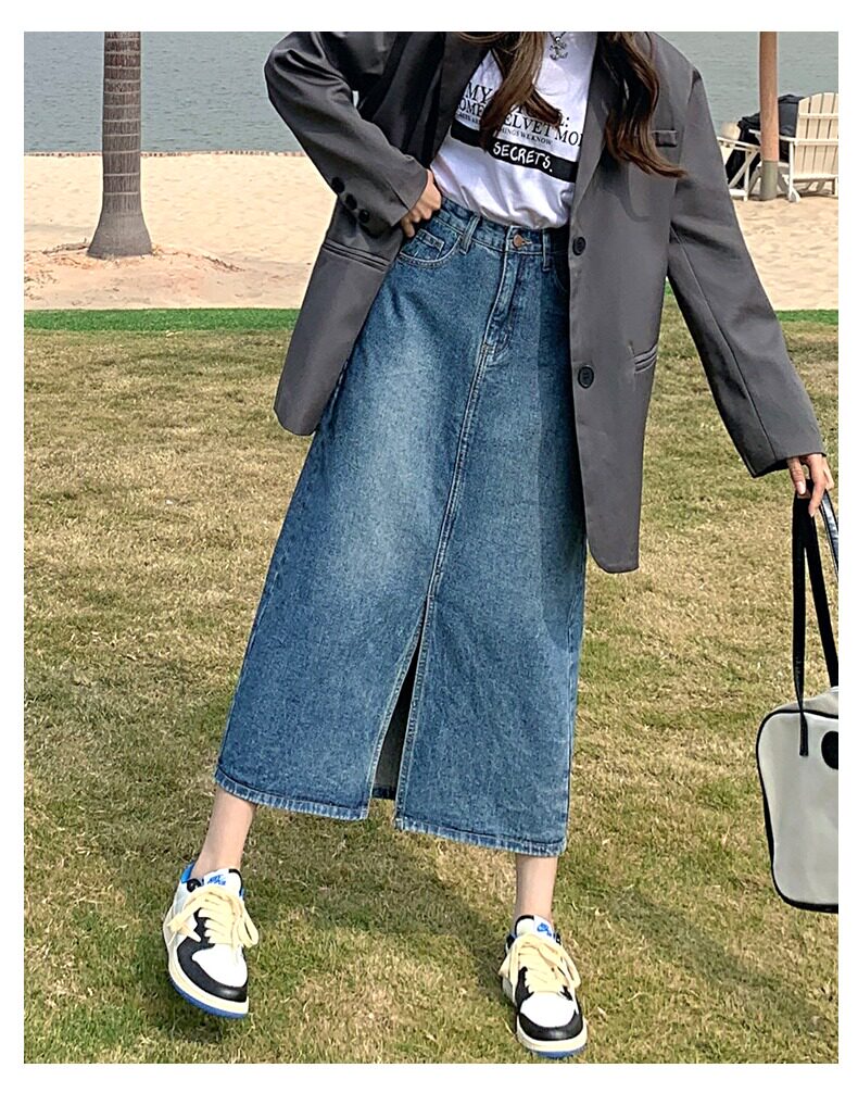 Осенняя длинная джинсовая юбка, высокая талия, А-силуэт, с акцентом на бедрах