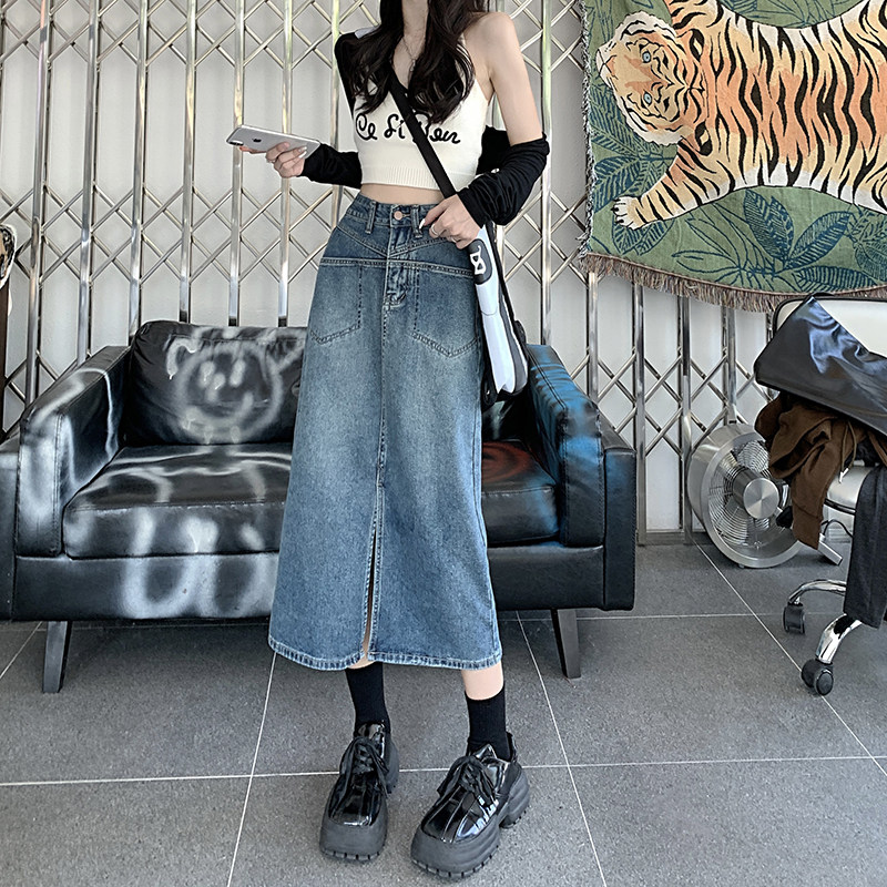 Весенняя ретро джинсовая юбка, длинная юбка, большой размер, высокая талия, с акцентом на бедрах, средней длины