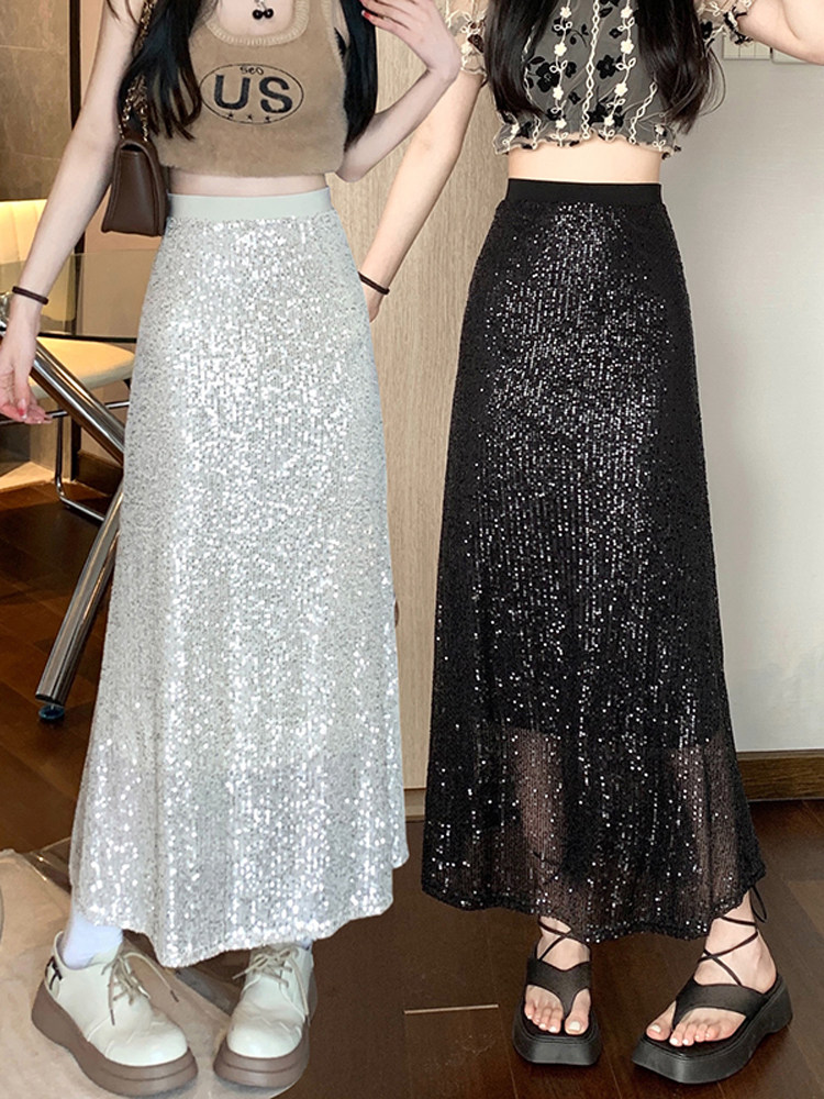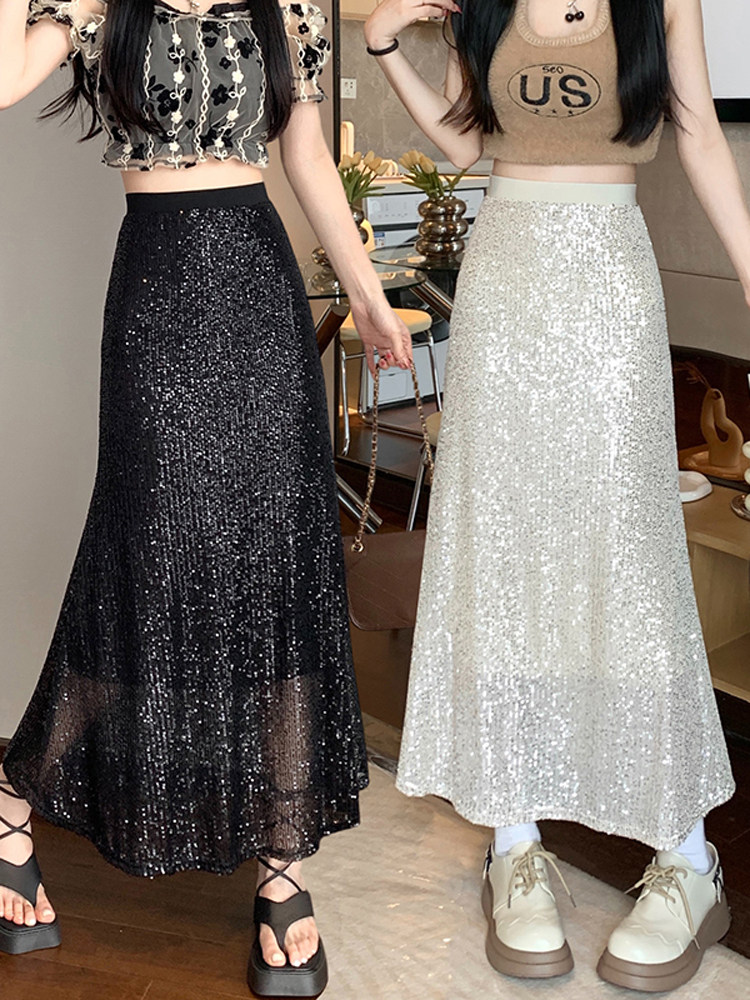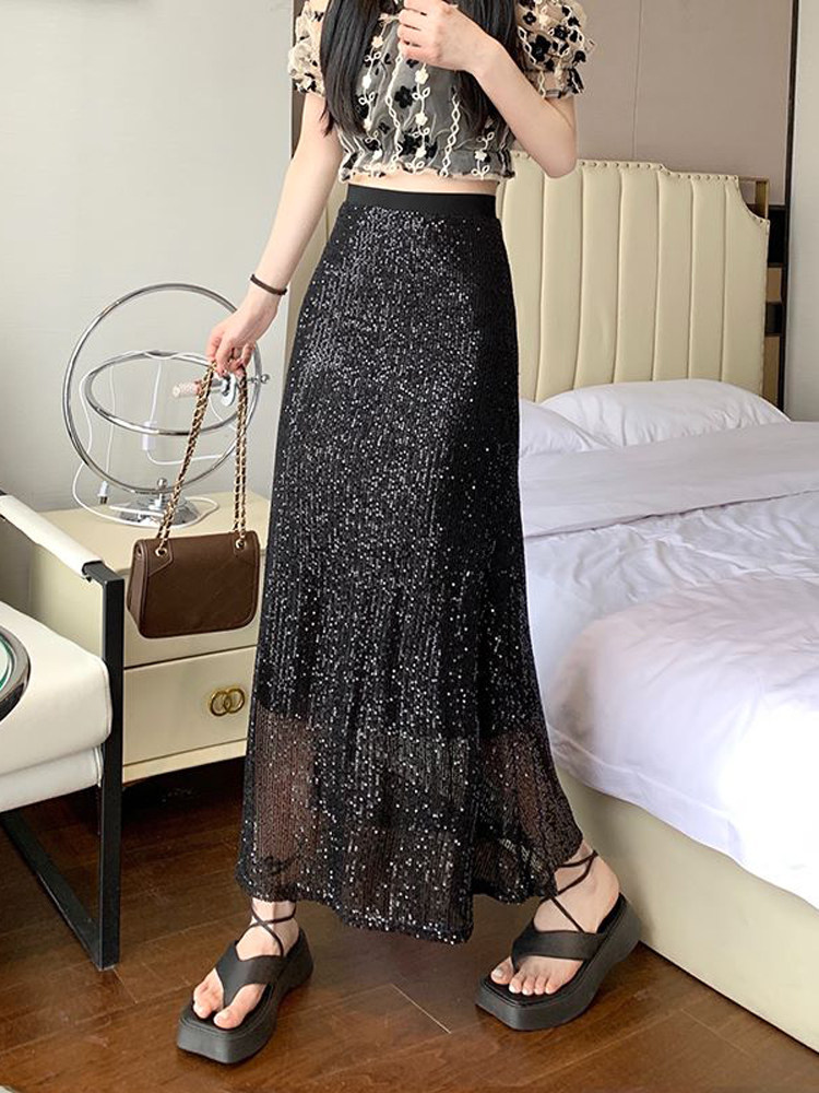 Черные летние приталенные блестки для ногтей, длинная длинная юбка, высокая талия, средней длины, А-силуэт, крой «рыбий хвост»