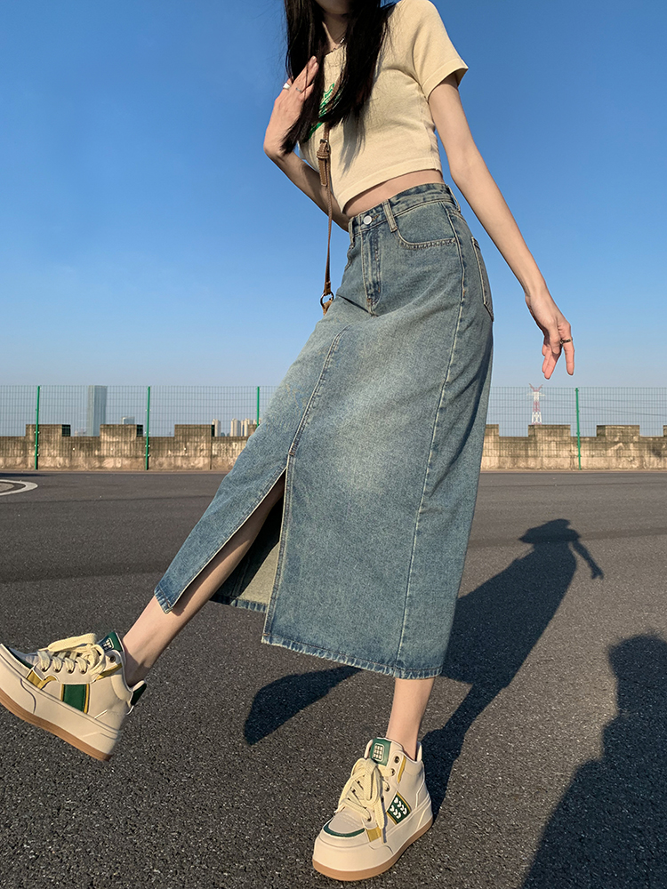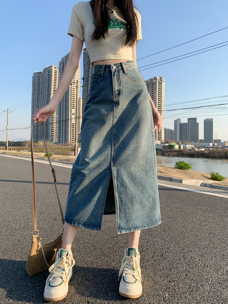 Летняя джинсовая юбка, ретро длинная поясная сумка, высокая талия, свободный прямой крой, А-силуэт