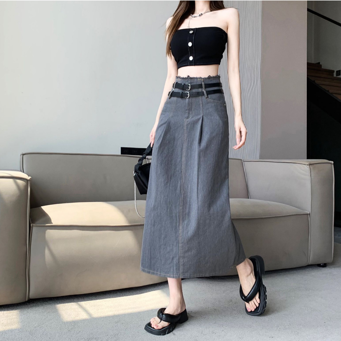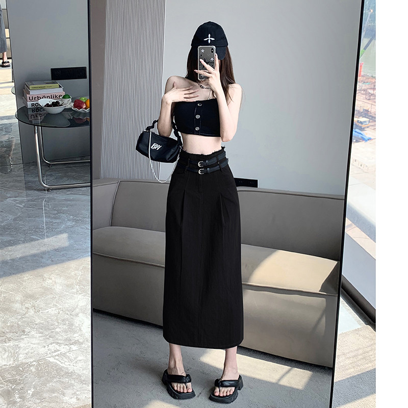 Ретро осенняя джинсовая юбка, длинный ремень, средней длины, свободный прямой крой