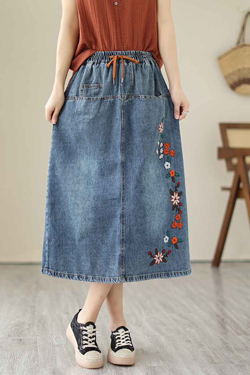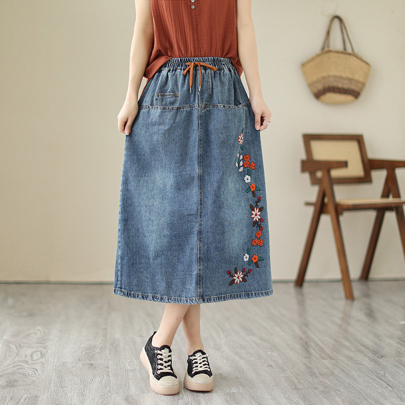 (Трансграничная торговля), японская ретро джинсовая юбка, длинная юбка, с вышивкой, свободный крой, высокая талия, А-силуэт