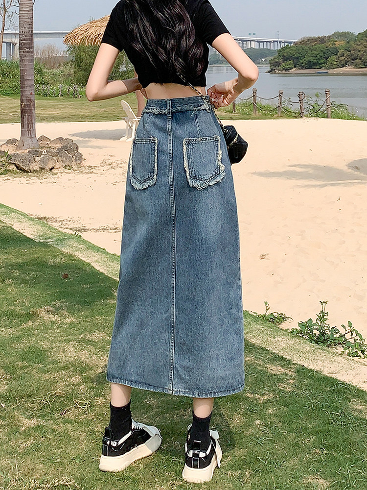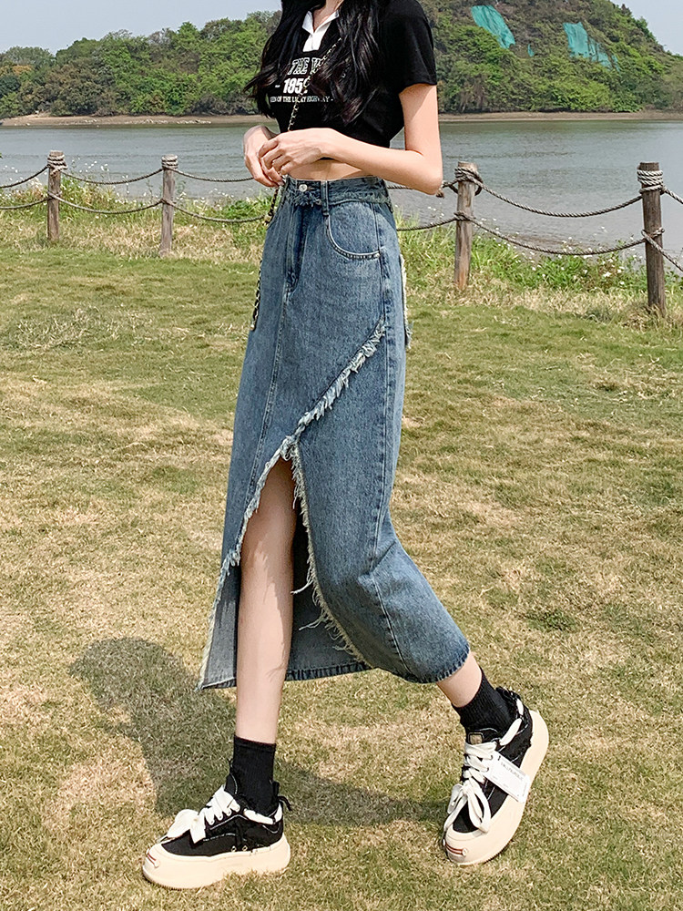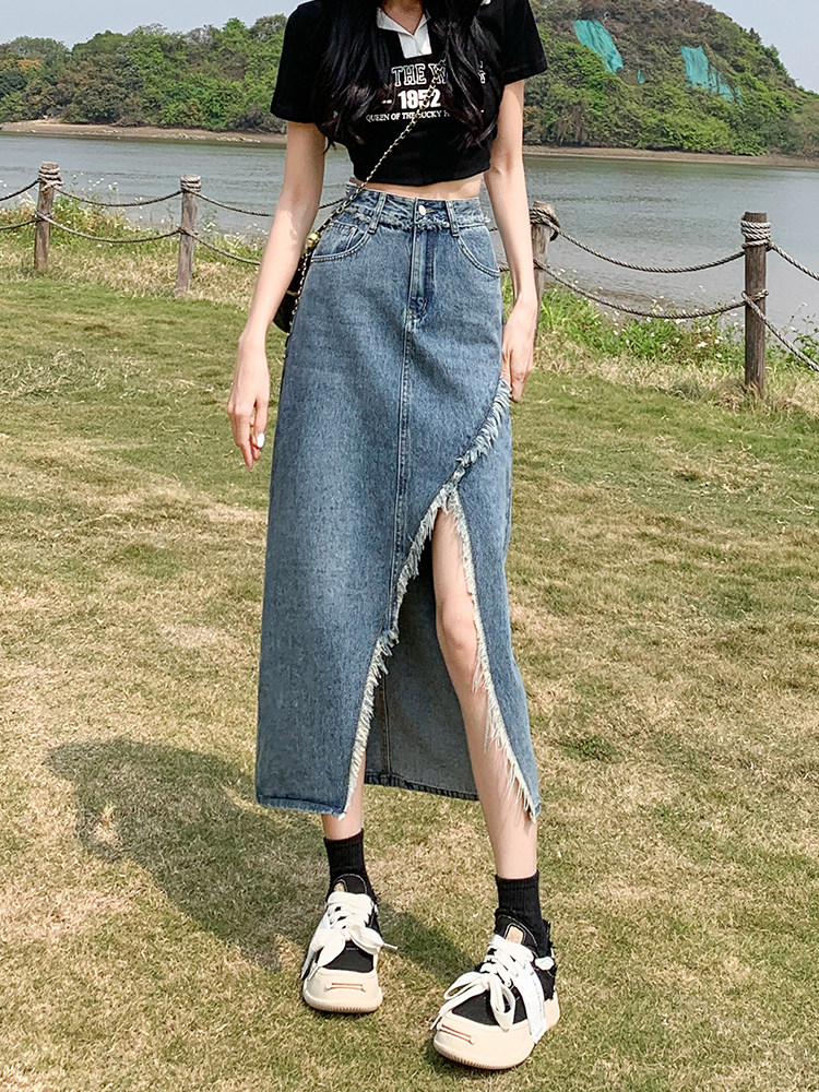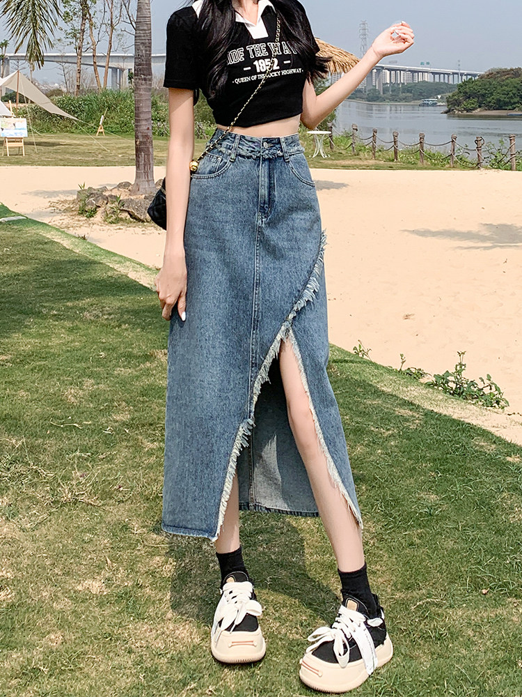 Дизайнерская осенняя длинная джинсовая юбка, тренд сезона, коллекция 2023, подходит для подростков, с акцентом на бедрах, средней длины