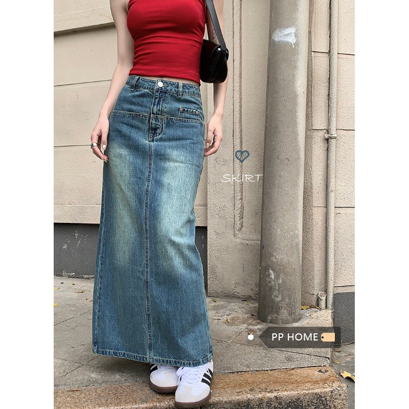 Ретро длинная джинсовая юбка, средней длины, длина макси, с акцентом на бедрах