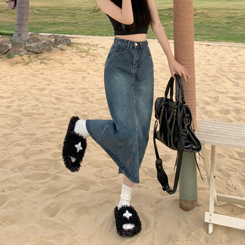 Джинсовая юбка, дизайнерская сумка, большой размер, тренд сезона, с акцентом на бедрах