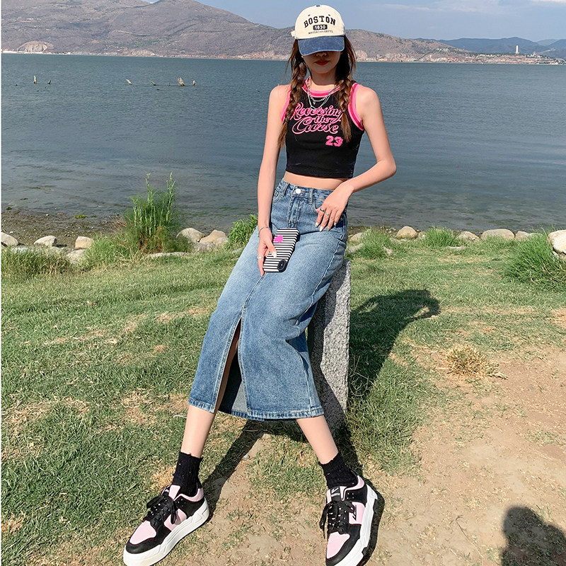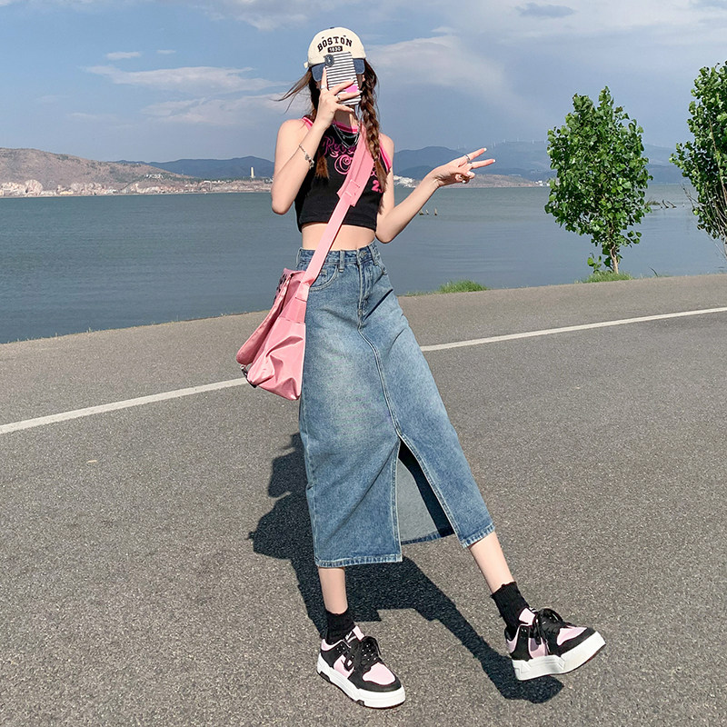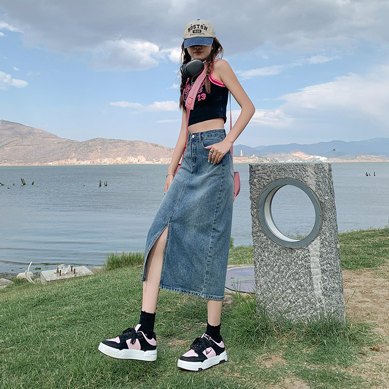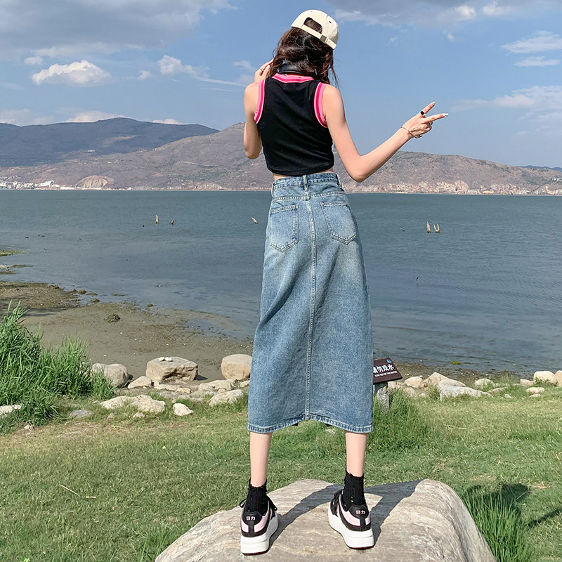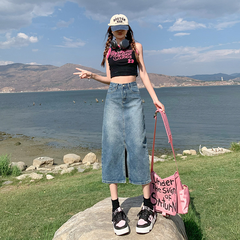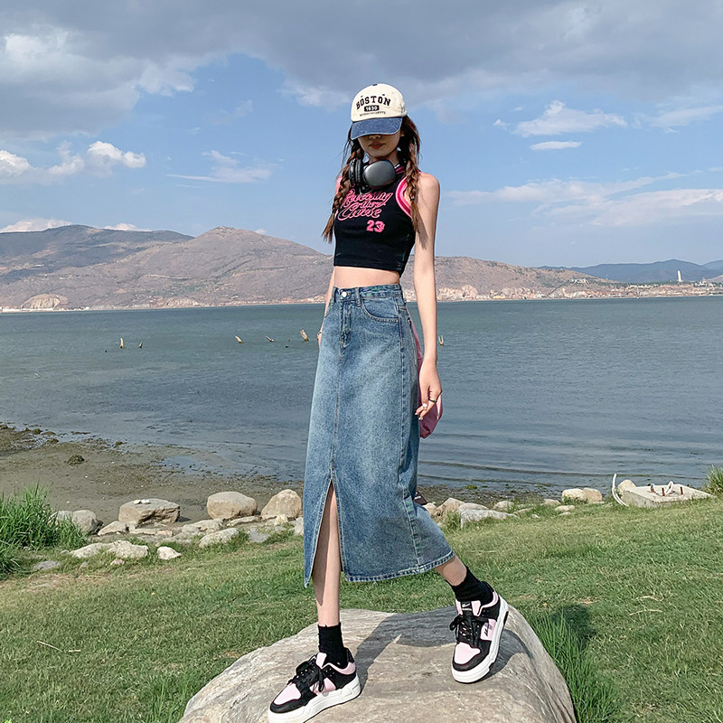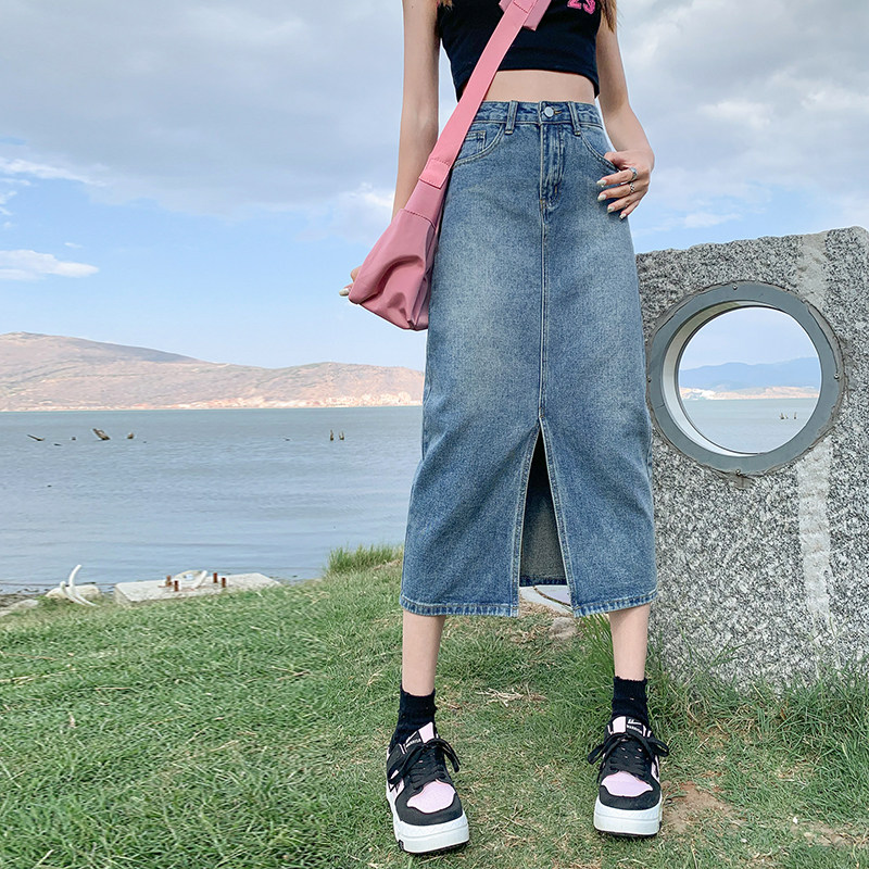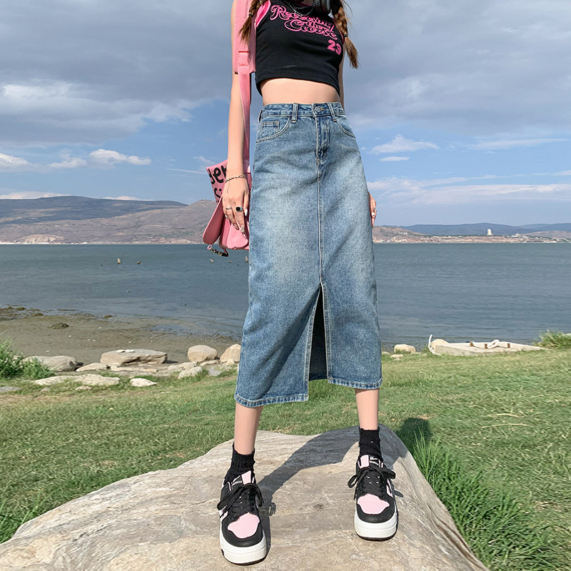 Летняя ретро длинная джинсовая юбка, высокая талия, с акцентом на бедрах, в американском стиле, свободный прямой крой, А-силуэт