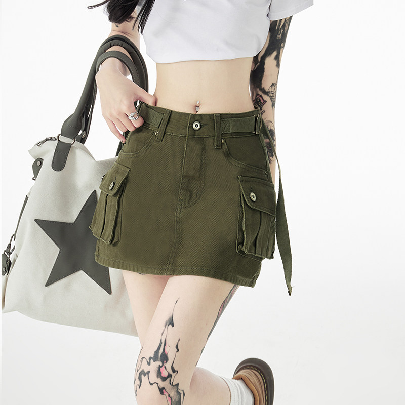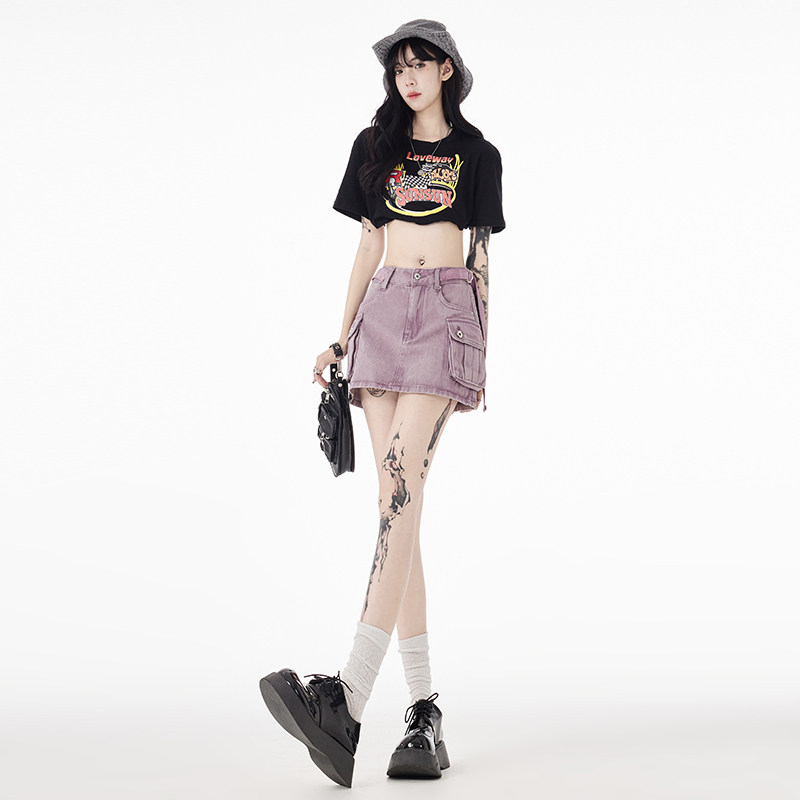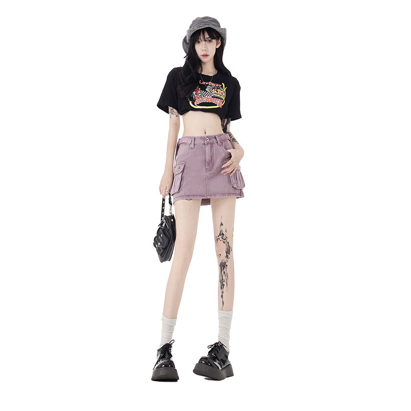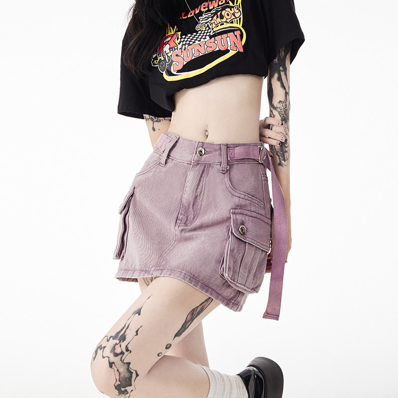 Сиреневая летняя джинсовая юбка, штаны, в американском стиле, А-силуэт, с акцентом на бедрах