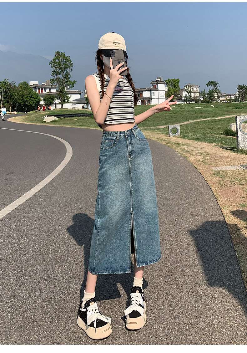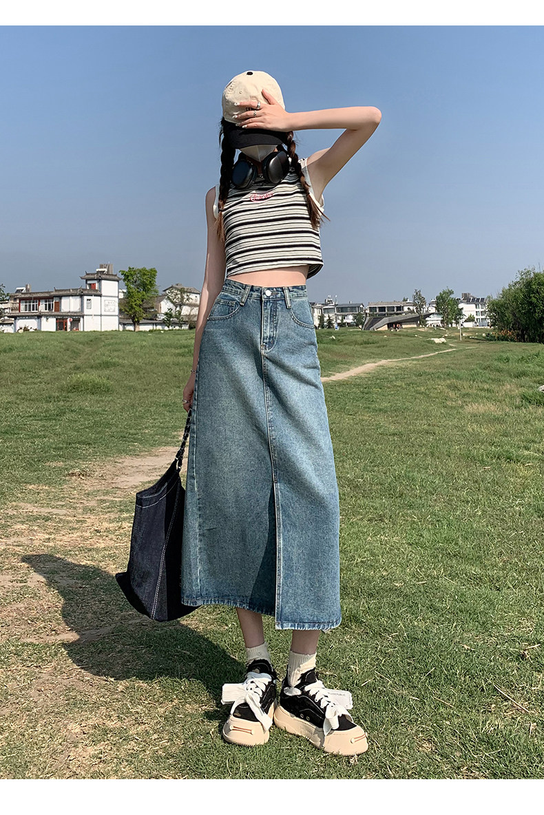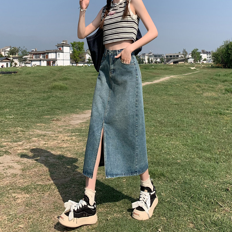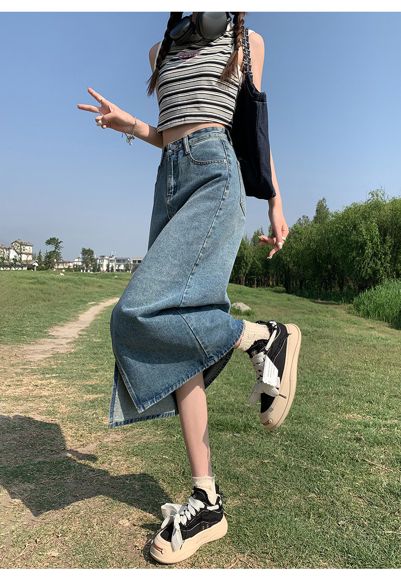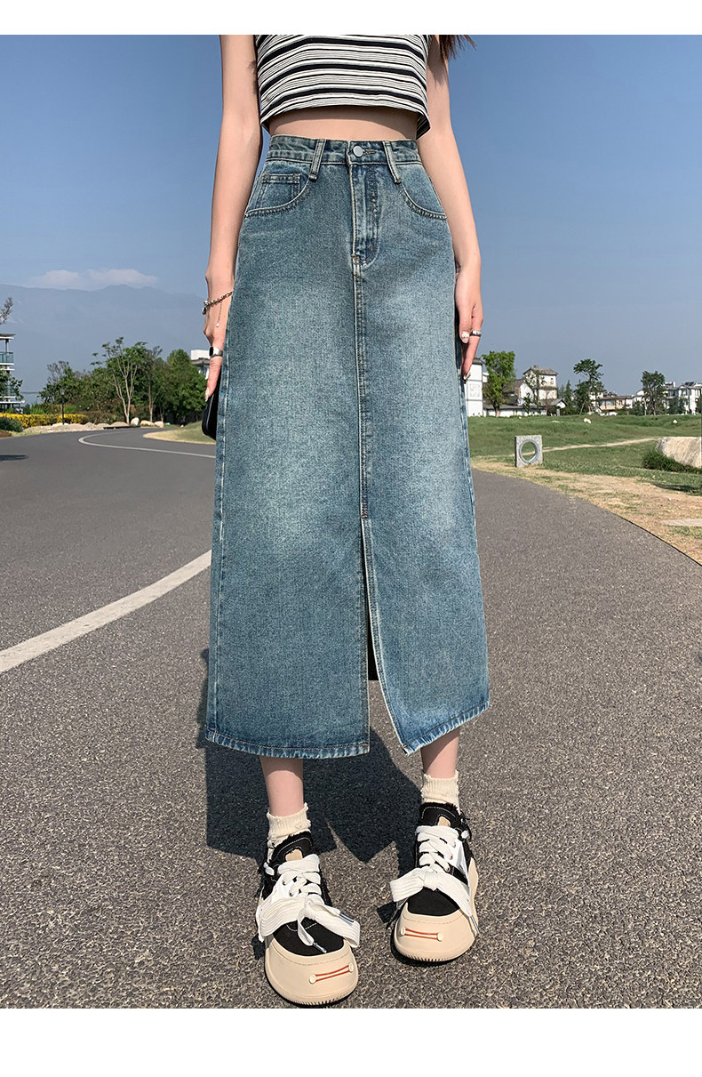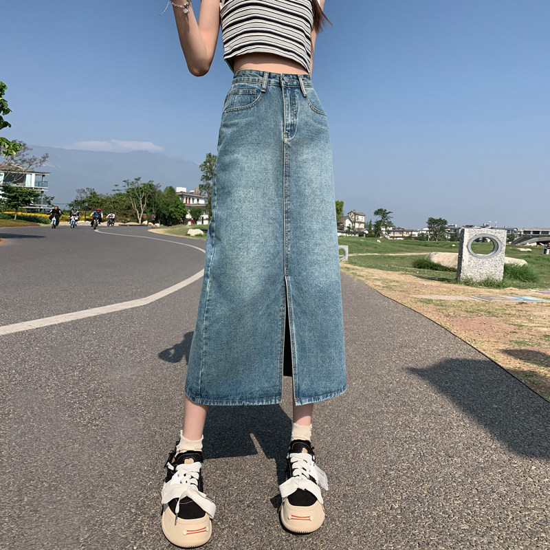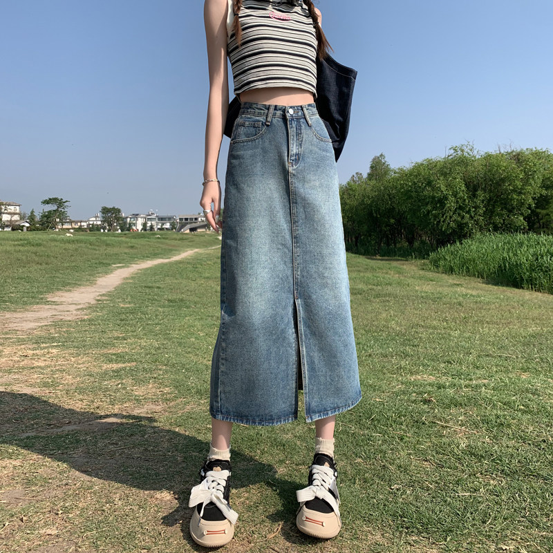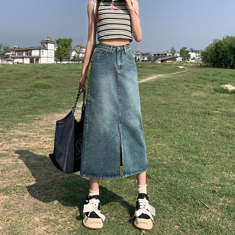 Осенняя приталенная джинсовая юбка, длинная юбка, коллекция 2023, высокая талия, по фигуре, подходит для подростков, А-силуэт