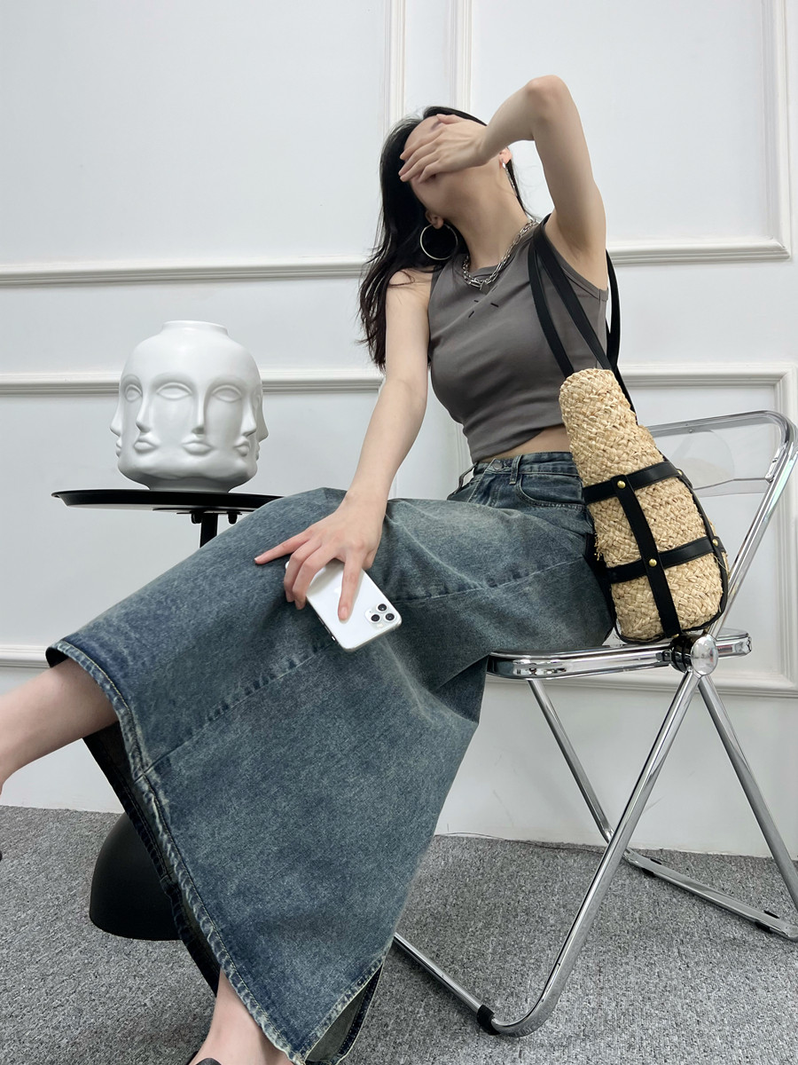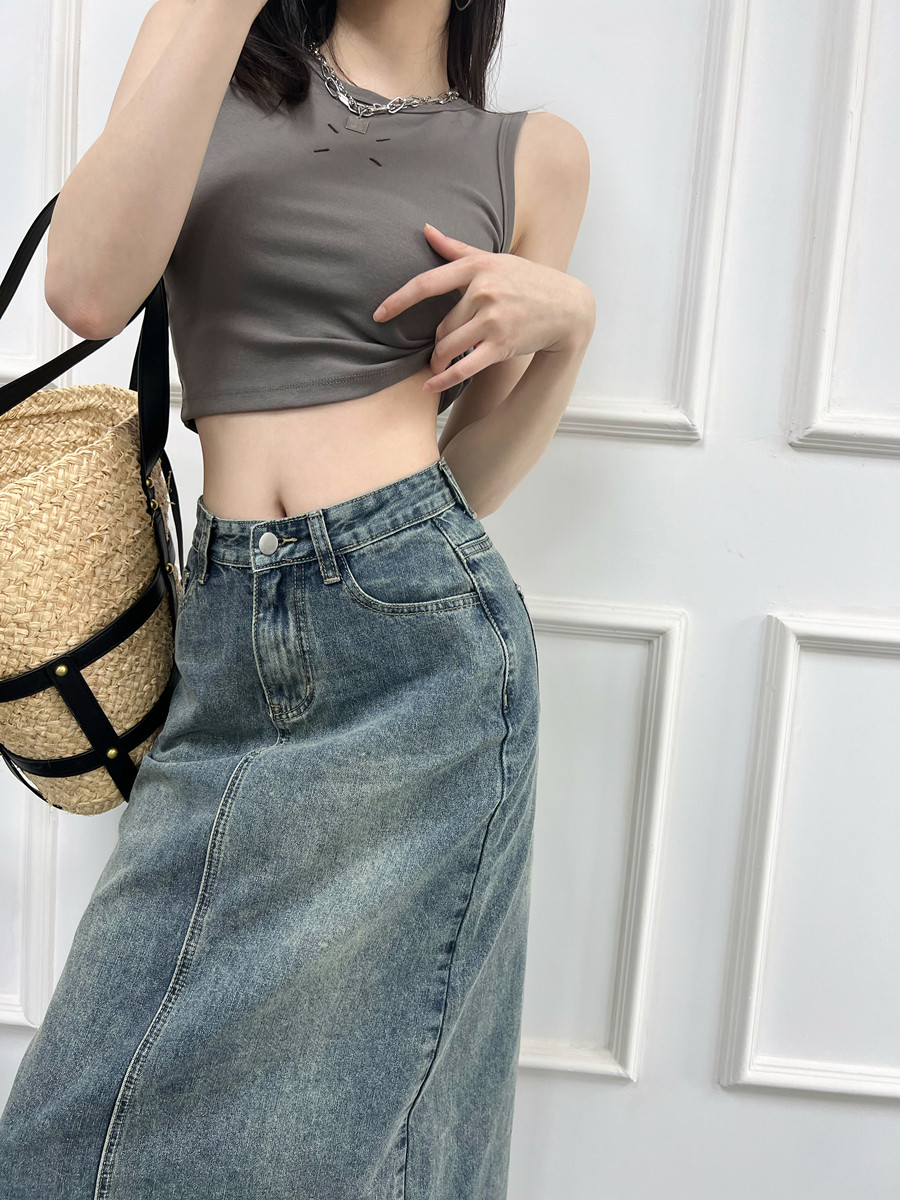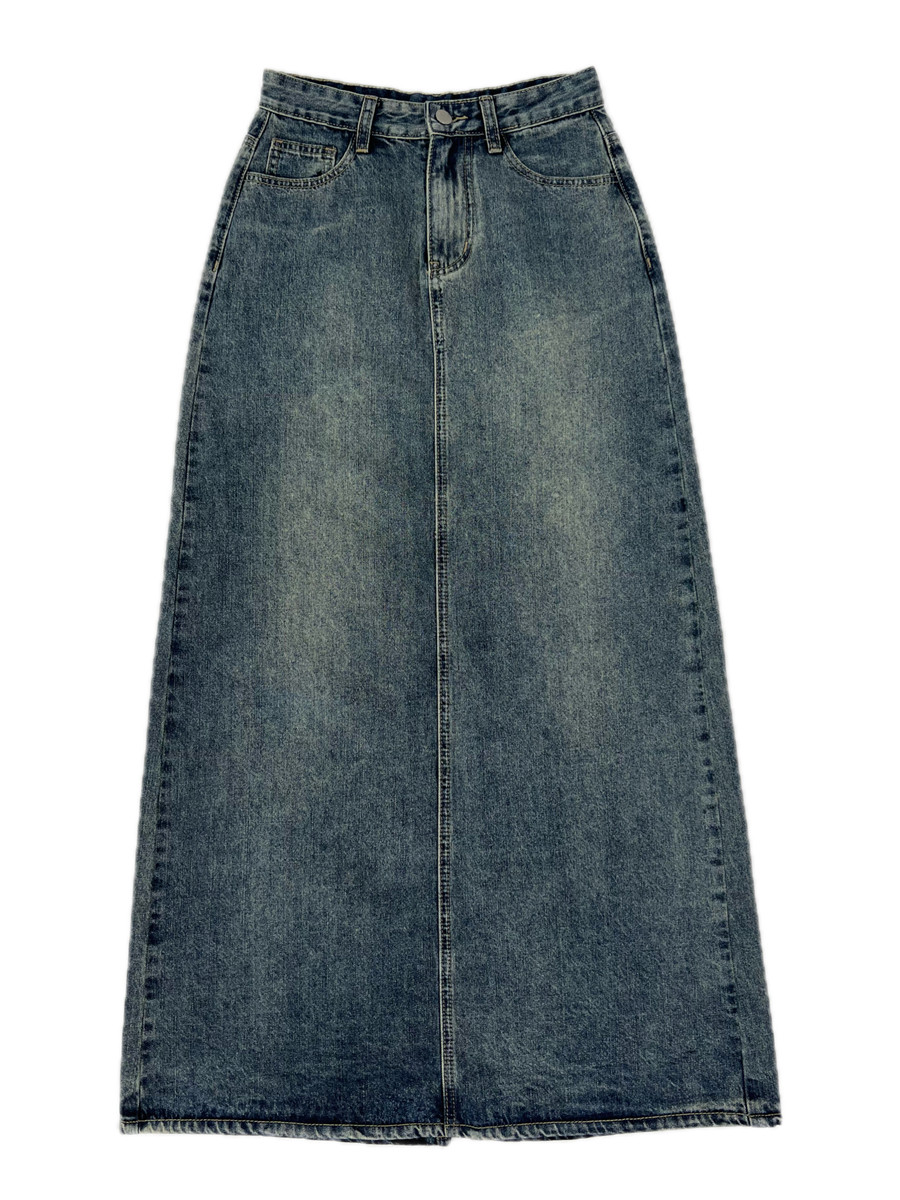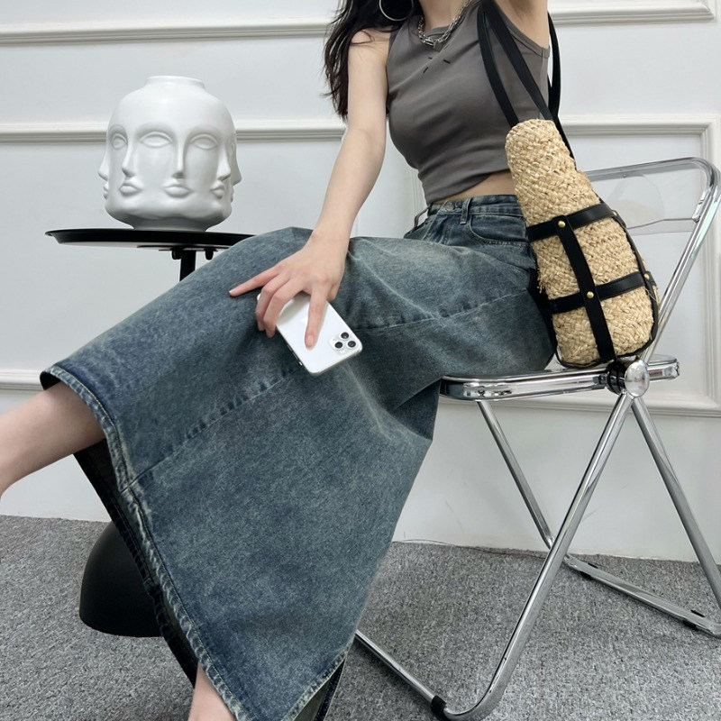 Ретро летняя приталенная джинсовая юбка, длинная длинная юбка, высокая талия, средней длины, с акцентом на бедрах