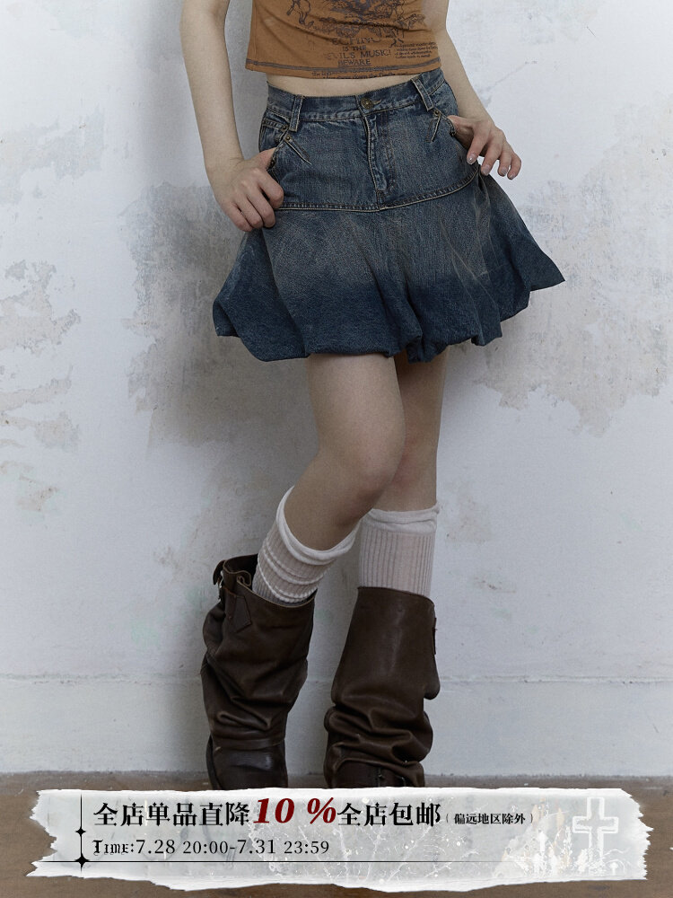 Нет романтического табу романтическое оригинальное дизайн ретро, старая игривая булочка Puffy Pufpy A -Line Denim Subilt