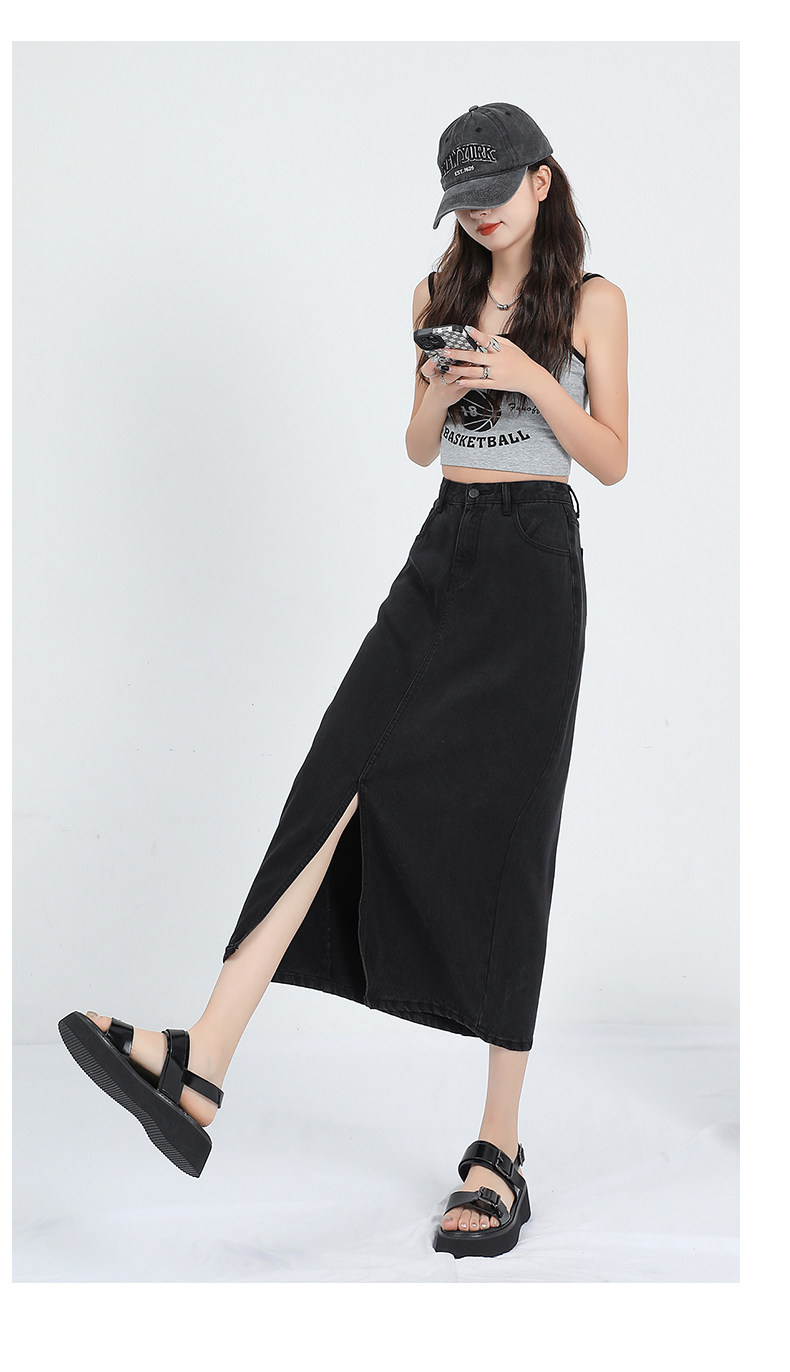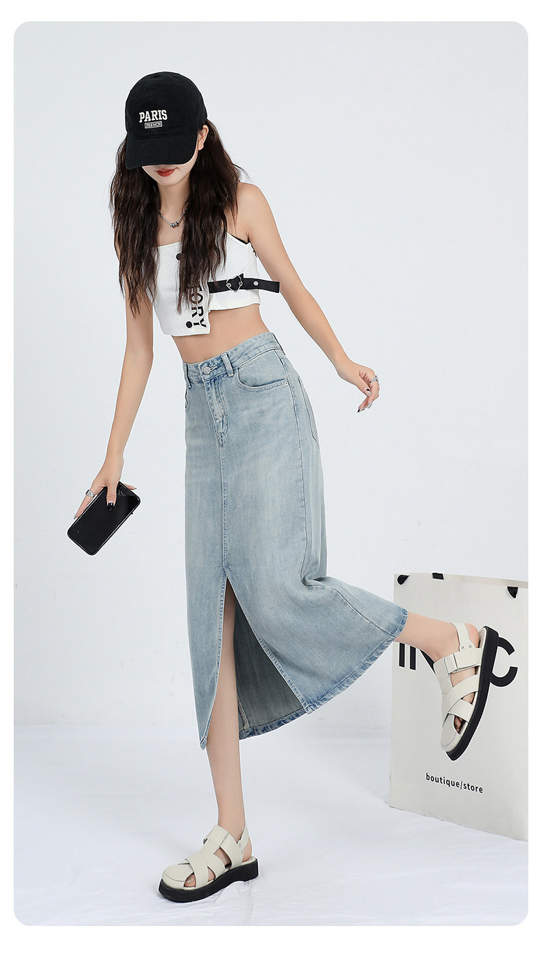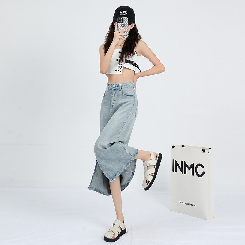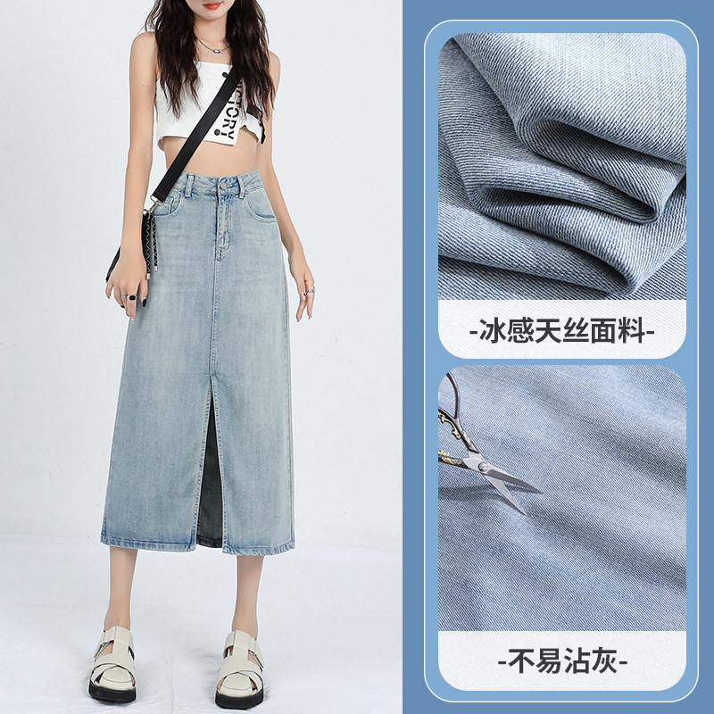 Летняя тонкая шелковая длинная джинсовая юбка, высокая талия, свободный крой, А-силуэт, средней длины, с акцентом на бедрах