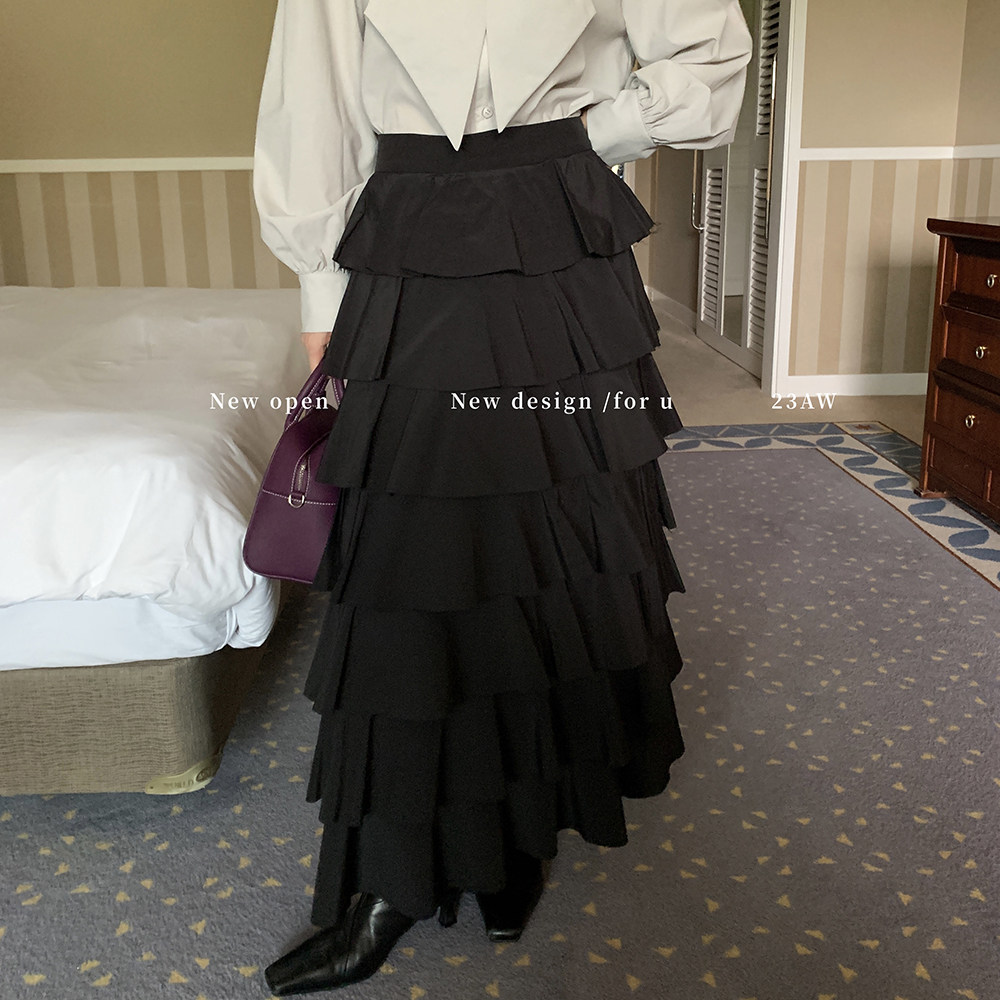 Осенняя приталенная черная длинная юбка, высокая талия, средней длины