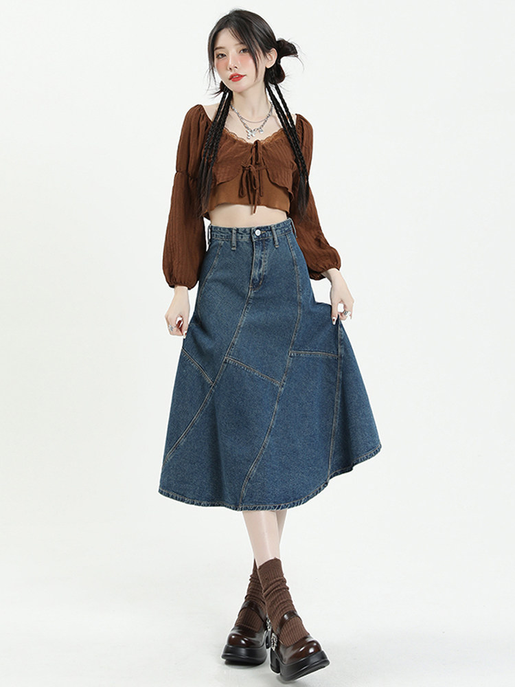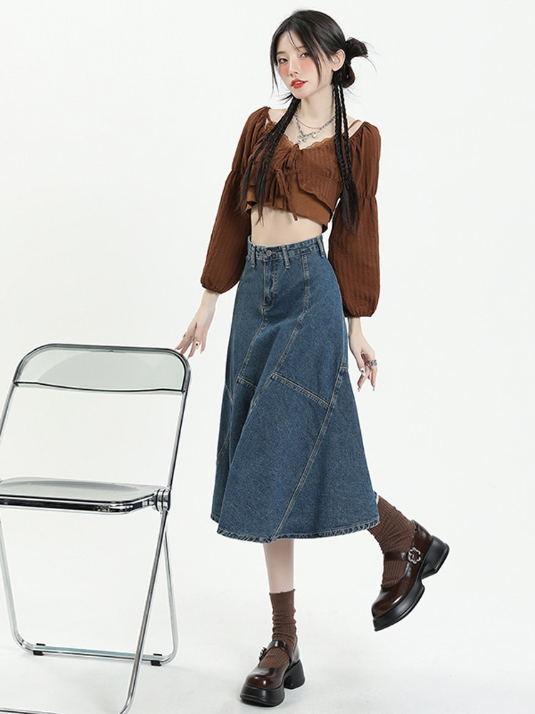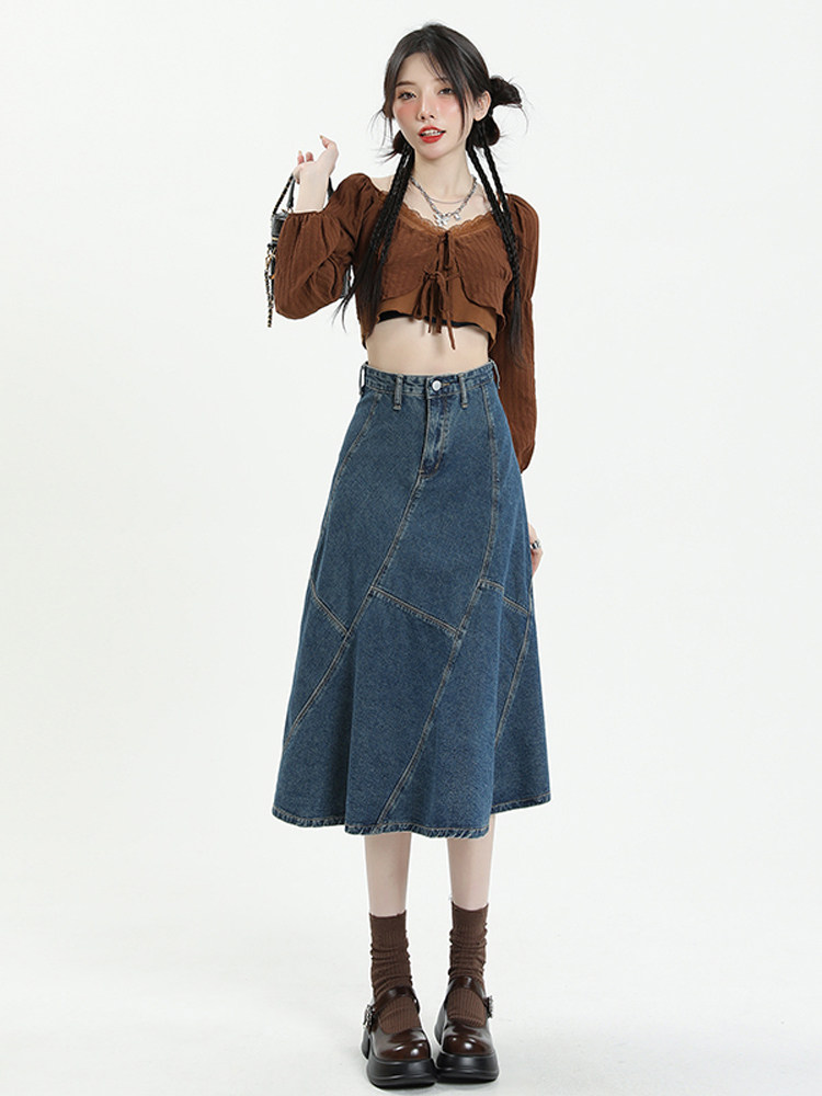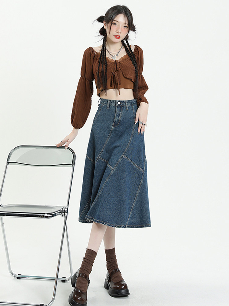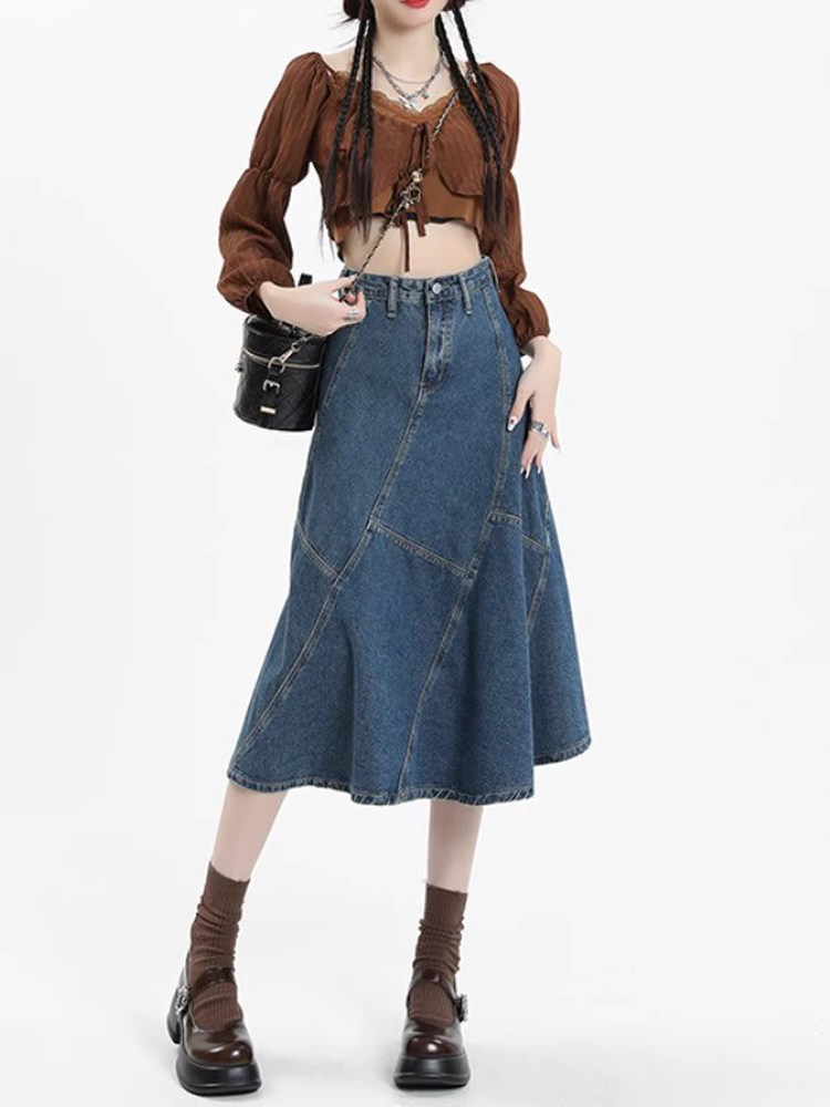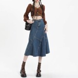 Ретро осенняя длинная приталенная джинсовая юбка, коллекция 2023, средней длины, с акцентом на бедрах, рыбий хвост
