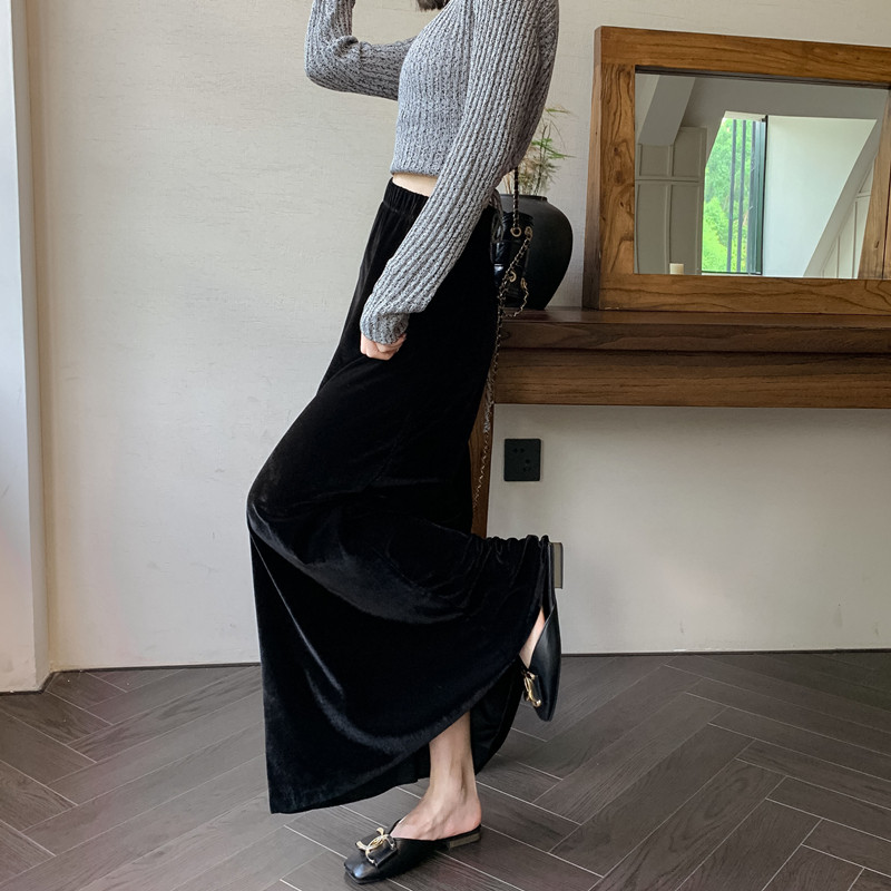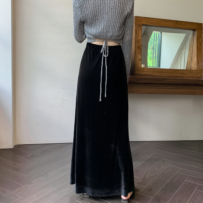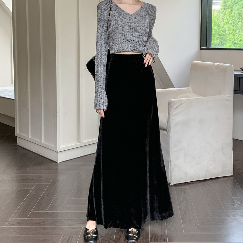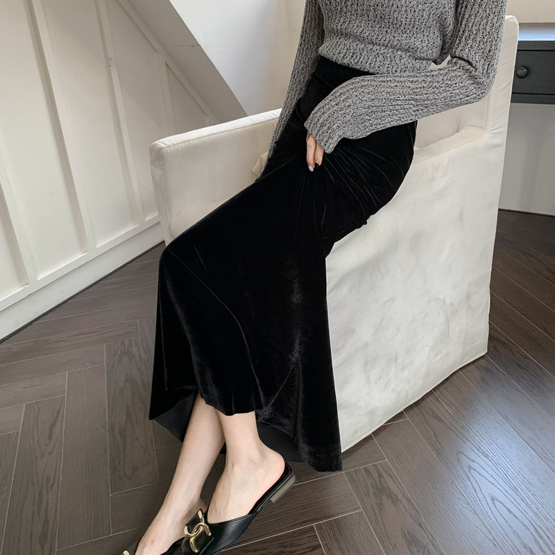 Черная бархатная осенняя длинная юбка, высокая талия, рыбий хвост, с акцентом на бедрах, средней длины
