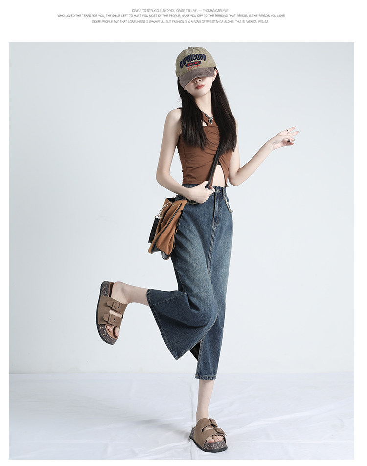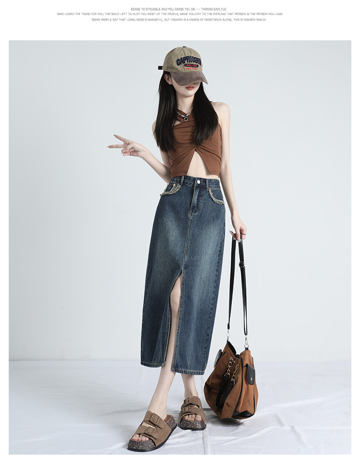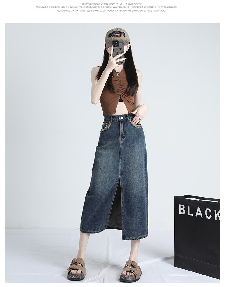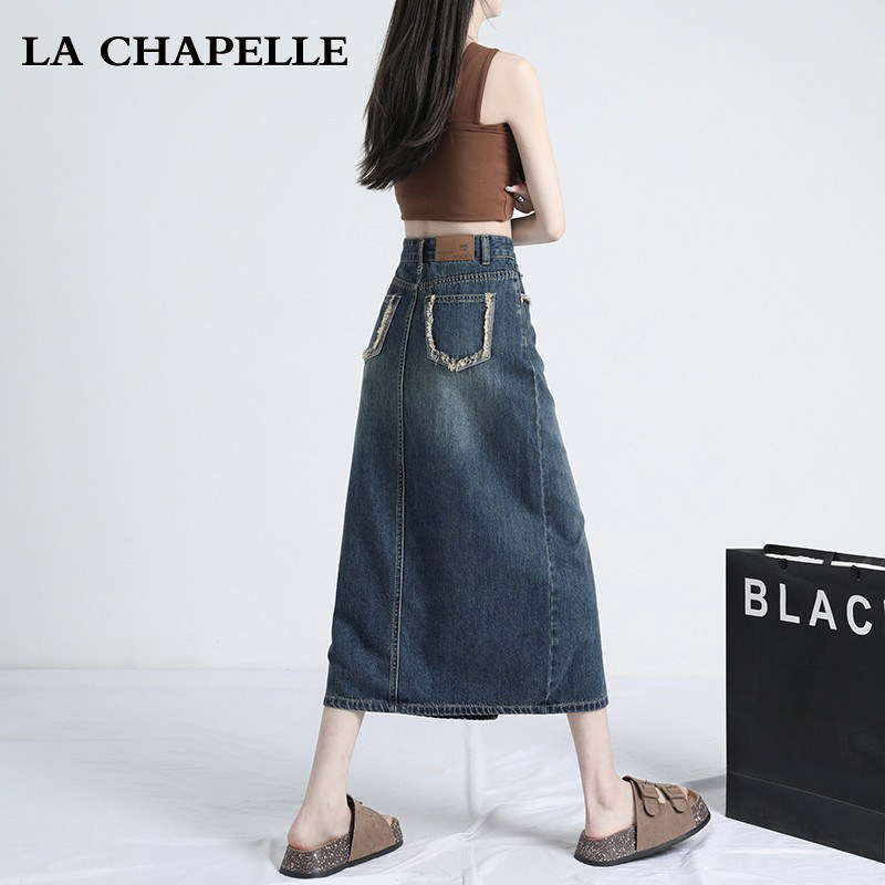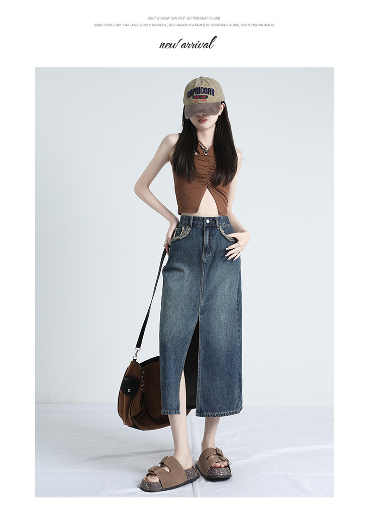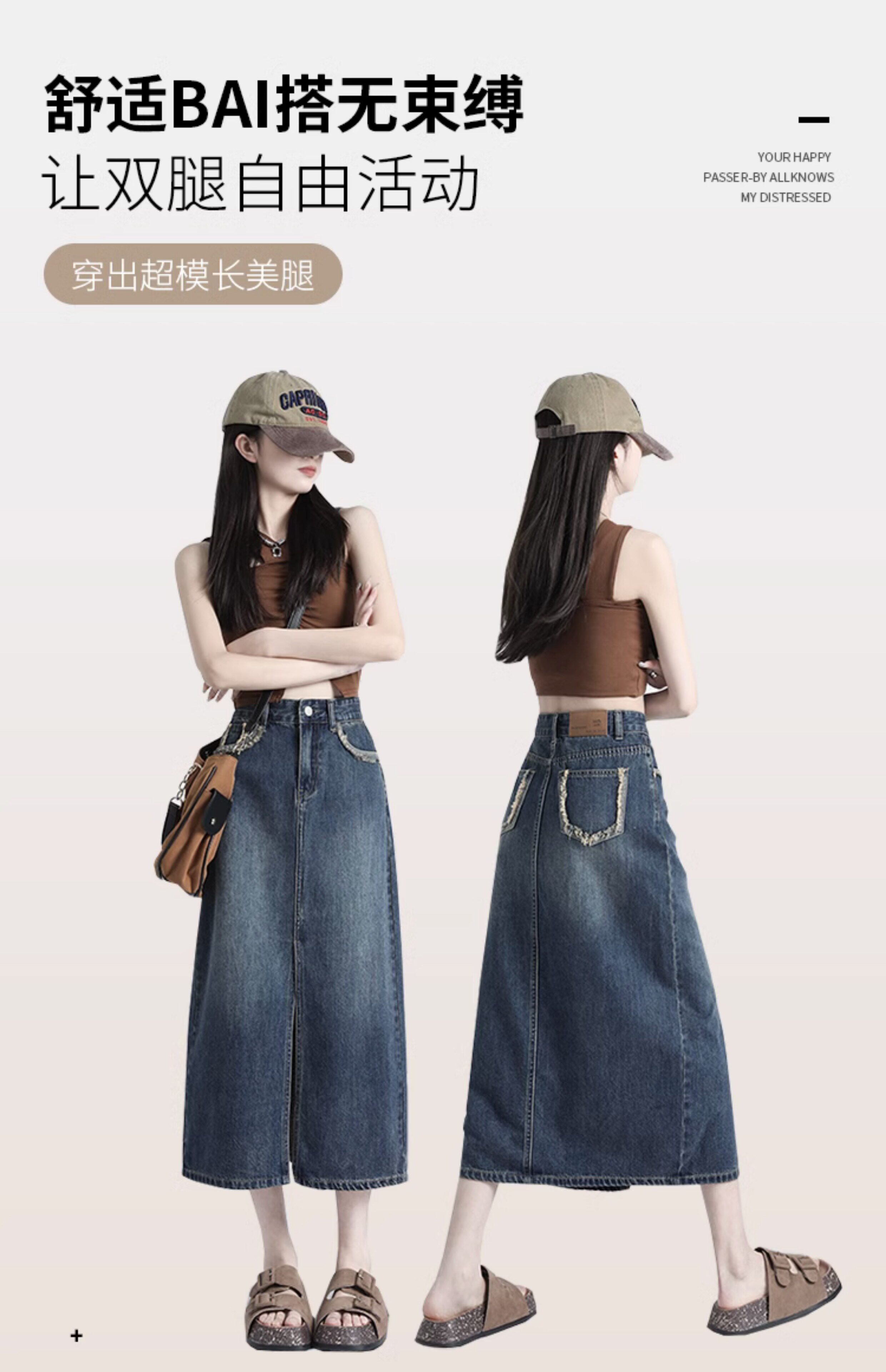 Ретро осенняя джинсовая юбка, дизайнерская длинная юбка, высокая талия, тренд сезона, с акцентом на бедрах, средней длины