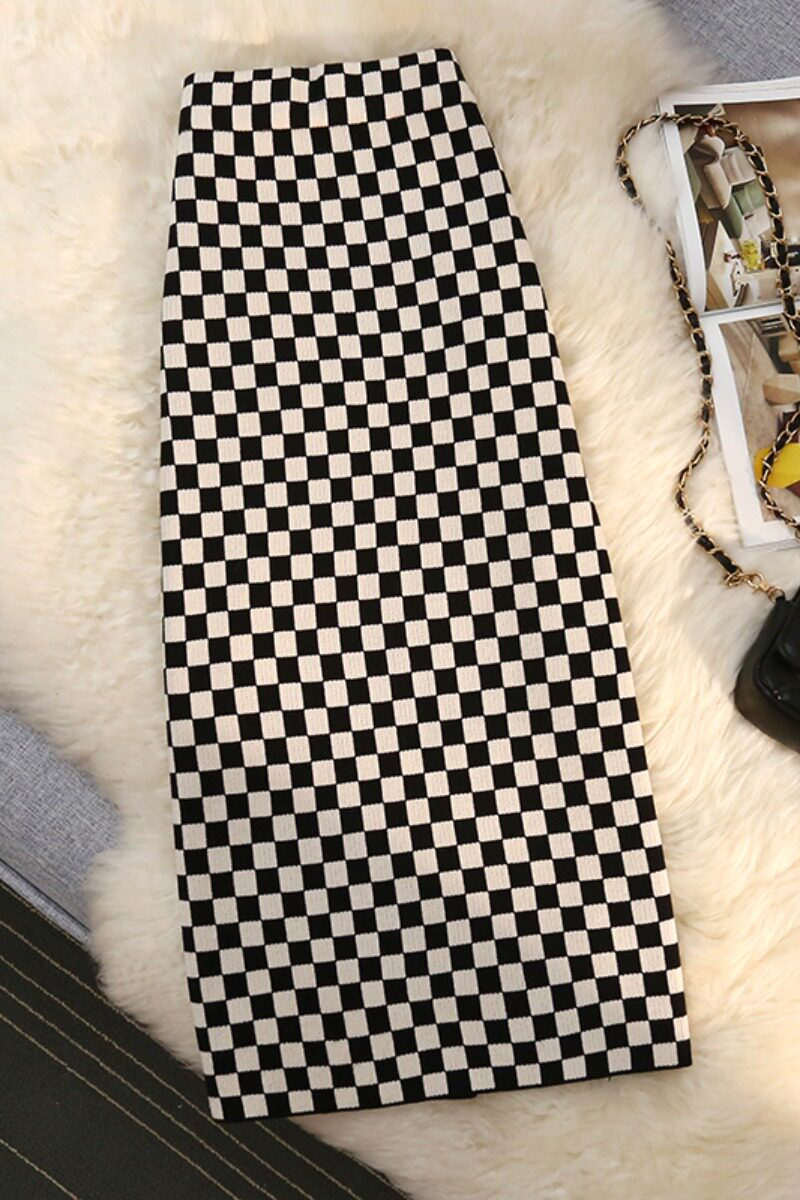 Шахматы, трикотажная осенняя длинная приталенная юбка, средней длины, высокая талия, с акцентом на бедрах, А-силуэт