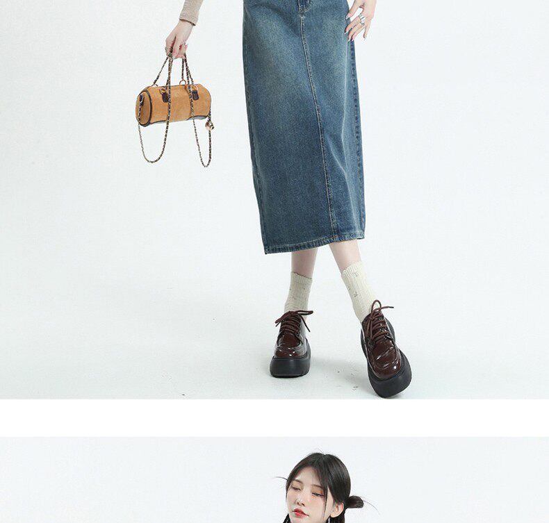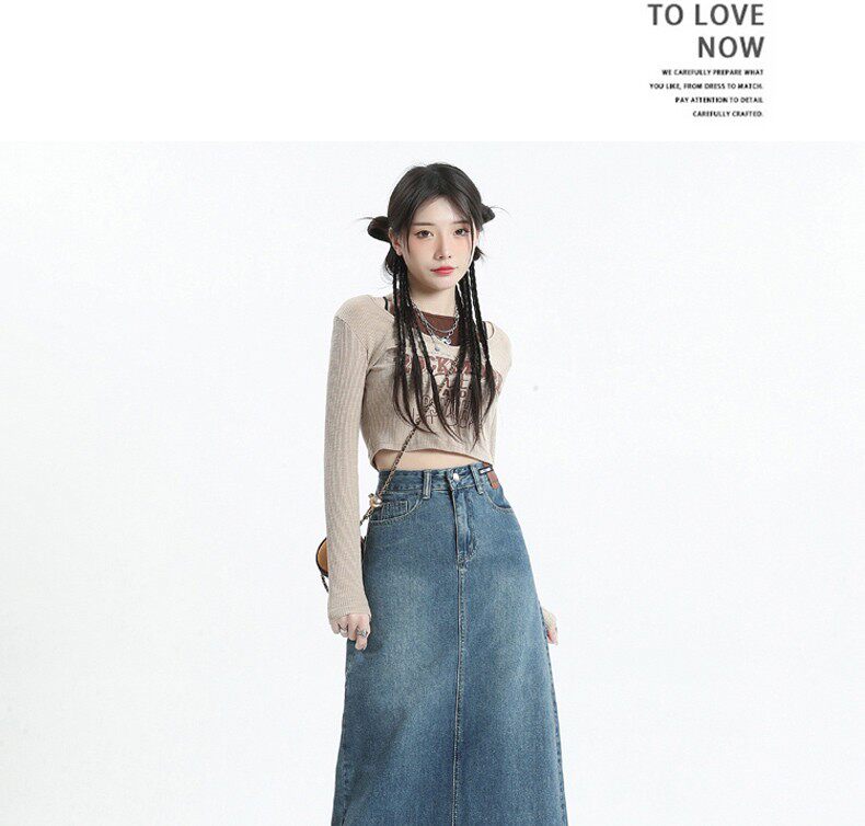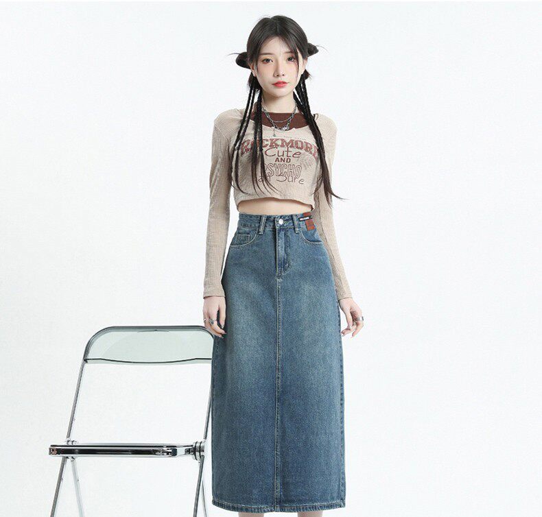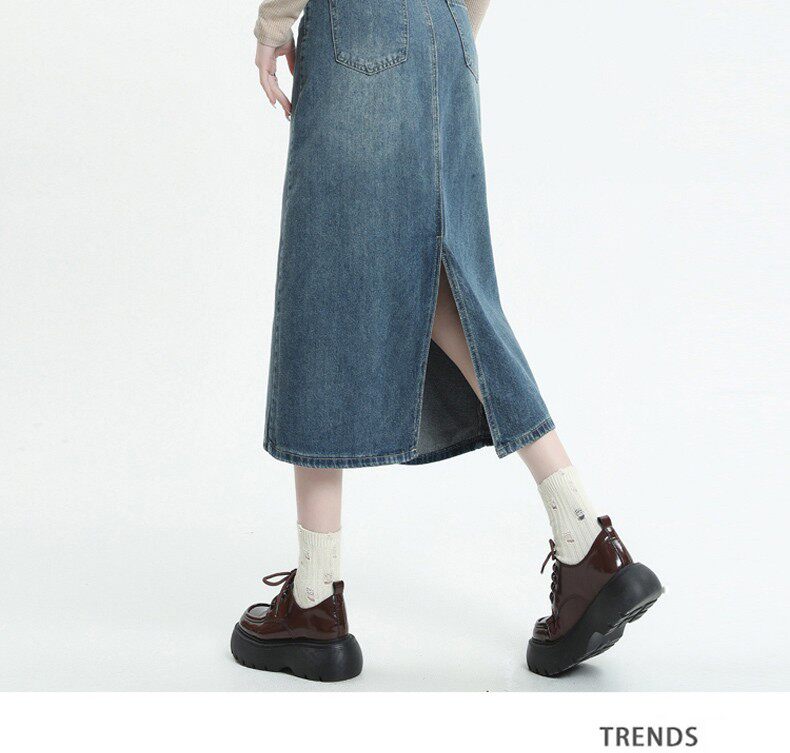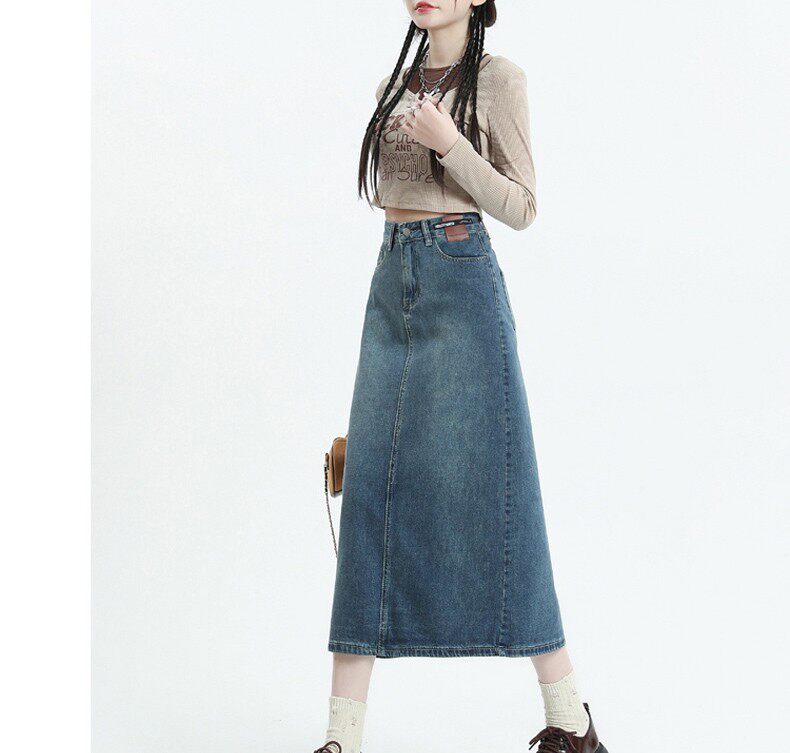 Осенняя ретро джинсовая юбка, длинная юбка, большой размер, А-силуэт, с акцентом на бедрах, средней длины