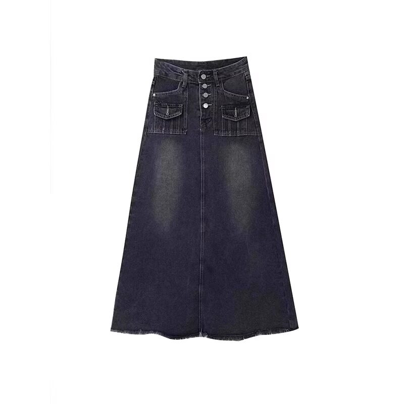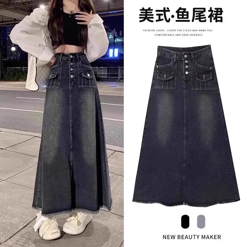 Длинная джинсовая юбка, высокая талия, средней длины, большой размер, подходит для полных девушек, А-силуэт, свободный крой, для формы тела «груша»