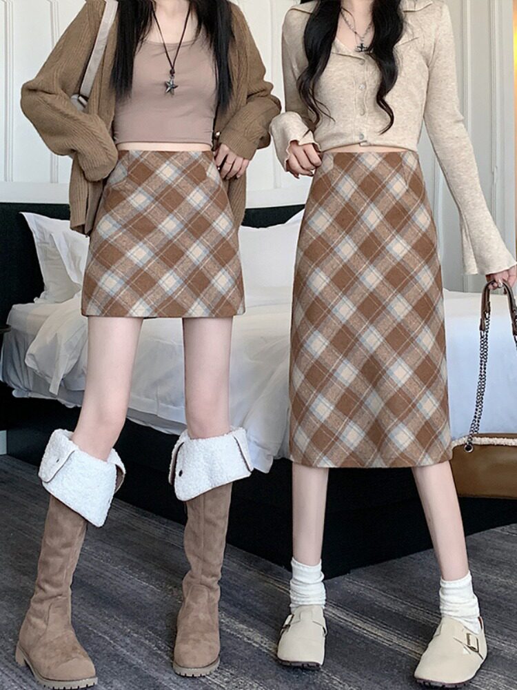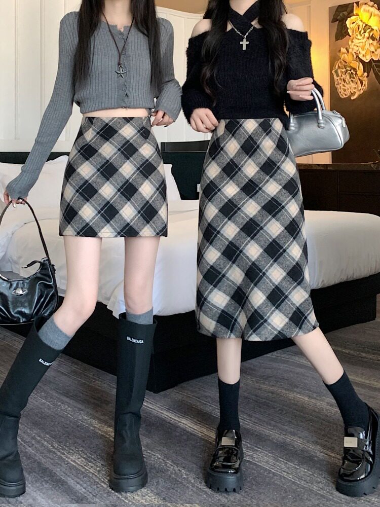 Шерстяная клетчатая демисезонная приталенная длинная юбка, высокая талия